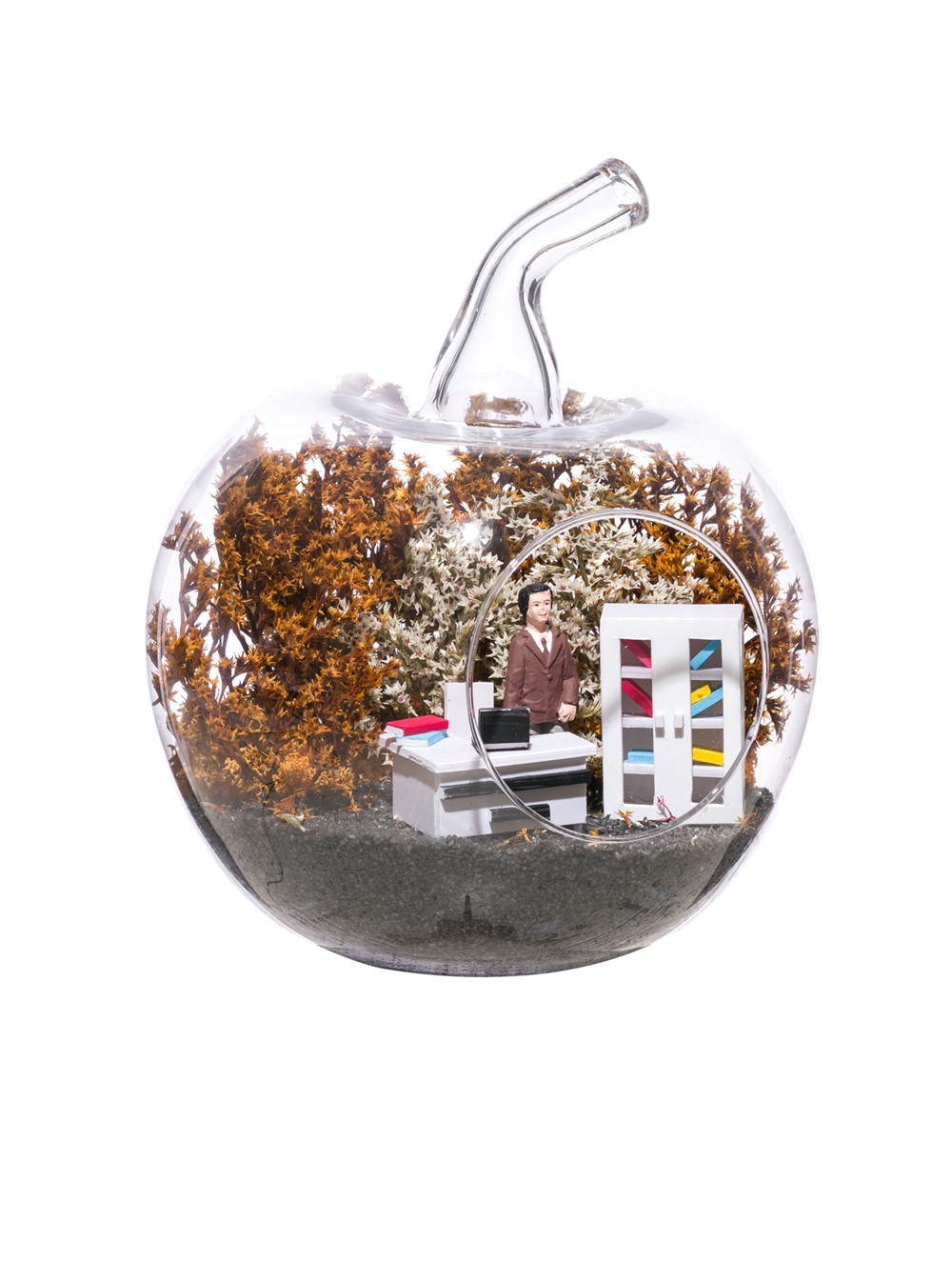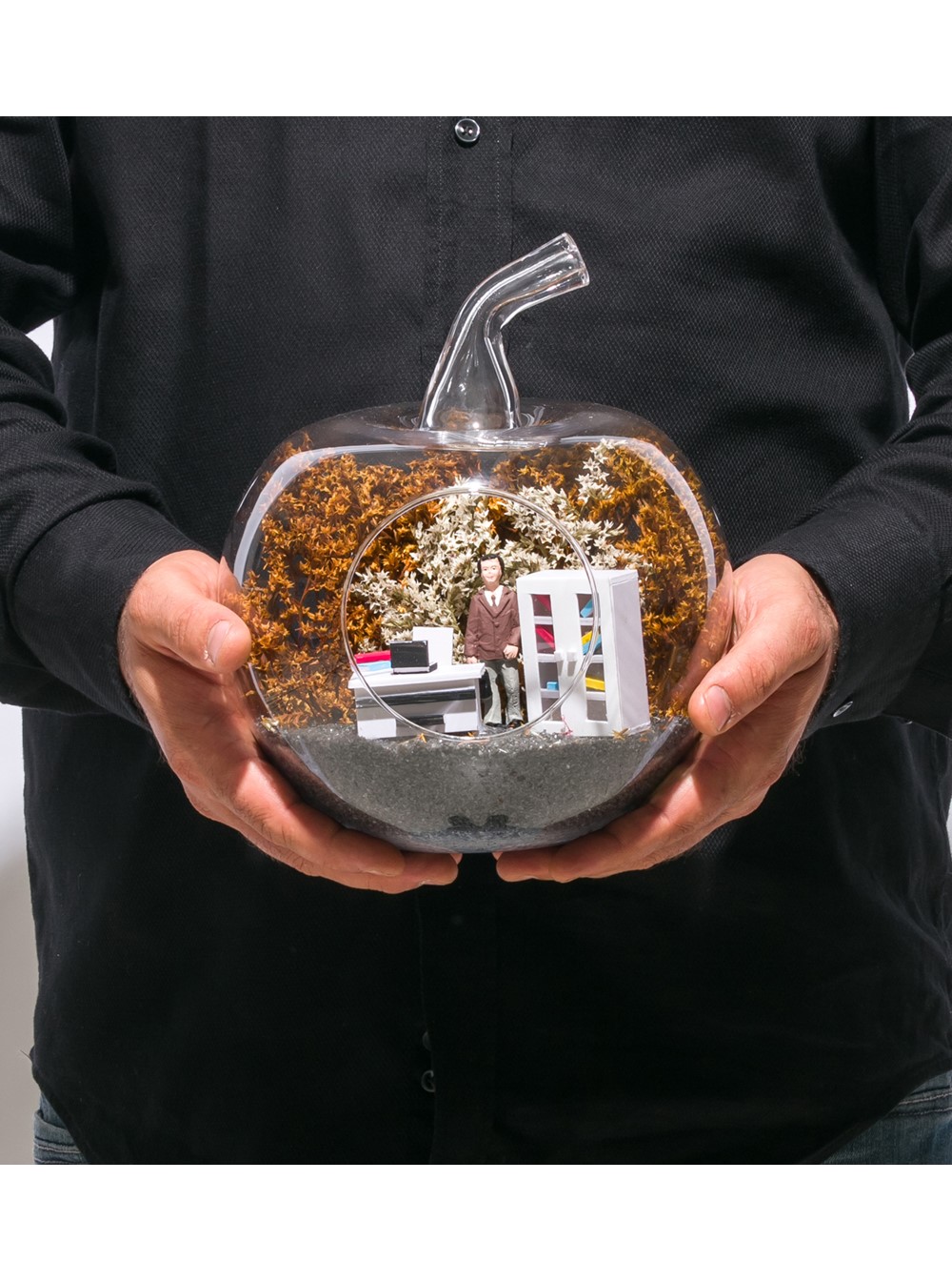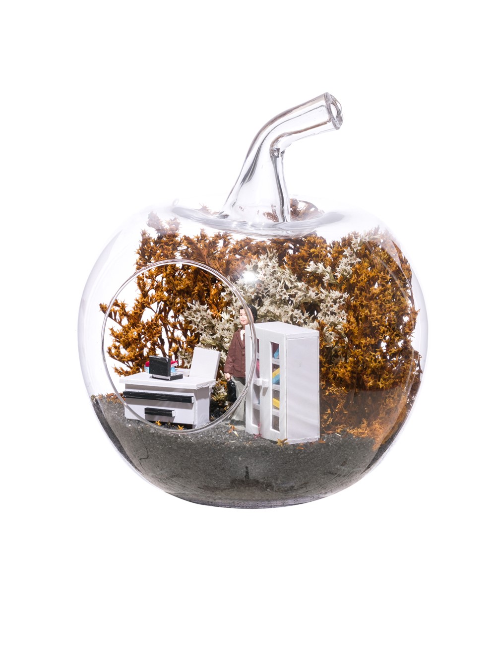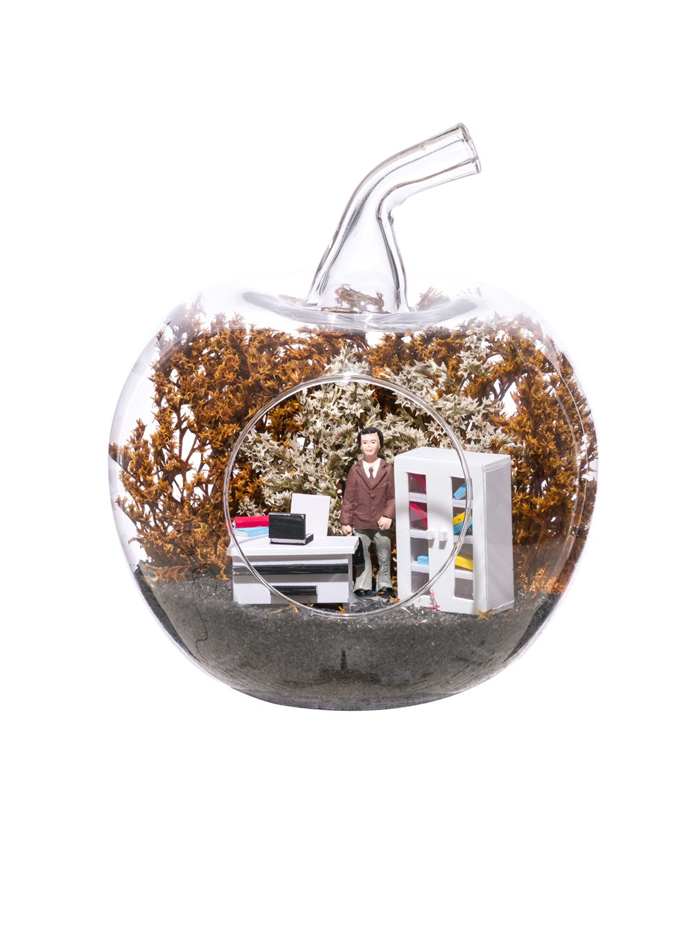 Küçük boy elma cam fanus içerisinde tasarladığımız bu güzel teraryum; beyaz kum, şoklanmış yosunlar, kurutulmuş bitkiler, bir adet el yapımı beyaz ofis görseli ve bir adet erkek görseli kullanılarak tamamlanmıştır. Ev ve ofis ortamlarının tamamında sergilenebilir teraryumun içinde, kurutulmuş ve şoklanmış bitkiler bulunduğundan hava alması önemlidir. Açık olan kısmının kapatılmaması veya büfe vb. kapalı alanlara konulmaması gereklidir. Özellikle her ortamda yıllarca, zevkle izlenebilecek özel bir teraryumdur. Yaklaşık Ölçüleri: 20x20cm NOT: Teraryumlarda kullanılan camlar, üfleme cam işçiliğiyle üretildiğinden bazı detaylarda farklılıklar gözlenebilir. Örneğin, sap kısmı ve ağız bitiş noktalarının her biri kendine özgüdür.