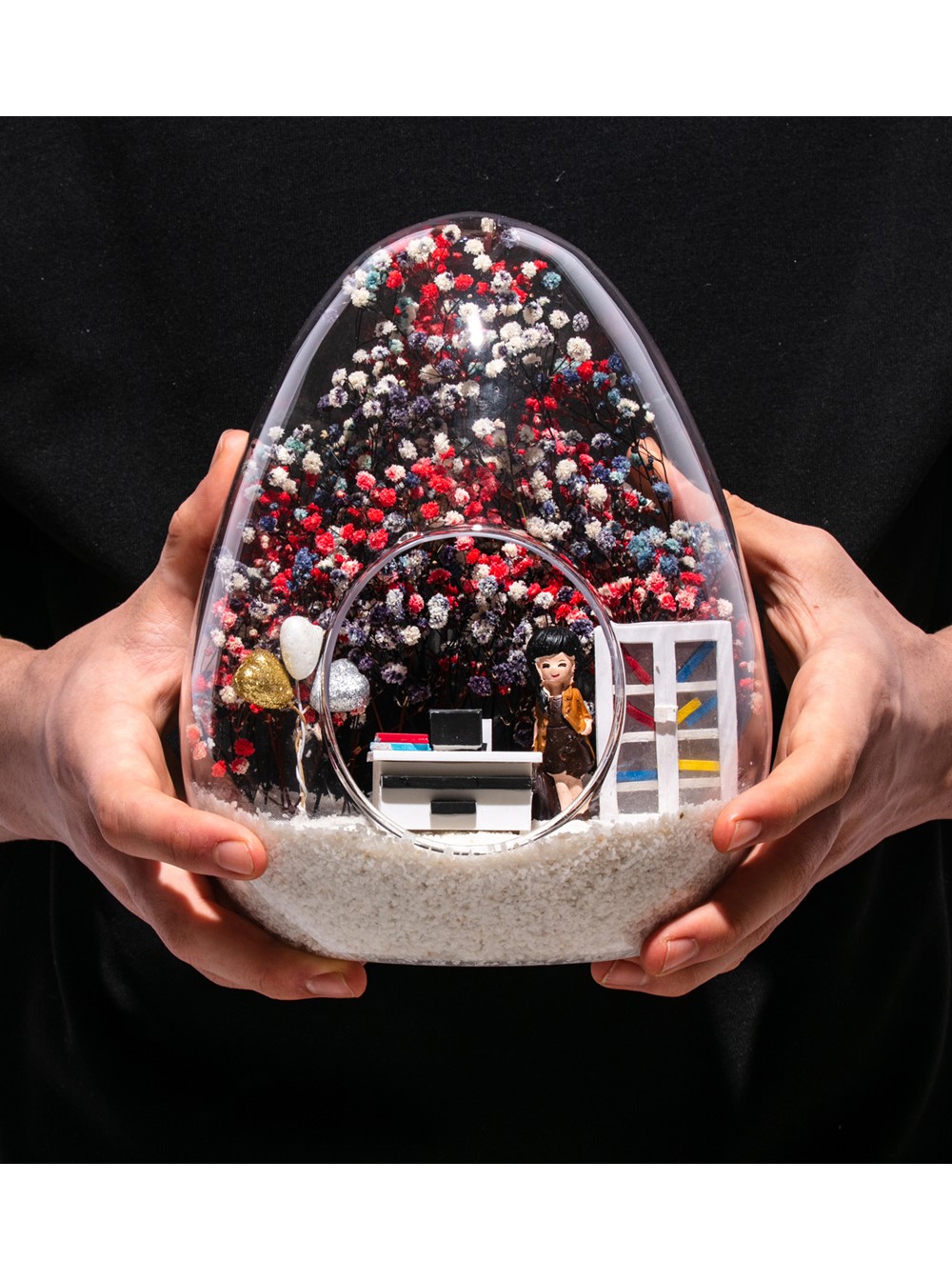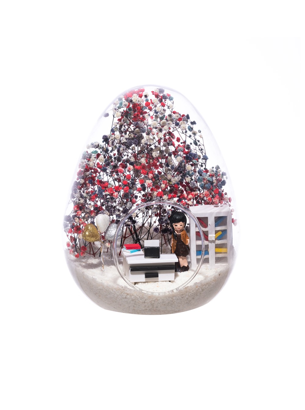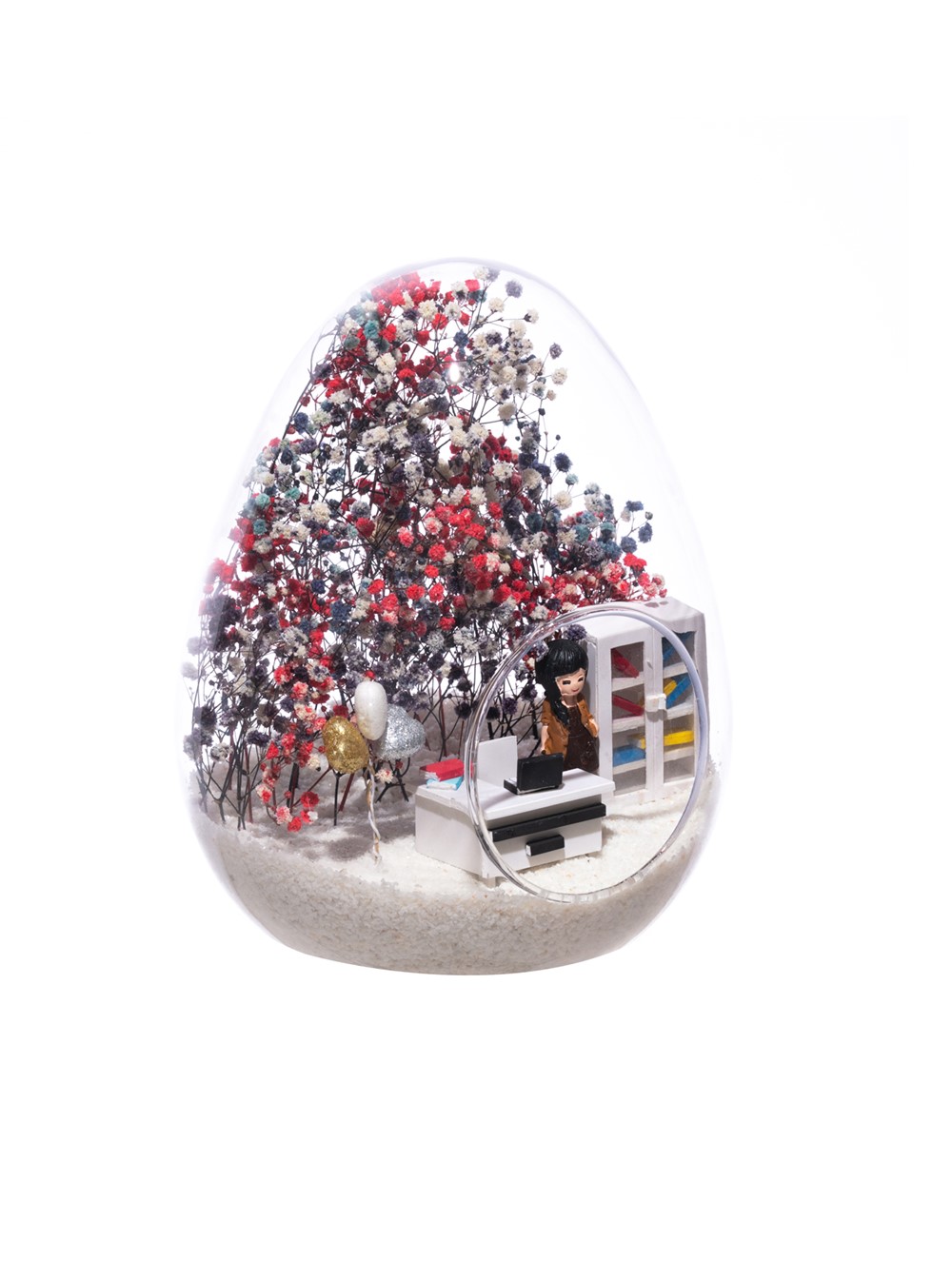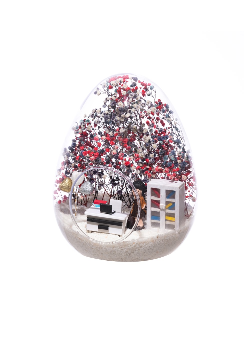 Küçük boy yumurta cam fanus içerisinde tasarladığımız, bu özgün teraryum; beyaz kum, karışık renkli kurutulmuş bitkiler, renkli simli kalpler, bir adet ofis dolabı, bir adet üzerinde bilgisayarıyla ofis masası ve sandalyesinin yanında duran, karamel elbiseli esmer iş kadını görseli kullanılarak tamamlanmıştır.. Ev ve ofis ortamlarının tamamında sergilenebilir teraryumun içinde, kurutulmuş bitkiler olduğundan hava alması önemlidir. Açık olan kısmının kapatılmaması veya büfe vb. kapalı alanlara konulmaması gereklidir. Özellikle her ortamda yıllarca, zevkle izlenebilecek özel bir teraryumdur. Yaklaşık Ölçüleri: 18x22cm NOT: Teraryumlarda kullanılan camlar, üfleme cam işçiliğiyle üretildiğinden bazı detaylarda farklılıklar gözlenebilir. Örneğin, ağız bitiş noktalarının her biri kendine özgüdür.