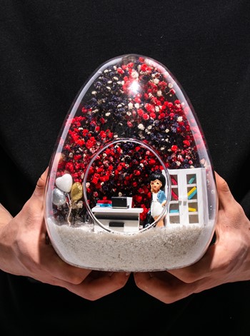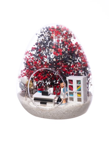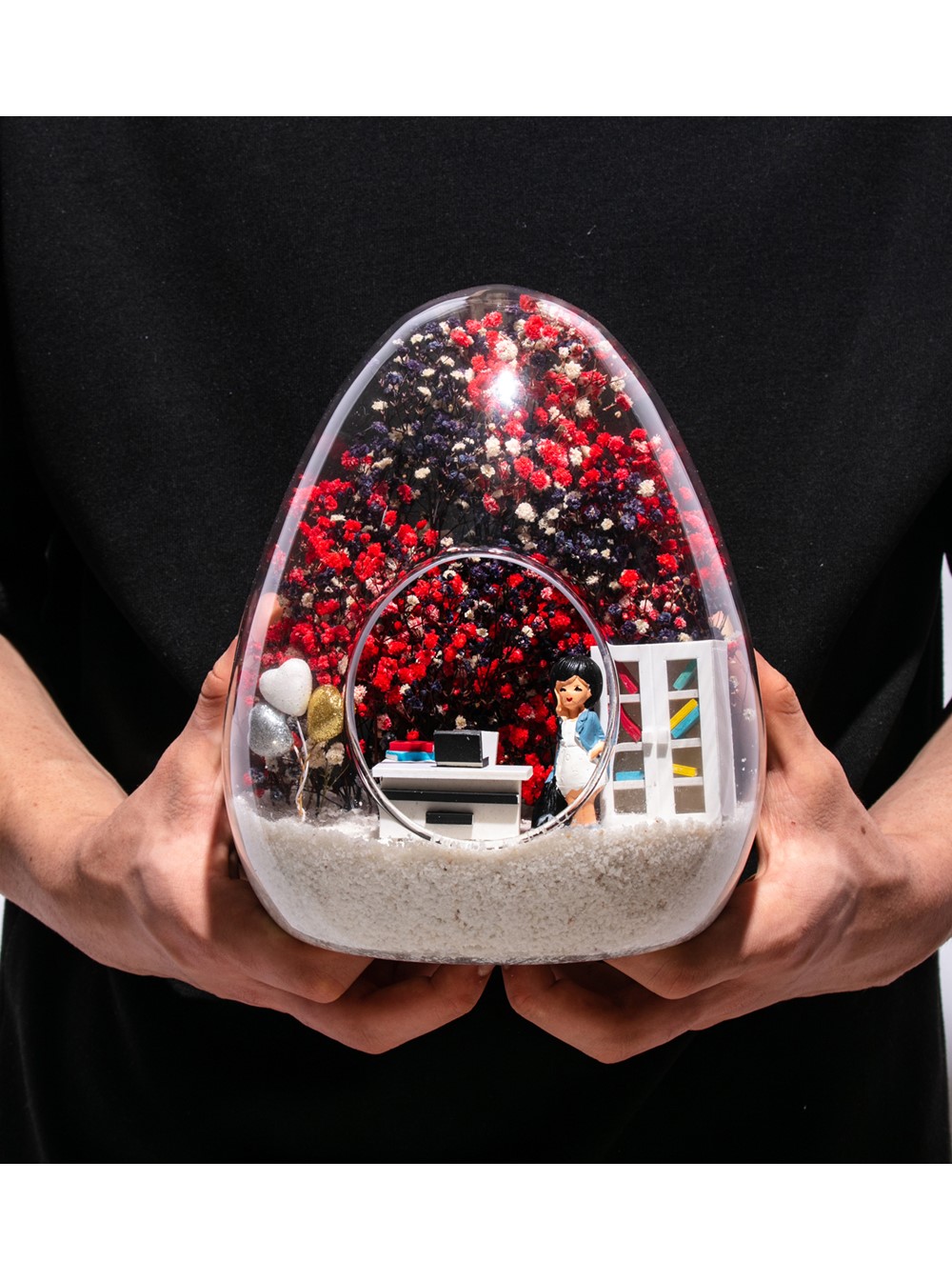 Küçük boy yumurta cam fanus içerisinde tasarladığımız, bu özgün teraryum; beyaz kum, karışık renkli kurutulmuş bitkiler, renkli simli kalpler, bir adet ofis dolabı, bir adet üzerinde bilgisayarıyla ofis masası ve sandalyesinin yanında duran, mavi elbiseli esmer iş kadını görseli kullanılarak tamamlanmıştır.. Ev ve ofis ortamlarının tamamında sergilenebilir teraryumun içinde, kurutulmuş bitkiler olduğundan hava alması önemlidir. Açık olan kısmının kapatılmaması veya büfe vb. kapalı alanlara konulmaması gereklidir. Özellikle her ortamda yıllarca, zevkle izlenebilecek özel bir teraryumdur. Yaklaşık Ölçüleri: 18x22cm NOT: Teraryumlarda kullanılan camlar, üfleme cam işçiliğiyle üretildiğinden bazı detaylarda farklılıklar gözlenebilir. Örneğin, ağız bitiş noktalarının her biri kendine özgüdür.