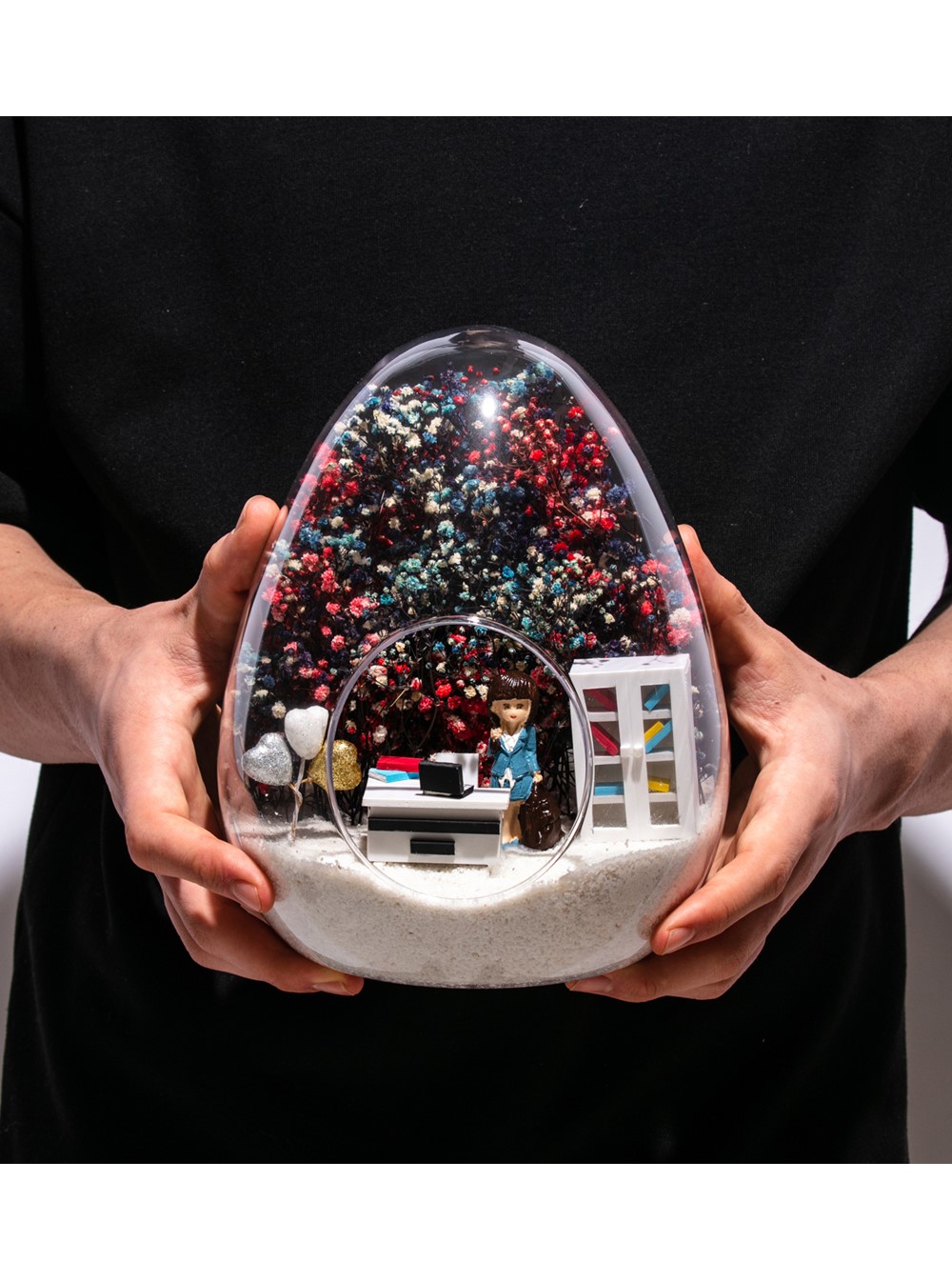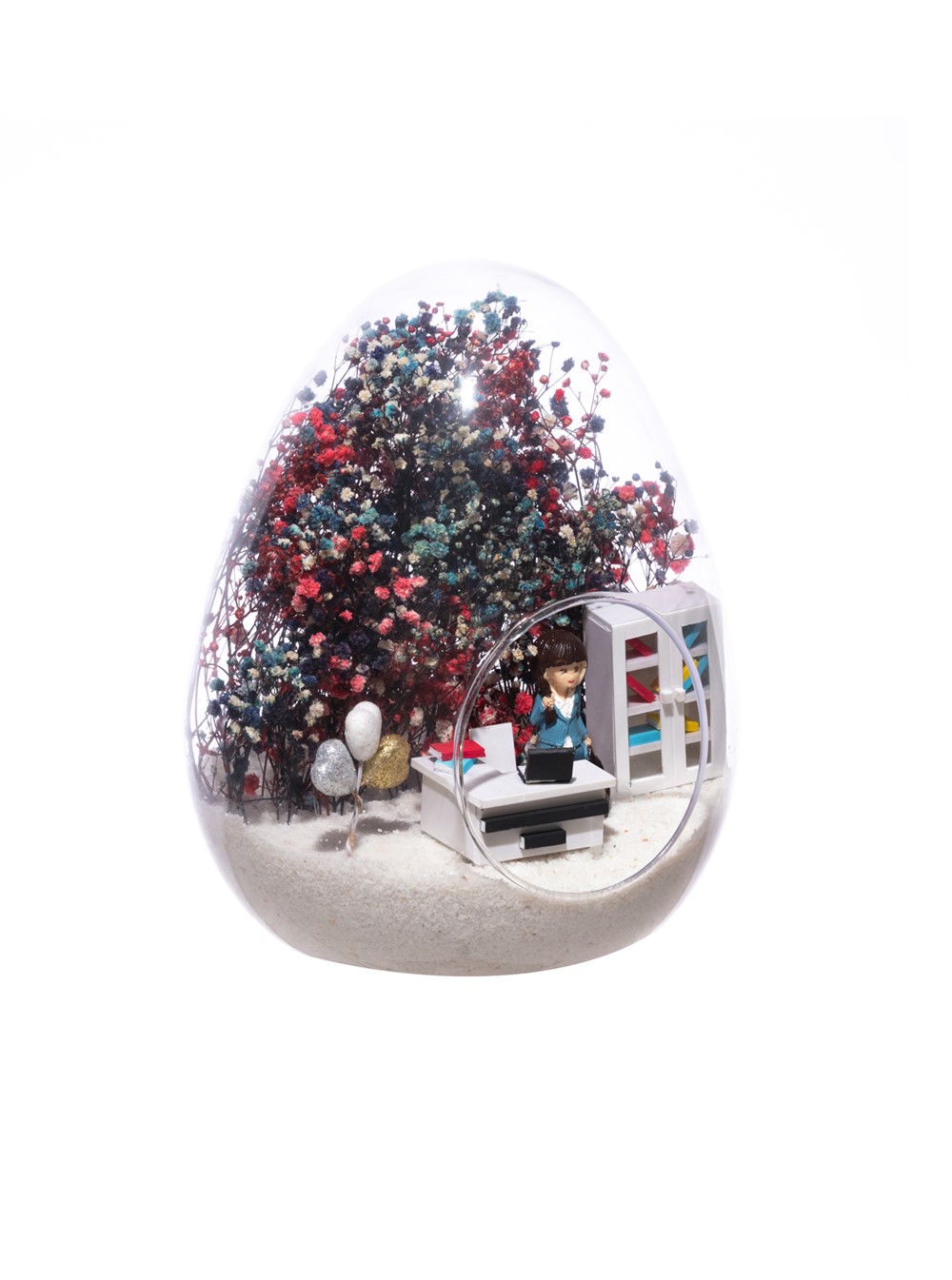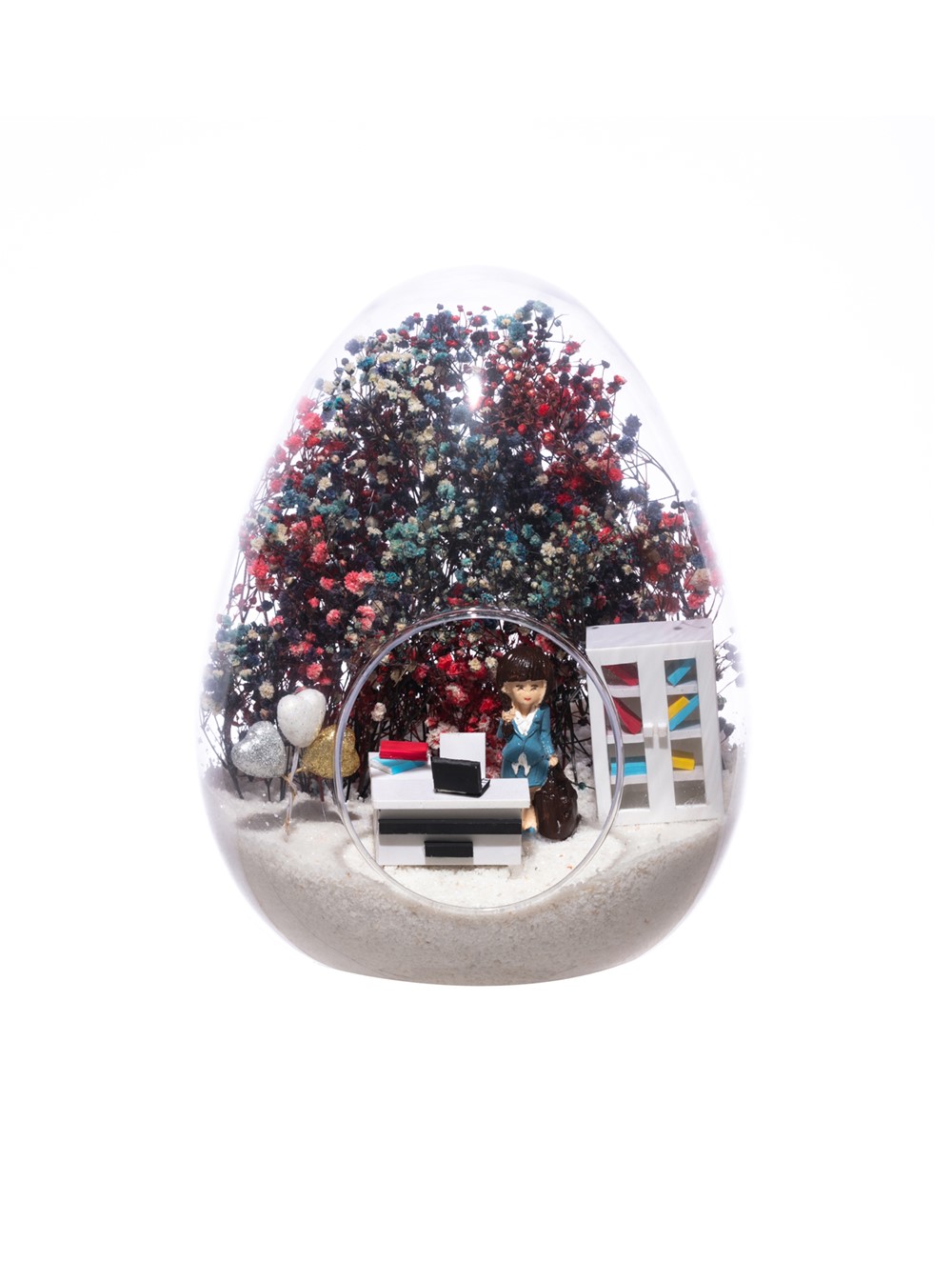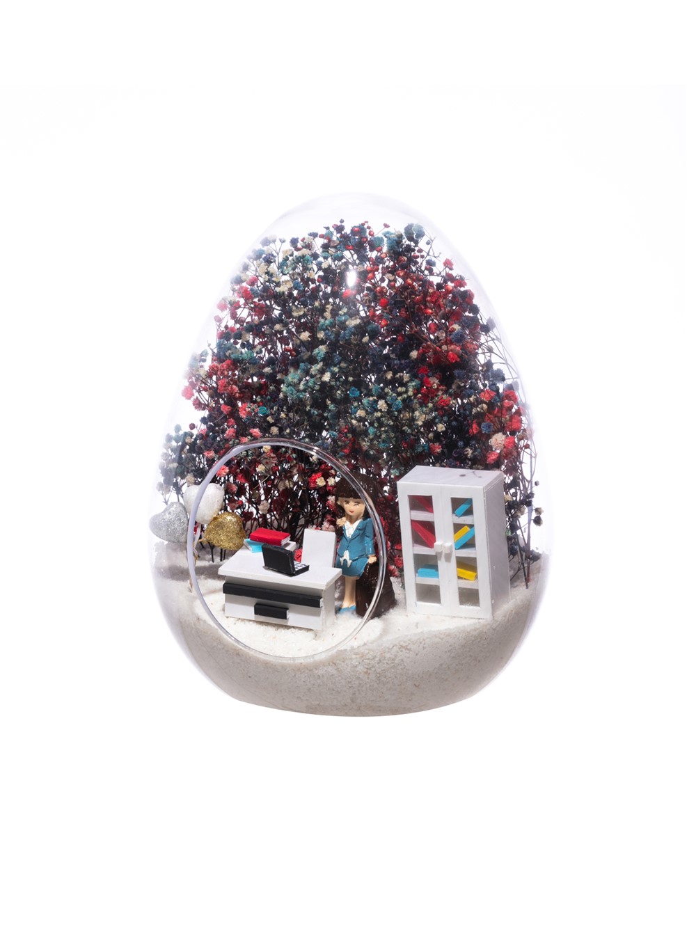 Küçük boy yumurta cam fanus içerisinde tasarladığımız, bu özgün teraryum; beyaz kum, karışık renkli kurutulmuş bitkiler, renkli simli kalpler, bir adet ofis dolabı, bir adet üzerinde bilgisayarıyla ofis masası ve sandalyesinin yanında duran, mavi elbiseli kumral iş kadını görseli kullanılarak tamamlanmıştır.. Ev ve ofis ortamlarının tamamında sergilenebilir teraryumun içinde, kurutulmuş bitkiler olduğundan hava alması önemlidir. Açık olan kısmının kapatılmaması veya büfe vb. kapalı alanlara konulmaması gereklidir. Özellikle her ortamda yıllarca, zevkle izlenebilecek özel bir teraryumdur. Yaklaşık Ölçüleri: 18x22cm NOT: Teraryumlarda kullanılan camlar, üfleme cam işçiliğiyle üretildiğinden bazı detaylarda farklılıklar gözlenebilir. Örneğin, ağız bitiş noktalarının her biri kendine özgüdür.