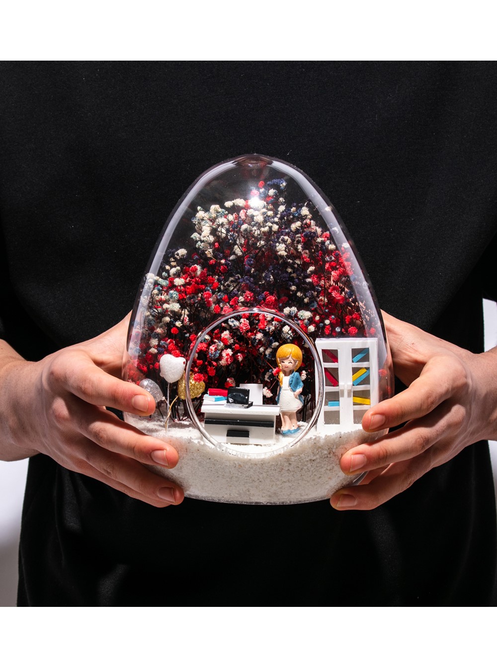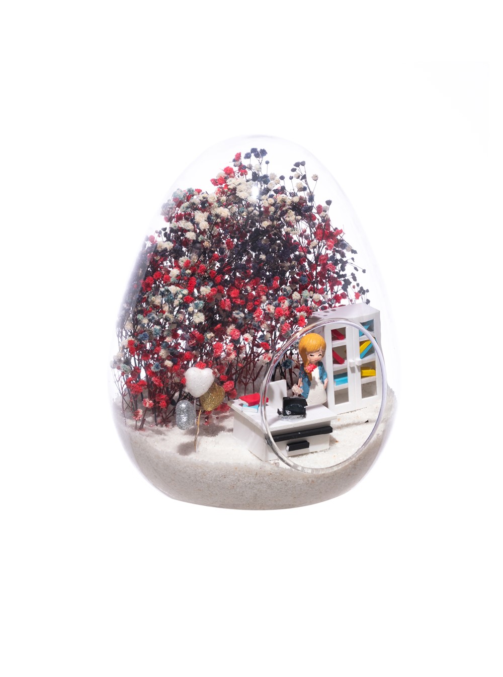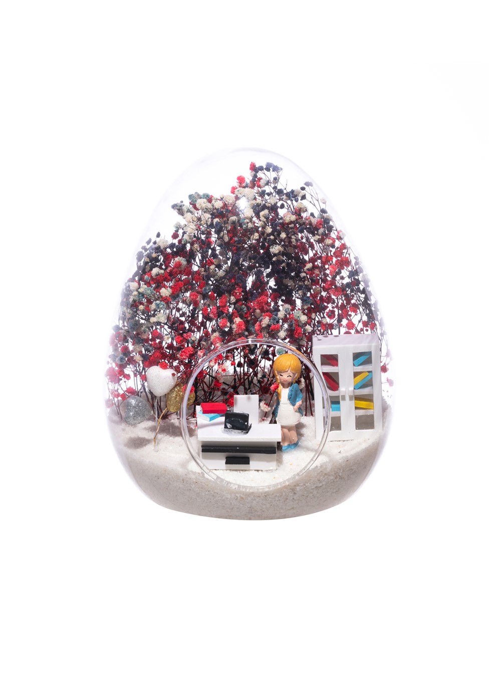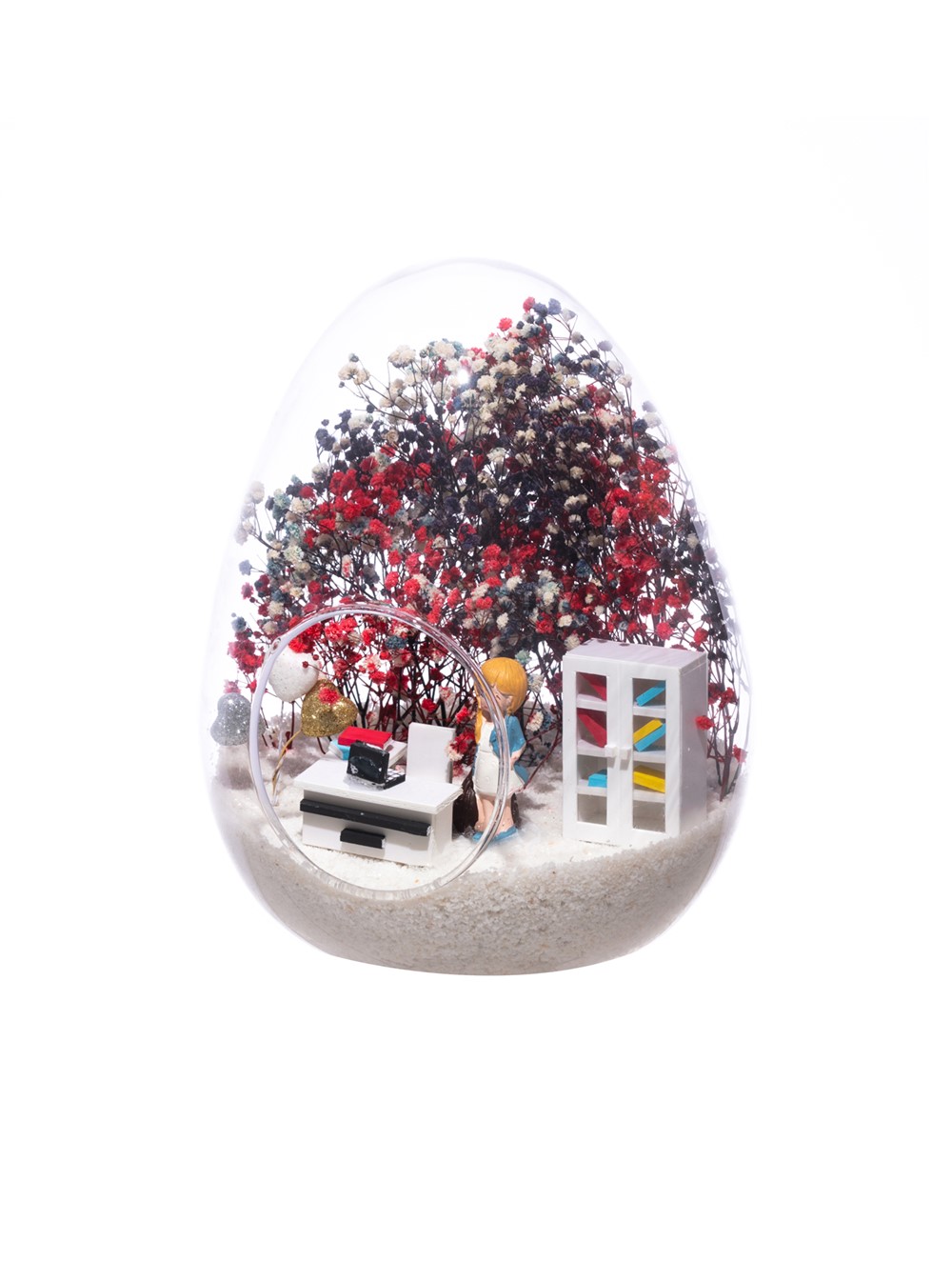 Küçük boy yumurta cam fanus içerisinde tasarladığımız, bu özgün teraryum; beyaz kum, karışık renkli kurutulmuş bitkiler, renkli simli kalpler, bir adet ofis dolabı, bir adet üzerinde bilgisayarıyla ofis masası ve sandalyesinin yanında duran, mavi elbiseli sarışın iş kadını görseli kullanılarak tamamlanmıştır.. Ev ve ofis ortamlarının tamamında sergilenebilir teraryumun içinde, kurutulmuş bitkiler olduğundan hava alması önemlidir. Açık olan kısmının kapatılmaması veya büfe vb. kapalı alanlara konulmaması gereklidir. Özellikle her ortamda yıllarca, zevkle izlenebilecek özel bir teraryumdur. Yaklaşık Ölçüleri: 18x22cm NOT: Teraryumlarda kullanılan camlar, üfleme cam işçiliğiyle üretildiğinden bazı detaylarda farklılıklar gözlenebilir. Örneğin, ağız bitiş noktalarının her biri kendine özgüdür.