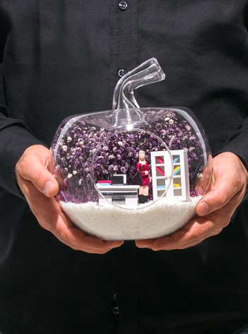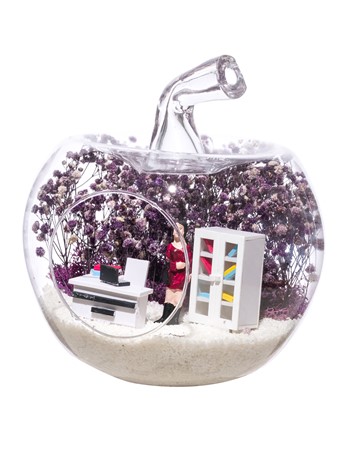 Küçük boy elma cam fanus içerisinde tasarladığımız bu çok güzel teraryum; beyaz kum, şoklanmış yosunlar, kurutulmuş bitkiler, bir adet el yapımı beyaz ofis görseli ve bir adet kadın görseli kullanılarak tamamlanmıştır. Ev ve ofis ortamlarının tamamında sergilenebilir teraryumun içinde, kurutulmuş ve şoklanmış bitkiler bulunduğundan hava alması önemlidir. Açık olan kısmının kapatılmaması veya büfe vb. kapalı alanlara konulmaması gereklidir. Özellikle her ortamda yıllarca, zevkle izlenebilecek özel bir teraryumdur. Yaklaşık Ölçüleri: 20x20cm NOT: Teraryumlarda kullanılan camlar, üfleme cam işçiliğiyle üretildiğinden bazı detaylarda farklılıklar gözlenebilir. Örneğin, sap kısmı ve ağız bitiş noktalarının her biri kendine özgüdür.