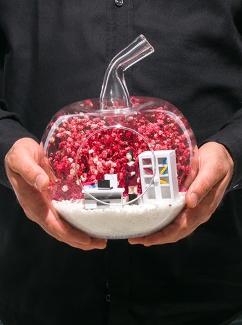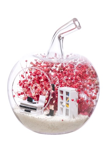 Küçük boy elma cam fanus içerisinde tasarladığımız bu çok güzel teraryum; beyaz kum, şoklanmış yosunlar, kurutulmuş bitkiler, bir adet el yapımı beyaz ofis görseli ve bir adet kadın görseli kullanılarak tamamlanmıştır. Ev ve ofis ortamlarının tamamında sergilenebilir teraryumun içinde, kurutulmuş ve şoklanmış bitkiler bulunduğundan hava alması önemlidir. Açık olan kısmının kapatılmaması veya büfe vb. kapalı alanlara konulmaması gereklidir. Özellikle her ortamda yıllarca, zevkle izlenebilecek özel bir teraryumdur. Yaklaşık Ölçüleri: 20x20cm NOT: Teraryumlarda kullanılan camlar, üfleme cam işçiliğiyle üretildiğinden bazı detaylarda farklılıklar gözlenebilir. Örneğin, sap kısmı ve ağız bitiş noktalarının her biri kendine özgüdür.
