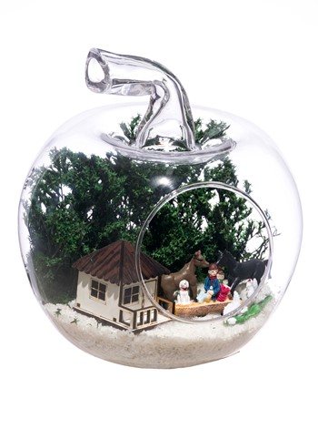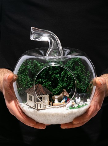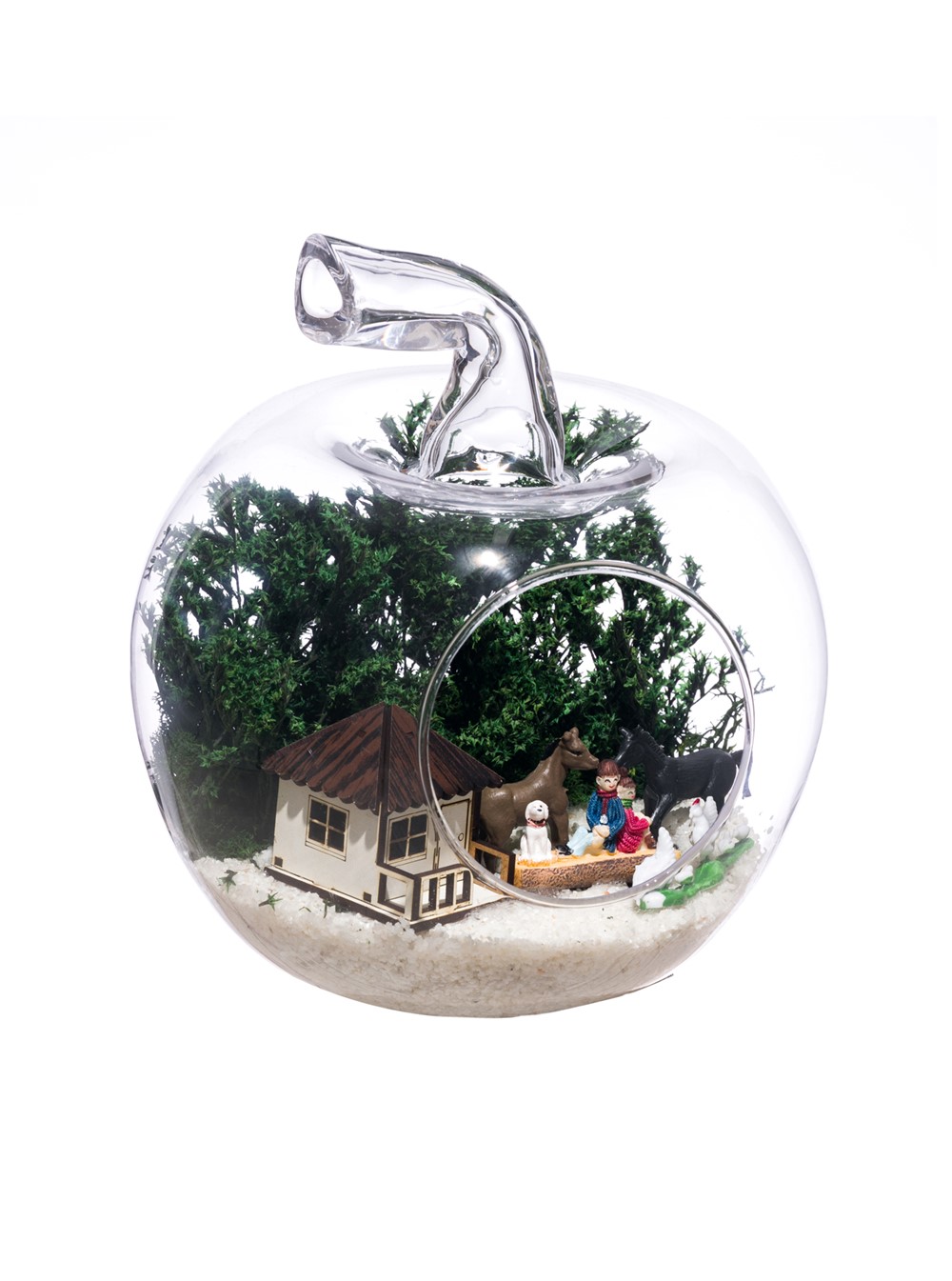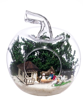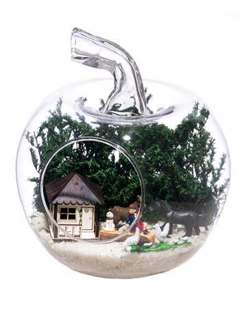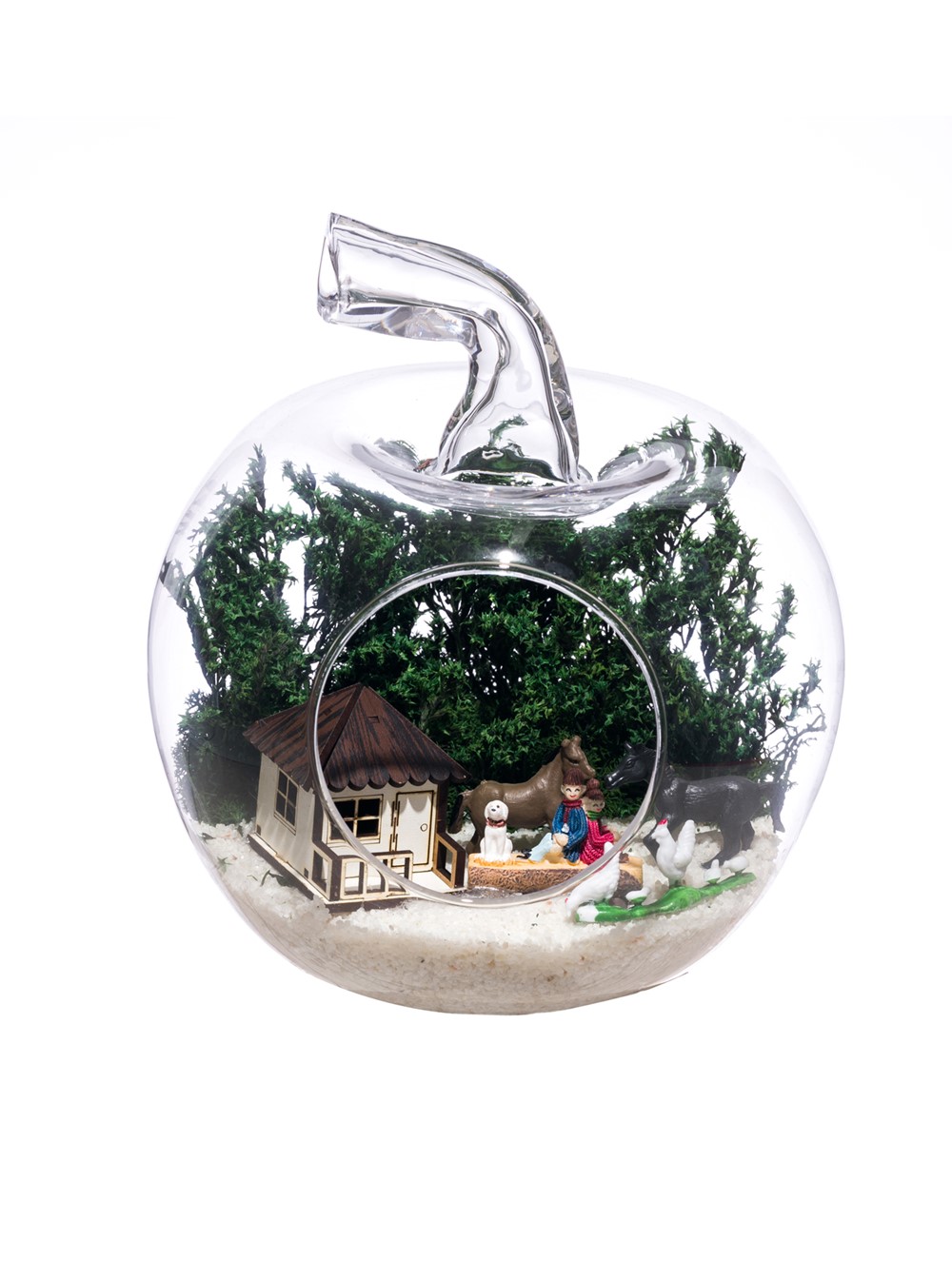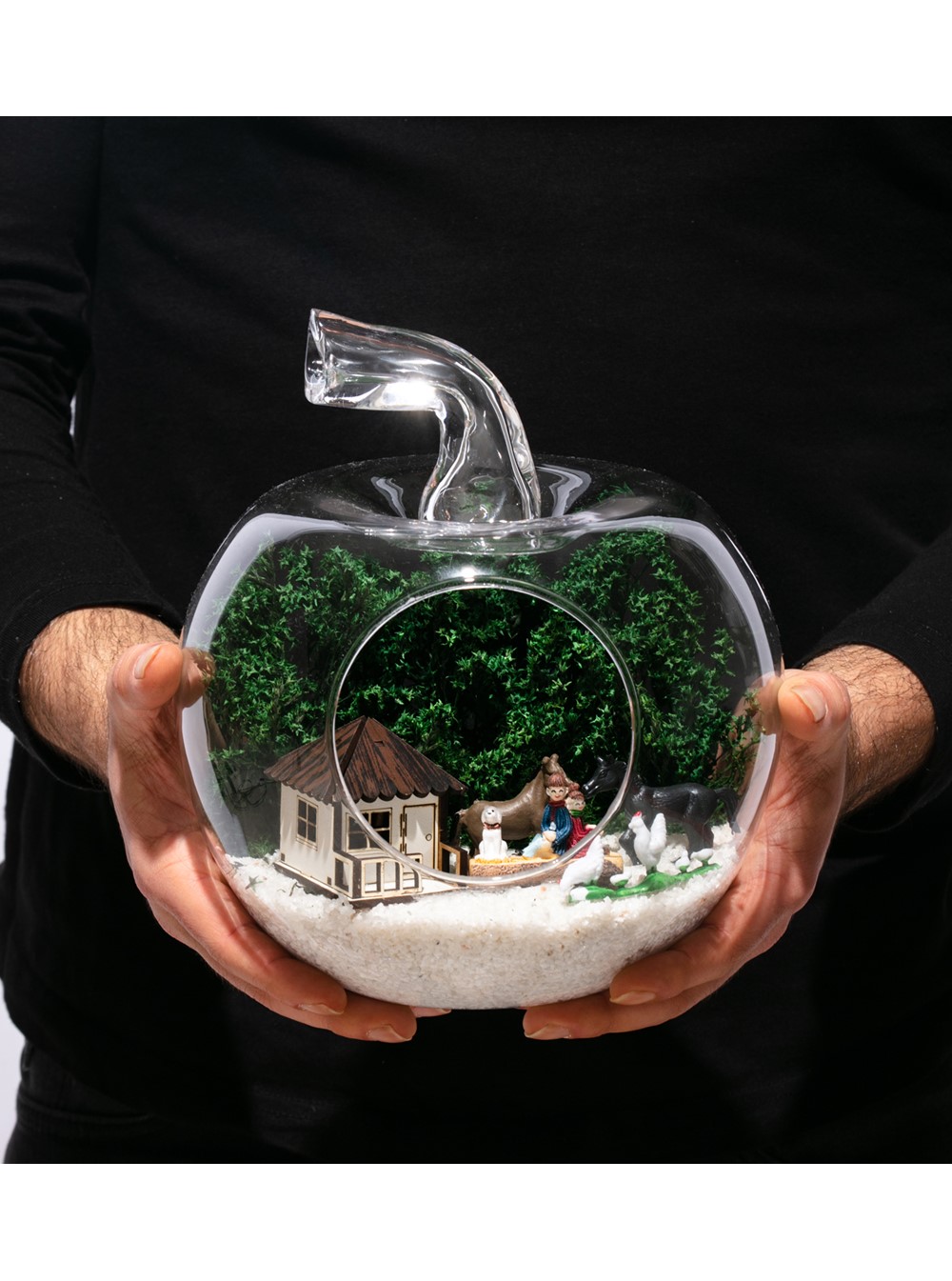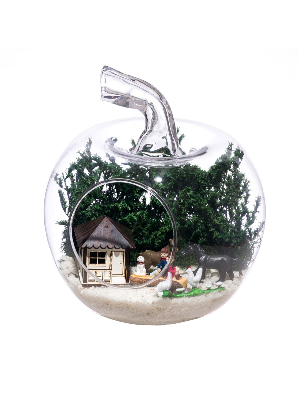 Küçük boy elma cam fanus içerisinde tasarladığımız bu teraryum; beyaz kum, şoklanmış yosunlar, kurutulmuş bitkiler, bir adet ahşap beyaz ev, çiftlik hayvanlarını simgeleyen objeler ve bahçelerindeki bankta köpekleriyle oturmuş sohbet eden aşıkları simgeleyen objelerle tamamlanmıştır. Ev ve ofis ortamlarının tamamında sergilenebilir teraryumun içinde, kurutulmuş ve şoklanmış bitkiler bulunduğundan hava alması önemlidir. Açık olan kısmının kapatılmaması veya büfe vb. kapalı alanlara konulmaması gereklidir. Özellikle her ortamda yıllarca, zevkle izlenebilecek özel bir teraryumdur. Yaklaşık Ölçüleri: 20x20cm NOT: Teraryumlarda kullanılan camlar, üfleme cam işçiliğiyle üretildiğinden bazı detaylarda farklılıklar gözlenebilir. Örneğin, sap kısmı ve ağız bitiş noktalarının her biri kendine özgüdür.