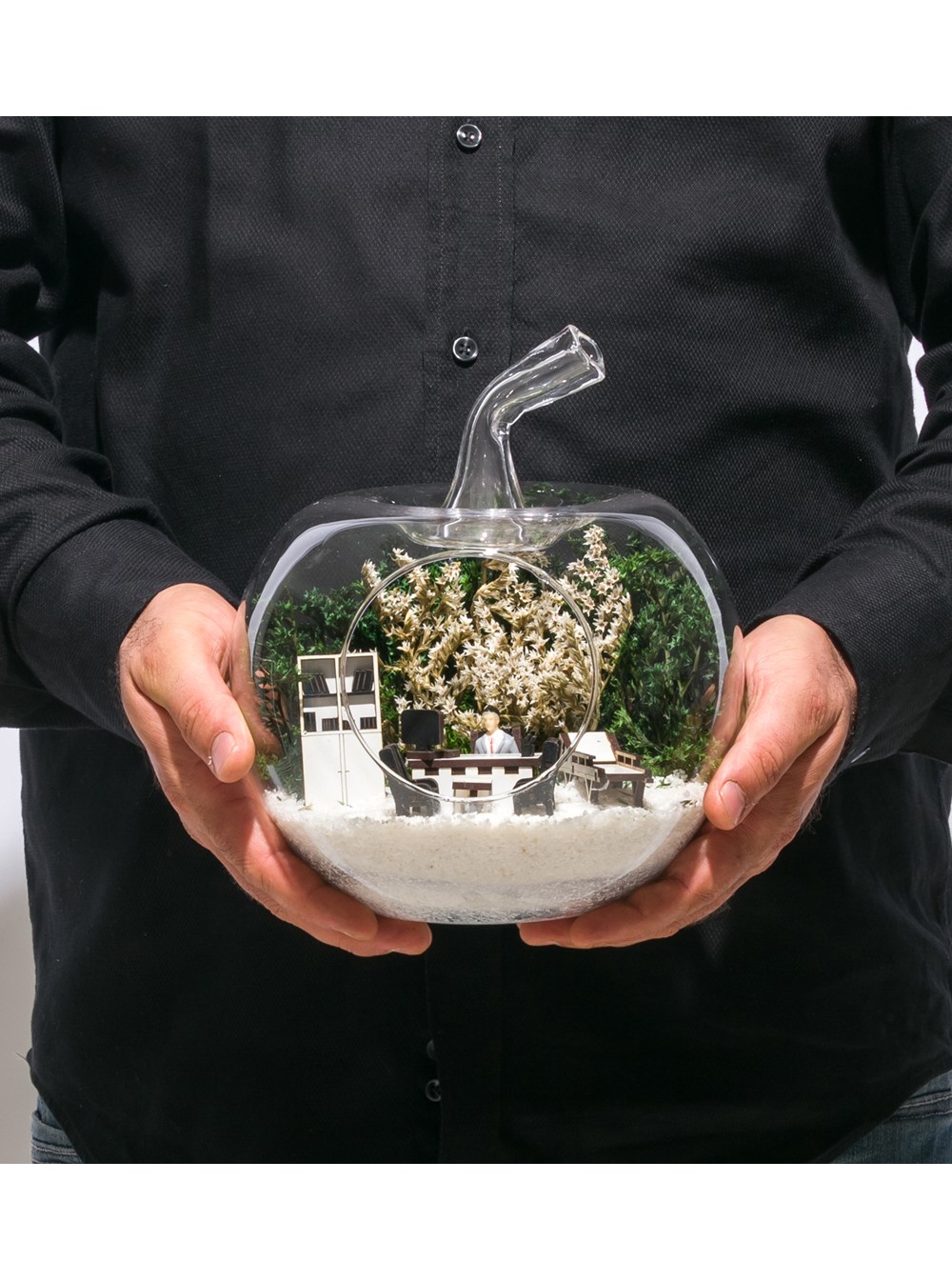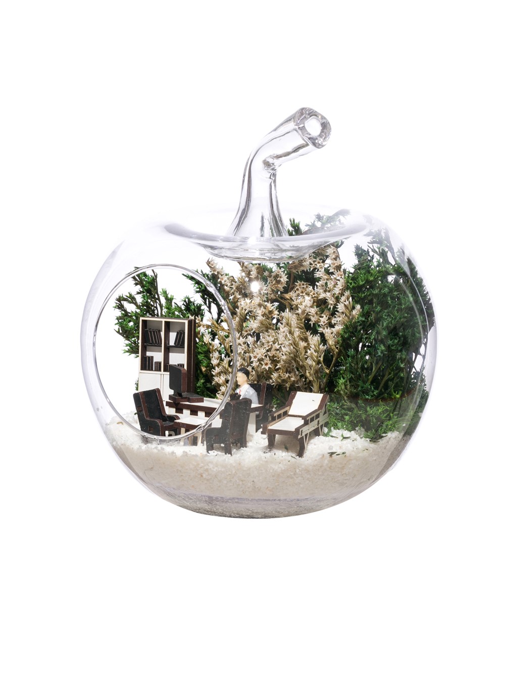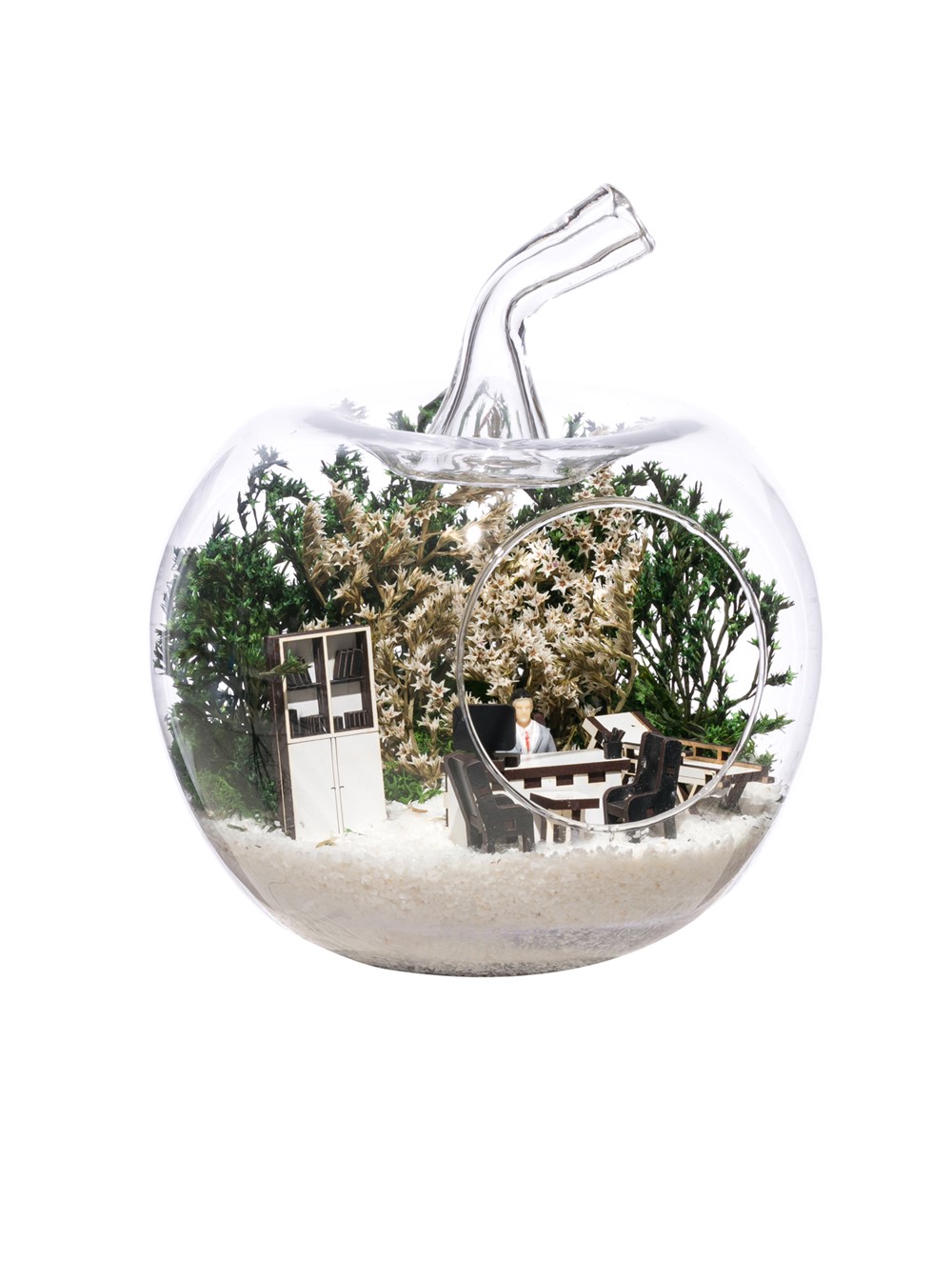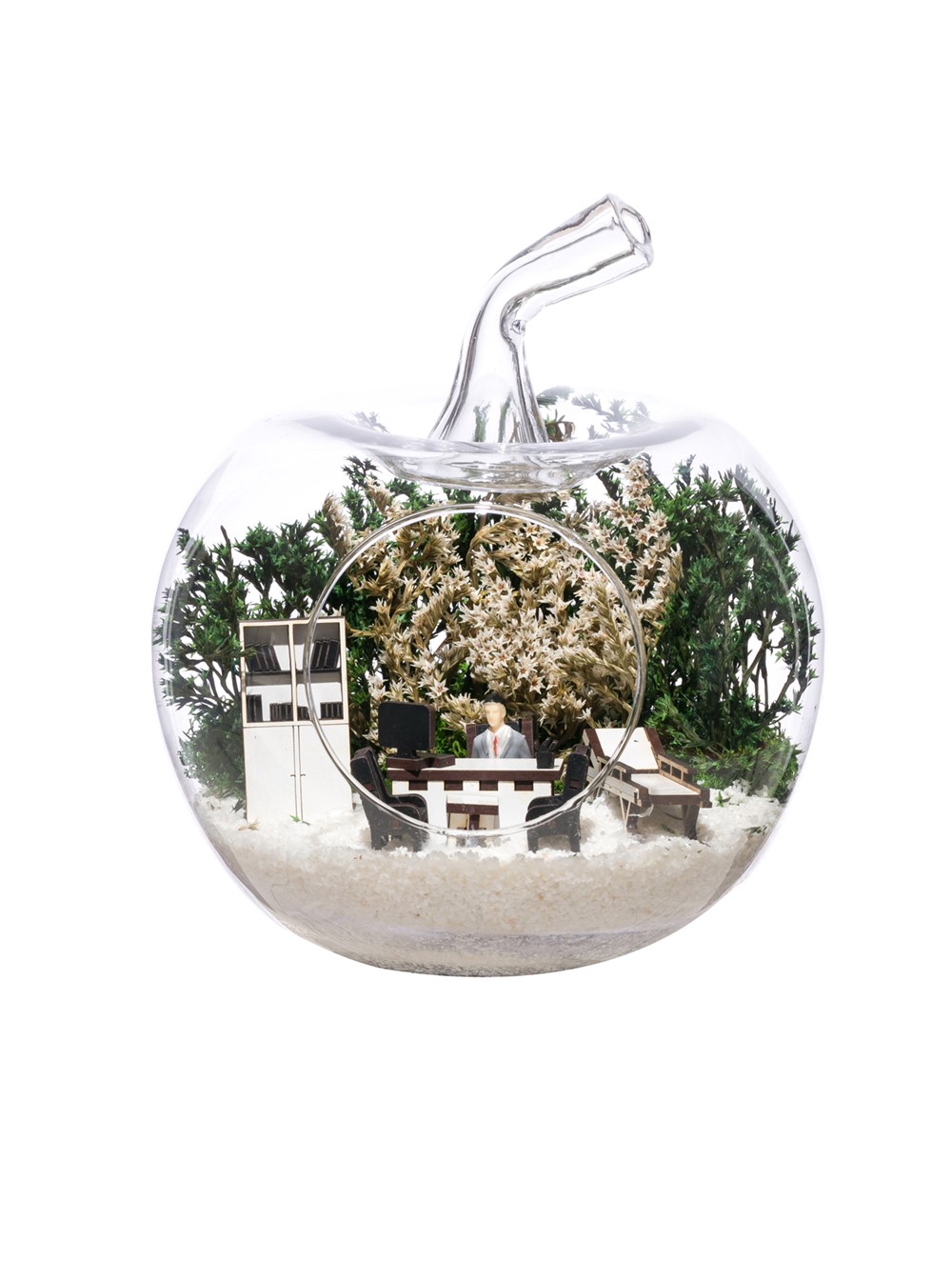 Küçük boy elma cam fanus içerisinde tasarladığımız bu alıcısına özel teraryum; beyaz kum, kurutulmuş bitkiler, şoklanmış yosunlar, bir adet masasında oturan erkek obje ve doktor odasını simgeleyen ahşap objelerle tamamlanmıştır. Ev ve ofis ortamlarının tamamında sergilenebilir teraryumun içinde kurutulmuş bitkiler bulunduğundan hava alması önemlidir. Açık olan kısmının kapatılmaması veya büfe vb. kapalı alanlara konulmaması gereklidir. Özellikle her ortamda yıllarca, zevkle izlenebilecek özel bir teraryumdur. Yaklaşık Ölçüleri: 20x20cm NOT: Teraryumlarda kullanılan camlar, üfleme cam işçiliğiyle üretildiğinden bazı detaylarda farklılıklar gözlenebilir. Örneğin, sap kısmı ve ağız bitiş noktalarının her biri kendine özgüdür.