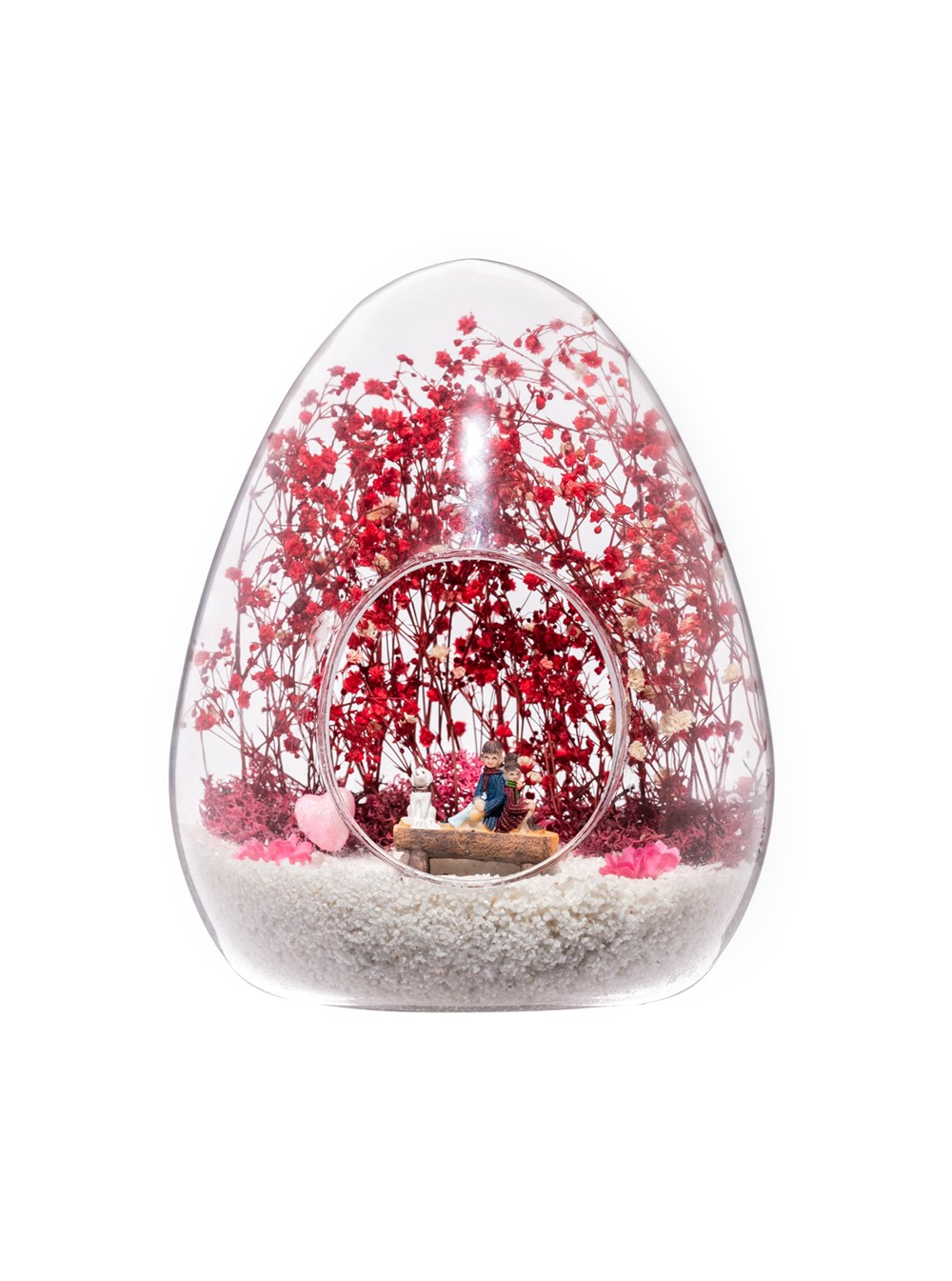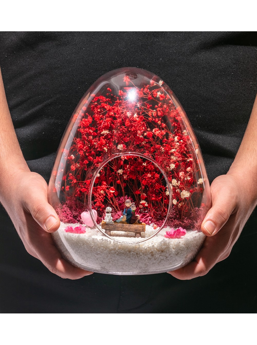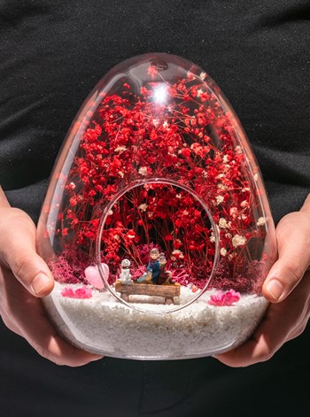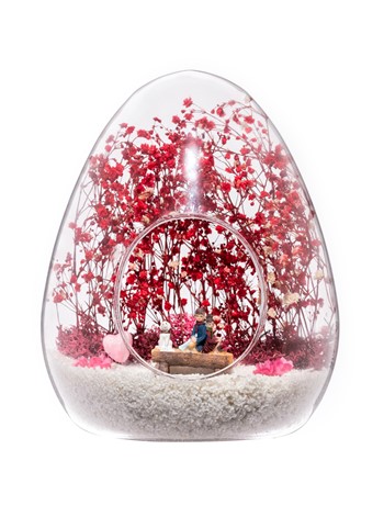 Küçük boy yumurta cam fanus içerisinde tasarladığımız bu özgün teraryum; beyaz kum, kurutulmuş bitkiler, şoklanmış yosunlar, bir adet simli kalp, renkli yapay mini çiçekler ve bankta sırt sırta oturan sevgilileri simgeleyen obje kullanılarak tamamlanmıştır. Ev ve ofis ortamlarının tamamında sergilenebilir teraryumun içinde, kurutulmuş bitkiler olduğundan hava alması önemlidir. Açık olan kısmının kapatılmaması veya büfe vb. kapalı alanlara konulmaması gereklidir. Özellikle her ortamda, zevkle izlenebilecek özel bir teraryumdur. Yaklaşık Ölçüleri: 18x22cm NOT: Teraryumlarda kullanılan camlar, üfleme cam işçiliğiyle üretildiğinden bazı detaylarda farklılıklar gözlenebilir. Örneğin, ağız bitiş noktalarının her biri kendine özgüdür.