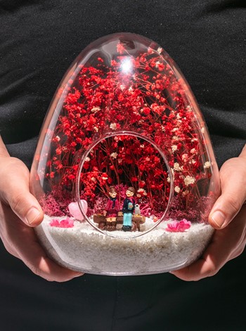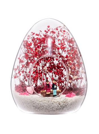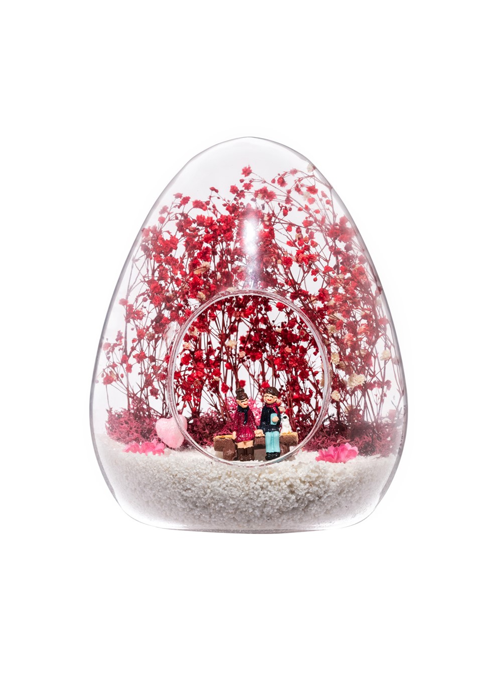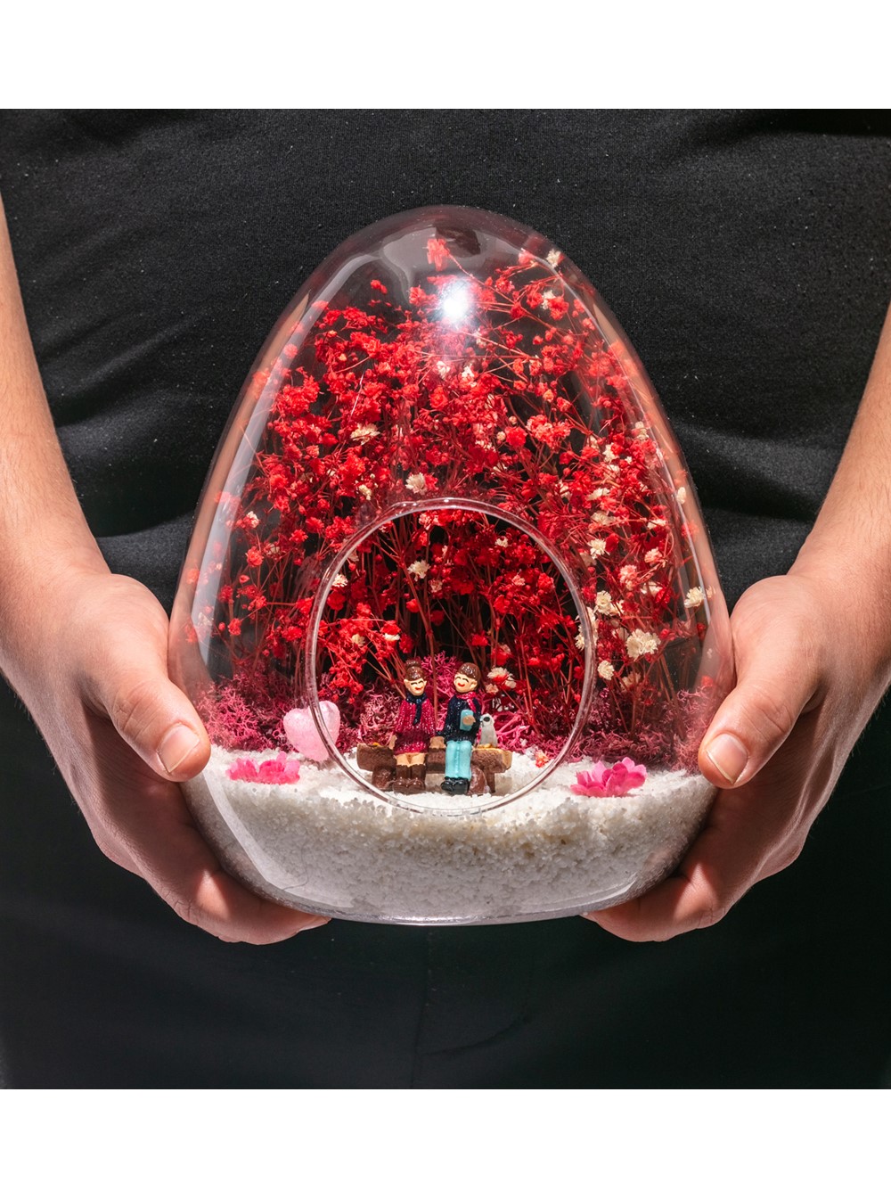 Küçük boy yumurta cam fanus içerisinde tasarladığımız bu özgün teraryum; beyaz kum, kurutulmuş bitkiler, şoklanmış yosunlar, bir adet simli kalp, renkli yapay mini çiçekler ve bankta yan yana oturan sevgilileri simgeleyen obje kullanılarak tamamlanmıştır. Ev ve ofis ortamlarının tamamında sergilenebilir teraryumun içinde, kurutulmuş bitkiler olduğundan hava alması önemlidir. Açık olan kısmının kapatılmaması veya büfe vb. kapalı alanlara konulmaması gereklidir. Özellikle her ortamda, zevkle izlenebilecek özel bir teraryumdur. Yaklaşık Ölçüleri: 18x22cm NOT: Teraryumlarda kullanılan camlar, üfleme cam işçiliğiyle üretildiğinden bazı detaylarda farklılıklar gözlenebilir. Örneğin, ağız bitiş noktalarının her biri kendine özgüdür.
