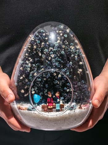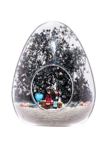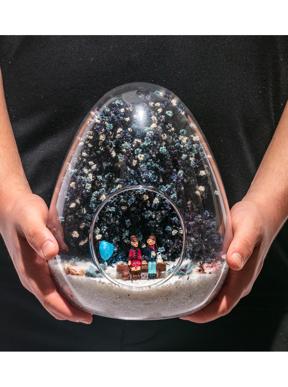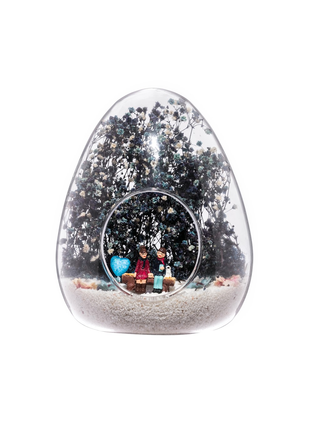 Küçük boy yumurta cam fanus içerisinde tasarladığımız bu özgün teraryum; beyaz kum, kurutulmuş bitkiler, şoklanmış yosunlar, bir adet simli kalp, renkli yapay mini çiçekler ve bankta yan yana oturan sevgilileri simgeleyen obje kullanılarak tamamlanmıştır. Ev ve ofis ortamlarının tamamında sergilenebilir teraryumun içinde, kurutulmuş bitkiler olduğundan hava alması önemlidir. Açık olan kısmının kapatılmaması veya büfe vb. kapalı alanlara konulmaması gereklidir. Özellikle her ortamda, zevkle izlenebilecek özel bir teraryumdur. Yaklaşık Ölçüleri: 18x22cm NOT: Teraryumlarda kullanılan camlar, üfleme cam işçiliğiyle üretildiğinden bazı detaylarda farklılıklar gözlenebilir. Örneğin, ağız bitiş noktalarının her biri kendine özgüdür.