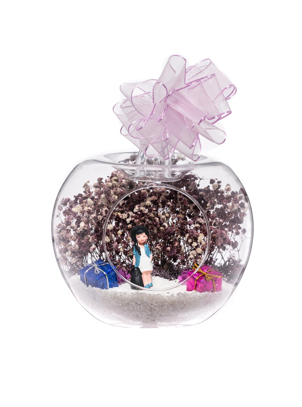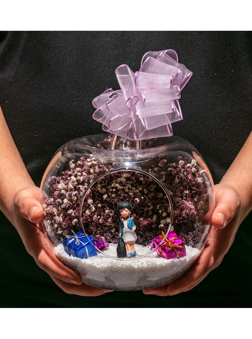 Küçük boy elma cam fanus içerisinde tasarladığımız bu kurdeleli teraryum; beyaz kum, yapay mini güller, renkli hediye paketleri, kurutulmuş bitkilerle beraber bir adet bayan objeyle tamamlanmıştır. Ev ve ofis ortamlarının tamamında sergilenebilir teraryumun içinde, kurutulmuş bitkiler bulunduğundan hava alması önemlidir. Açık olan kısmının kapatılmaması veya büfe vb. kapalı alanlara konulmaması gereklidir. Özellikle her ortamda, zevkle izlenebilecek çok özel bir teraryumdur. Yaklaşık Ölçüleri: 20x20cm NOT: Teraryumlarda kullanılan camlar, üfleme cam işçiliğiyle üretildiğinden bazı detaylarda farklılıklar gözlenebilir. Örneğin, sap kısmı ve ağız bitiş noktalarının her biri kendine özgüdür.