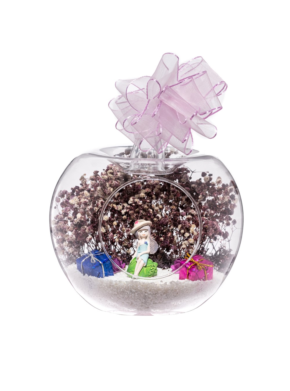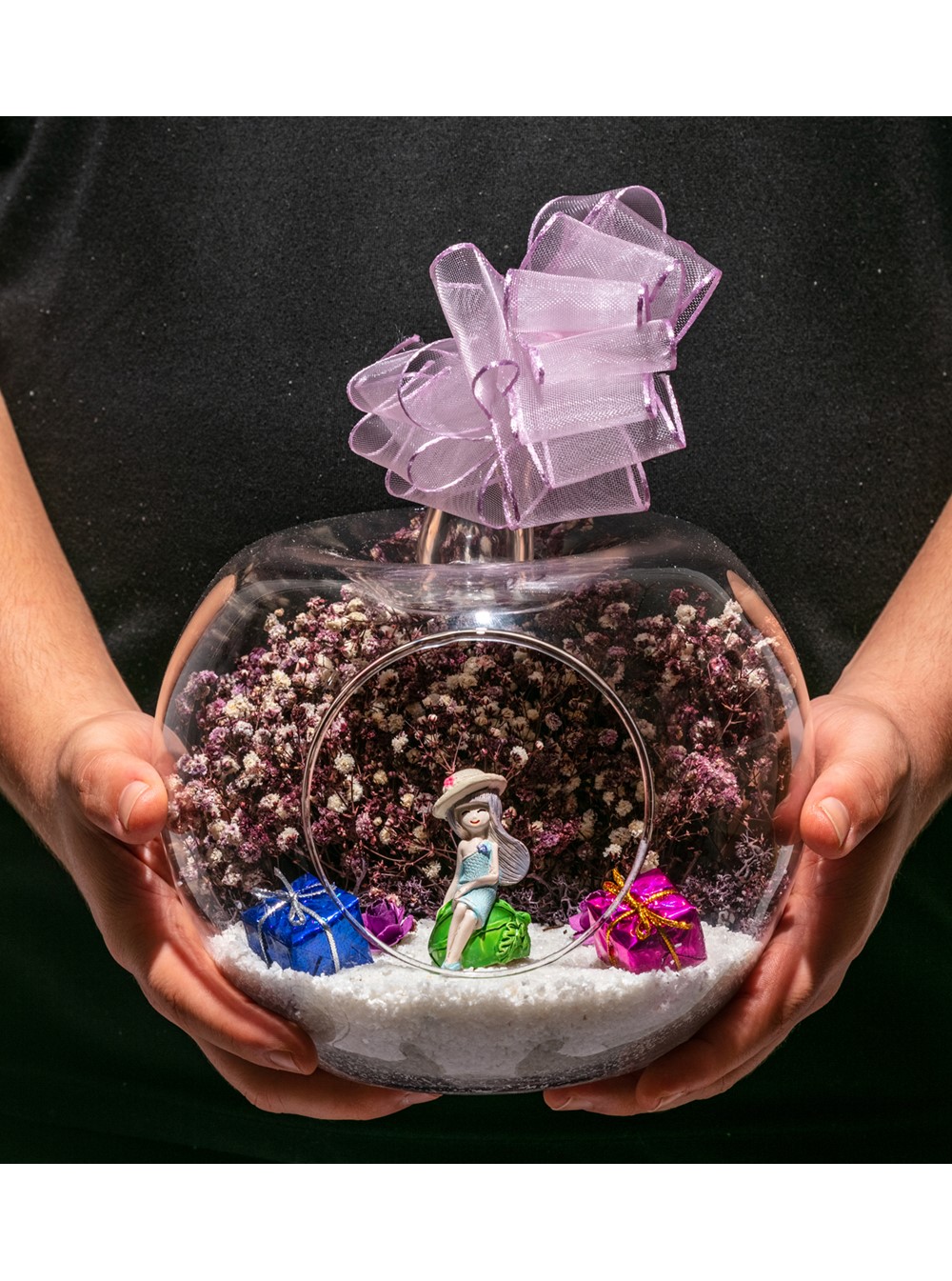 Küçük boy elma cam fanus içerisinde tasarladığımız bu kurdeleli teraryum; beyaz kum, yapay mini güller, renkli hediye paketleri, kurutulmuş bitkilerle beraber bir adet sırt sırta anın tadını çıkartan aşıkları simgeleyen objeyle tamamlanmıştır. Ev ve ofis ortamlarının tamamında sergilenebilir teraryumun içinde, kurutulmuş bitkiler bulunduğundan hava alması önemlidir. Açık olan kısmının kapatılmaması veya büfe vb. kapalı alanlara konulmaması gereklidir. Özellikle her ortamda, zevkle izlenebilecek çok özel bir teraryumdur. Yaklaşık Ölçüleri: 20x20cm NOT: Teraryumlarda kullanılan camlar, üfleme cam işçiliğiyle üretildiğinden bazı detaylarda farklılıklar gözlenebilir. Örneğin, sap kısmı ve ağız bitiş noktalarının her biri kendine özgüdür.