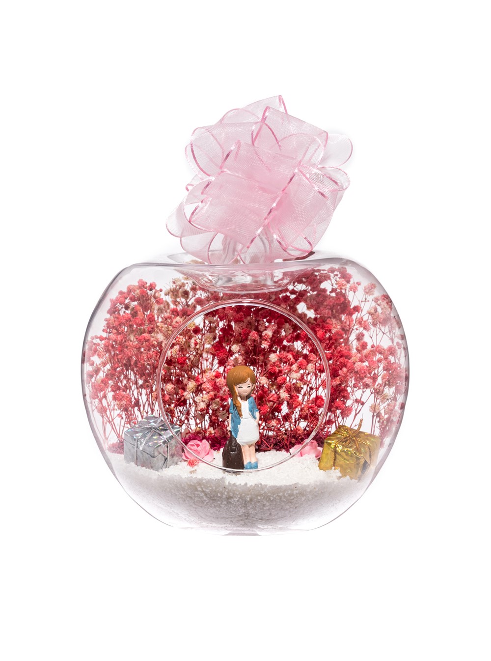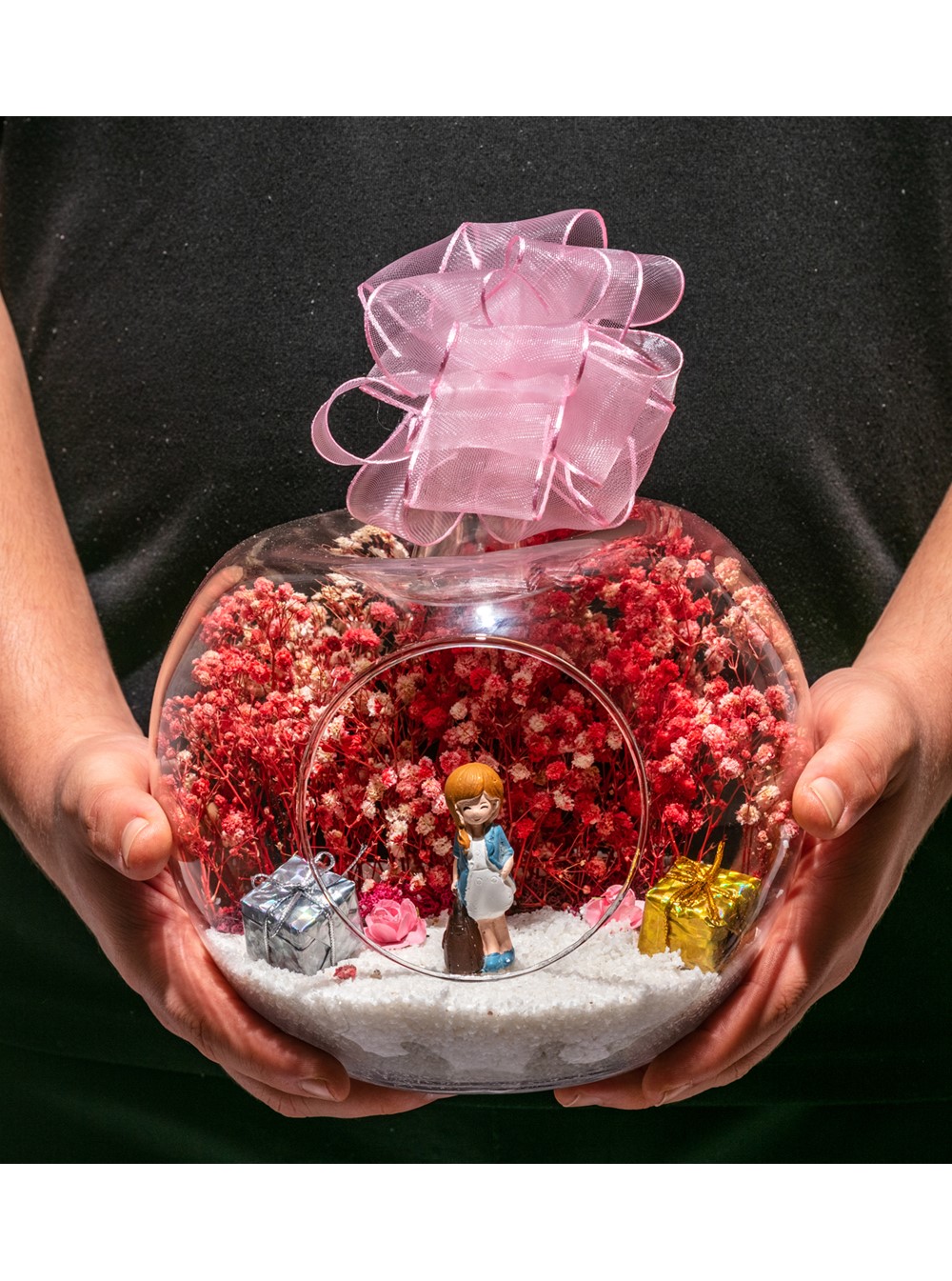 Orta boy açık cam fanus içerisinde hazırlanan bu özgün teraryum; beyaz kum, kurutulmuş bitkiler, yapay mini güller, renkli simli kalpler ve yan yana oturmuş anın tadını çıkartan aşıkları simgeleyen objeyle birlikte kurgulanmıştır. Ev ve ofis ortamlarının tamamında sergilenebilir teraryumun içinde, kurutulmuş ve şoklanmış bitkiler bulunduğundan hava alması önemlidir. Açık olan kısmının kapatılmaması veya büfe vb. kapalı alanlara konulmaması gereklidir. Özellikle her ortamda zevkle izlenebilecek özel bir teraryumdur. Yaklaşık Ölçüler: 19x23 cm'dir.