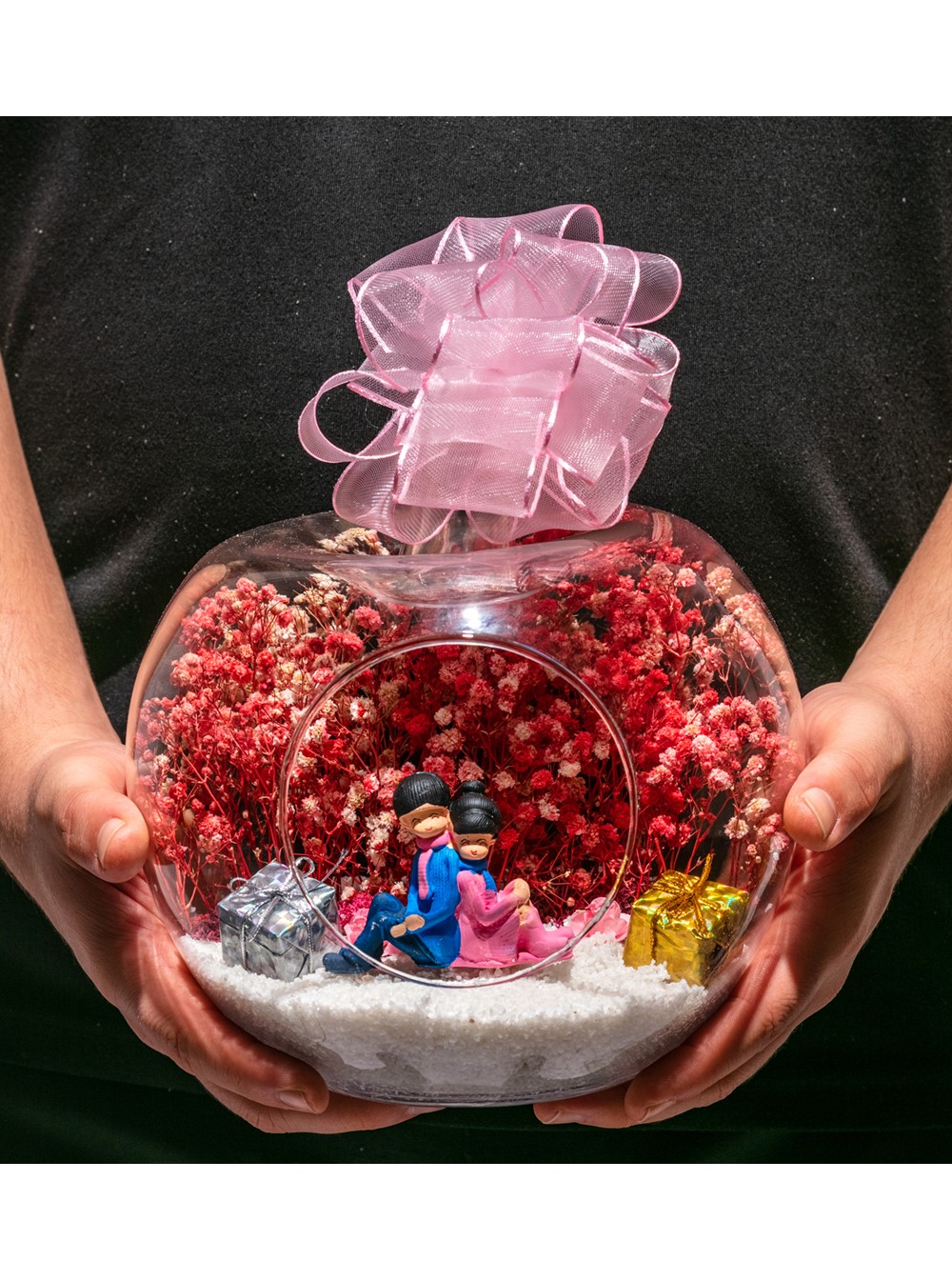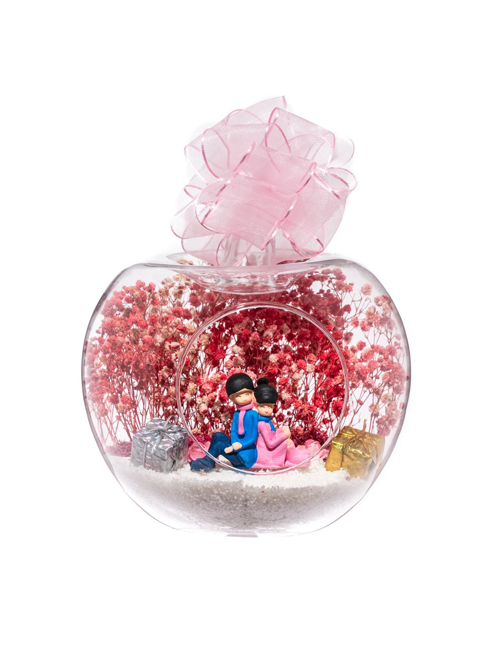 Küçük boy elma cam fanus içerisinde tasarladığımız bu kurdeleli teraryum; beyaz kum, yapay mini güller, renkli hediye paketleri, kurutulmuş bitkilerle beraber bir adet sırt sırta anın tadını çıkartan aşıkları simgeleyen objeyle tamamlanmıştır. Ev ve ofis ortamlarının tamamında sergilenebilir teraryumun içinde, kurutulmuş bitkiler bulunduğundan hava alması önemlidir. Açık olan kısmının kapatılmaması veya büfe vb. kapalı alanlara konulmaması gereklidir. Özellikle her ortamda, zevkle izlenebilecek çok özel bir teraryumdur. Yaklaşık Ölçüleri: 20x20cm NOT: Teraryumlarda kullanılan camlar, üfleme cam işçiliğiyle üretildiğinden bazı detaylarda farklılıklar gözlenebilir. Örneğin, sap kısmı ve ağız bitiş noktalarının her biri kendine özgüdür.