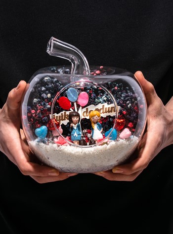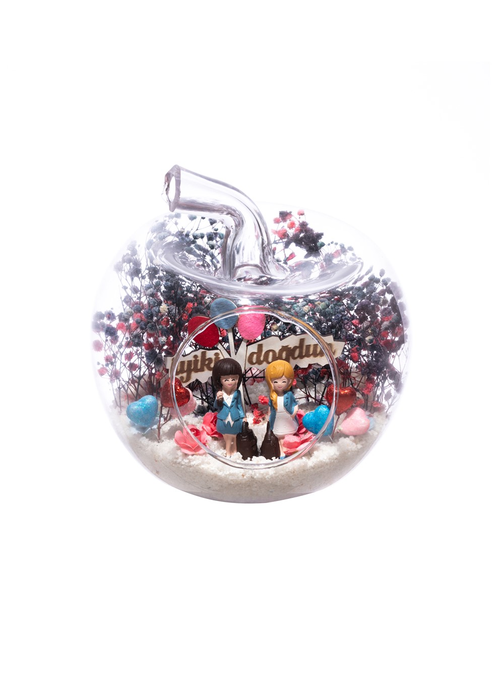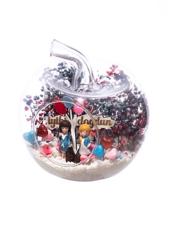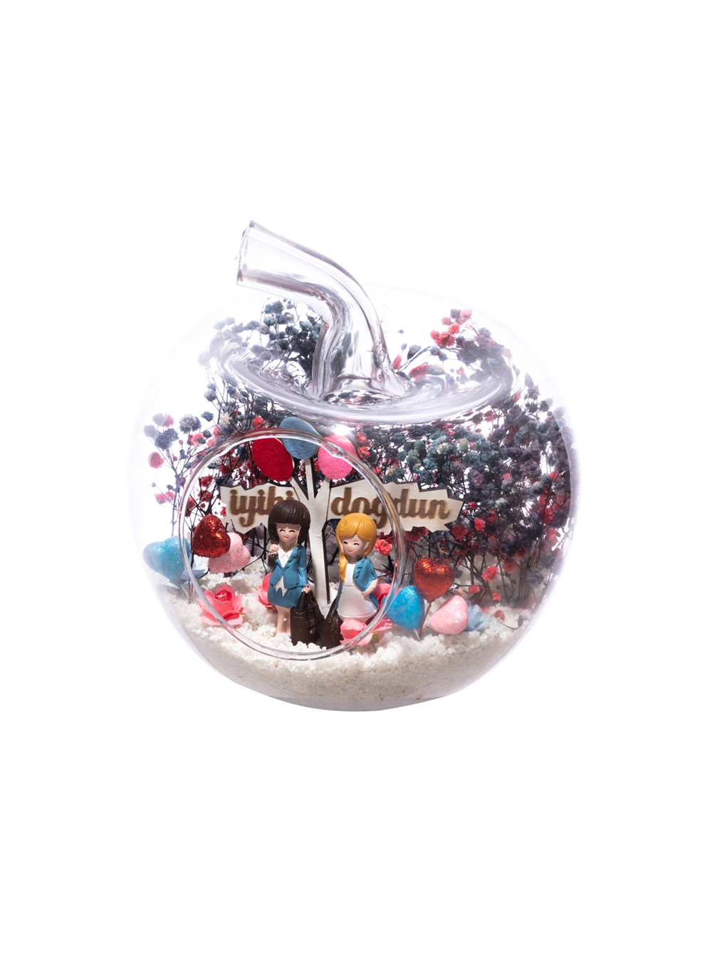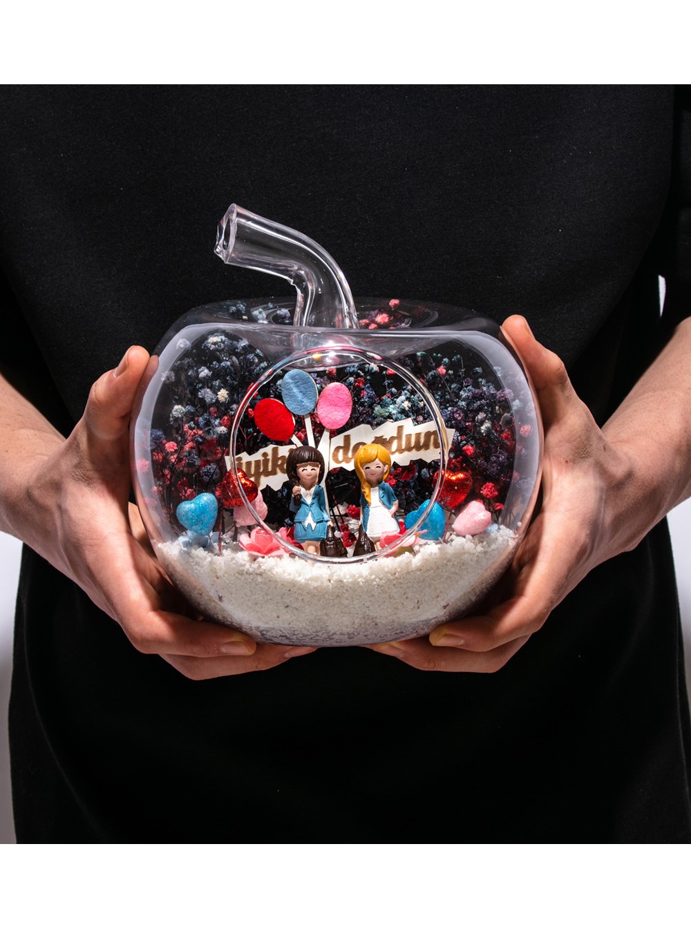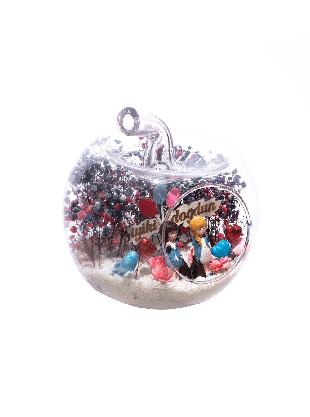 Küçük boy elma cam fanus içerisinde tasarladığımız bu çok güzel teraryum; beyaz kum, karışık renkli kurutulmuş bitkiler, renkli yapay mini güller, renkli simli kalpler, bir adet ahşap iyi ki doğdun yazılı balonlu tabela ve yan yana iki adet genç kadını simgeleyen objeler kullanılarak tamamlanmıştır. Ev ve ofis ortamlarının tamamında sergilenebilir teraryumun içinde, kurutulmuş bitkiler bulunduğundan hava alması önemlidir. Açık olan kısmının kapatılmaması veya büfe vb. kapalı alanlara konulmaması gereklidir. Özellikle her ortamda yıllarca, zevkle izlenebilecek özel bir teraryumdur. Yaklaşık Ölçüleri: 20x20cm NOT: Teraryumlarda kullanılan camlar, üfleme cam işçiliğiyle üretildiğinden bazı detaylarda farklılıklar gözlenebilir. Örneğin, sap kısmı ve ağız bitiş noktalarının her biri kendine özgüdür.