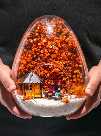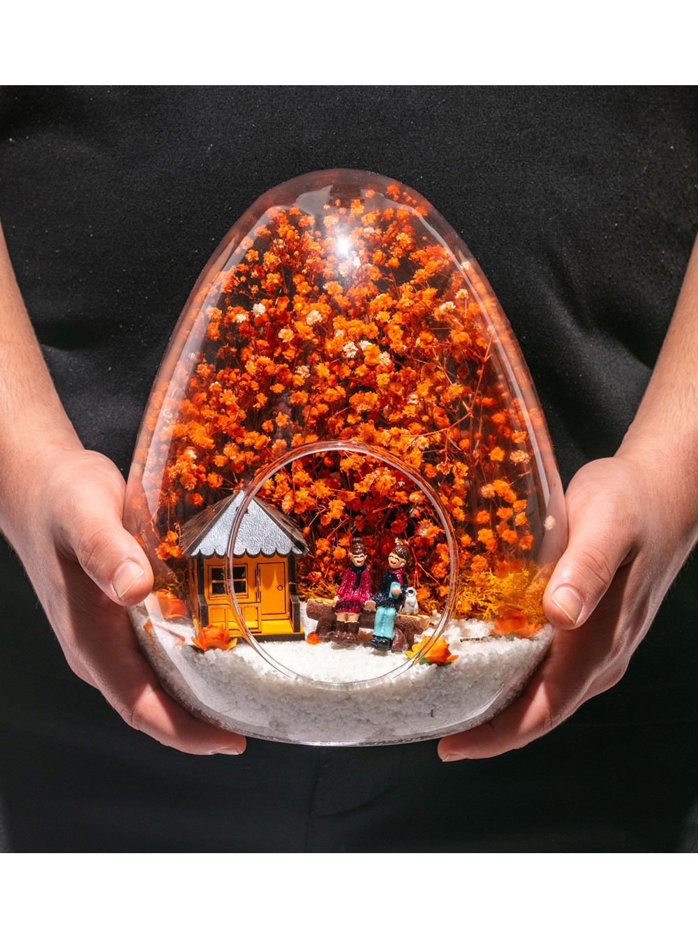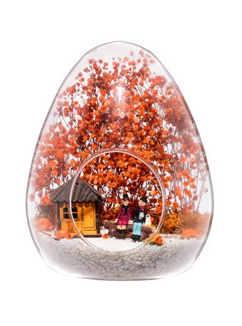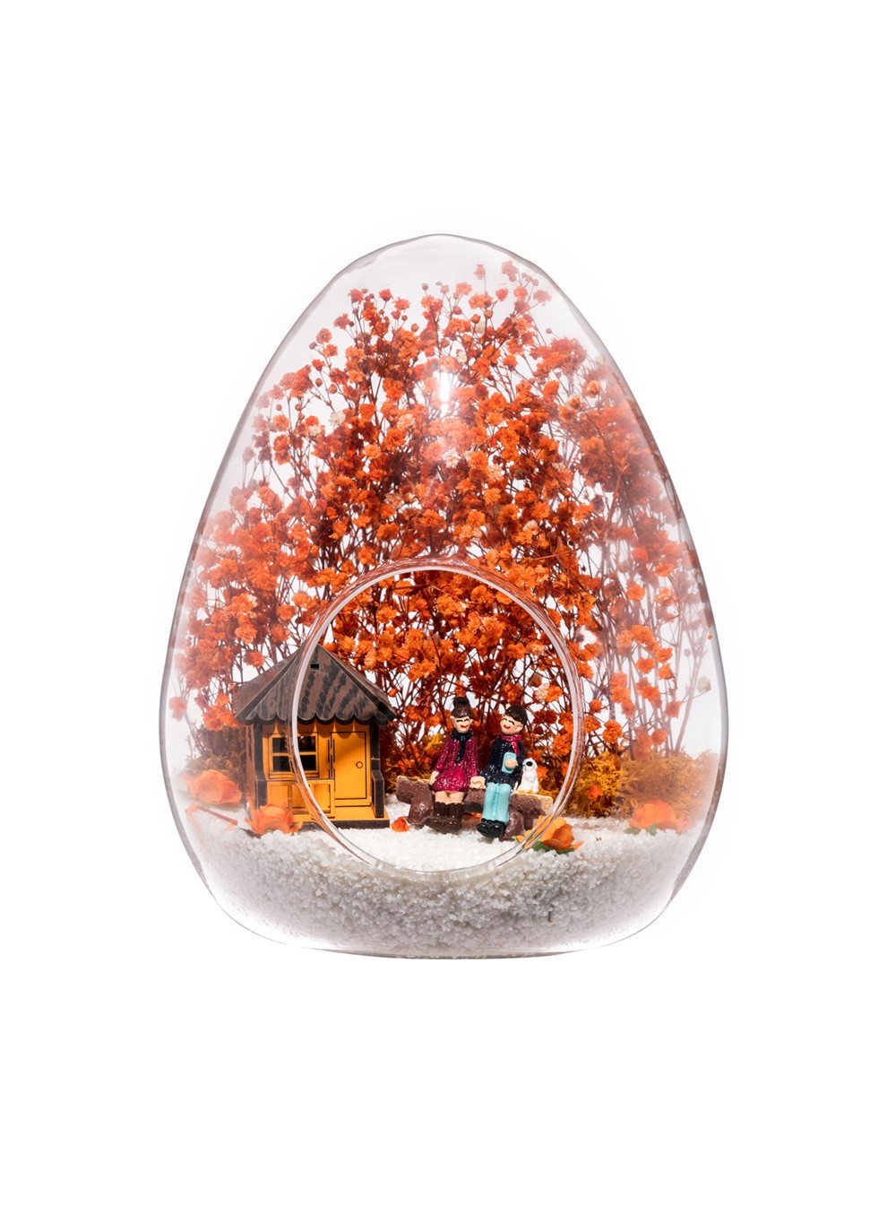 Küçük boy yumurta cam fanus içerisinde tasarladığımız bu güzel teraryum; beyaz kum, kurutulmuş bitkiler, şoklanmış yosunlar, yapay güller, bir adet oranj ahşap ev görseli ve bir adet bankta yan yana anı paylaşan sevgilileri simgeleyen obje ile kurgulanarak tamamlanmıştır. Ev ve ofis ortamlarının tamamında sergilenebilir teraryumun içinde, kurutulmuş ve şoklanmış bitkiler bulunduğundan hava alması önemlidir. Açık olan kısmının kapatılmaması veya büfe vb. kapalı alanlara konulmaması gereklidir. Özellikle her ortamda yıllarca, zevkle izlenebilecek özel bir teraryumdur. Yaklaşık Ölçüleri: 18x22cm NOT: Teraryumlarda kullanılan camlar, üfleme cam işçiliğiyle üretildiğinden bazı detaylarda farklılıklar gözlenebilir. Örneğin, yumurta şekli ve ağız bitiş noktalarının her biri kendine özgüdür.