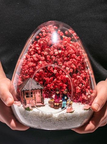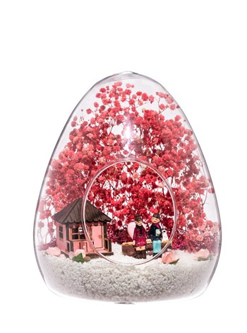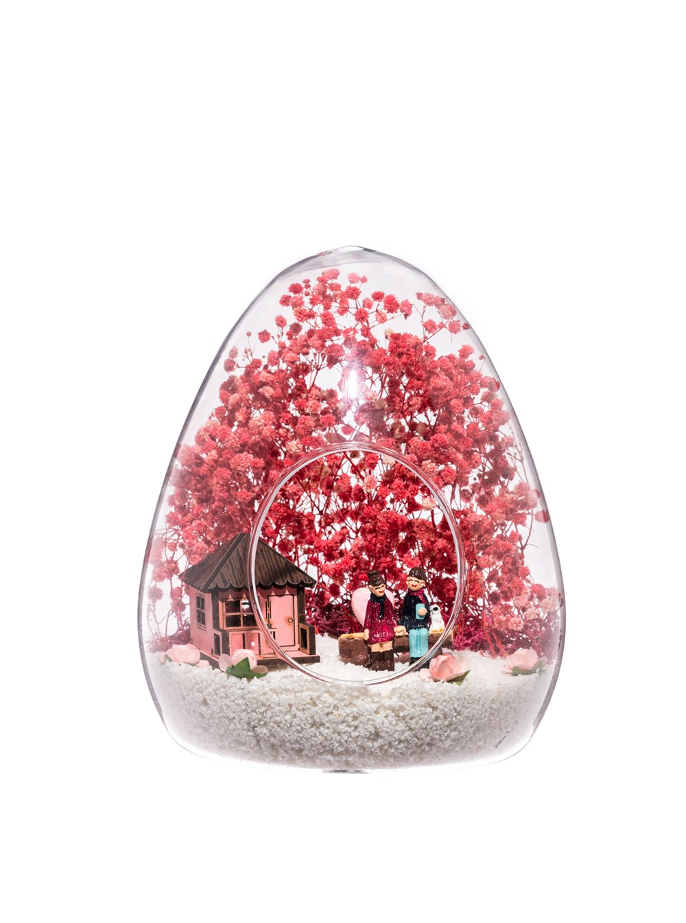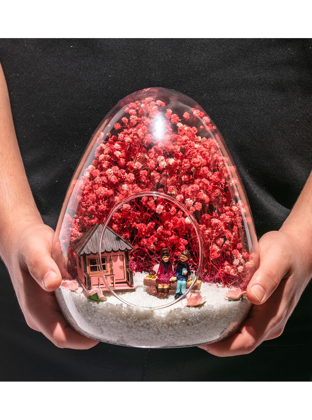 <p> Küçük boy yumurta cam fanus içerisinde tasarladığımız bu güzel teraryum; beyaz kum, kurutulmuş bitkiler, şoklanmış yosunlar, yapay güller, bir adet pembe ahşap ev görseli ve bir adet köpekleriyle bankta yan yana anı paylaşan sevgilileri simgeleyen obje ile kurgulanarak tamamlanmıştır. Ev ve ofis ortamlarının tamamında sergilenebilir teraryumun içinde, kurutulmuş ve şoklanmış bitkiler bulunduğundan hava alması önemlidir. Açık olan kısmının kapatılmaması veya büfe vb. kapalı alanlara konulmaması gereklidir. Özellikle her ortamda yıllarca, zevkle izlenebilecek özel bir teraryumdur. Yaklaşık Ölçüleri: 18x22cm NOT: Teraryumlarda kullanılan camlar, üfleme cam işçiliğiyle üretildiğinden bazı detaylarda farklılıklar gözlenebilir. Örneğin, yumurta şekli ve ağız bitiş noktalarının her biri kendine özgüdür. Teraryum Pembe Aşk Bahçemiz