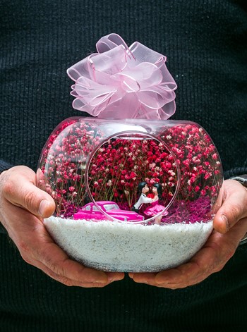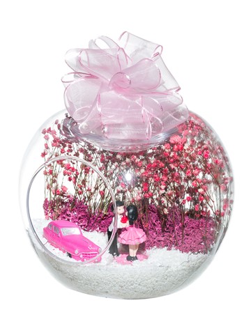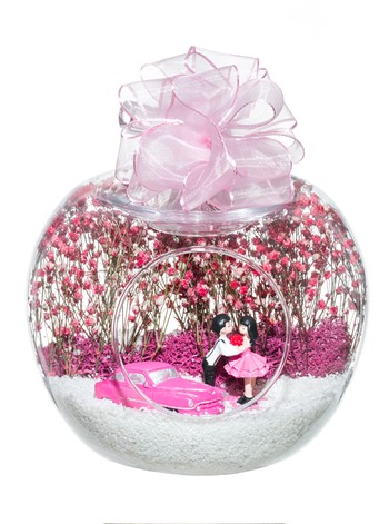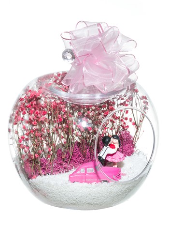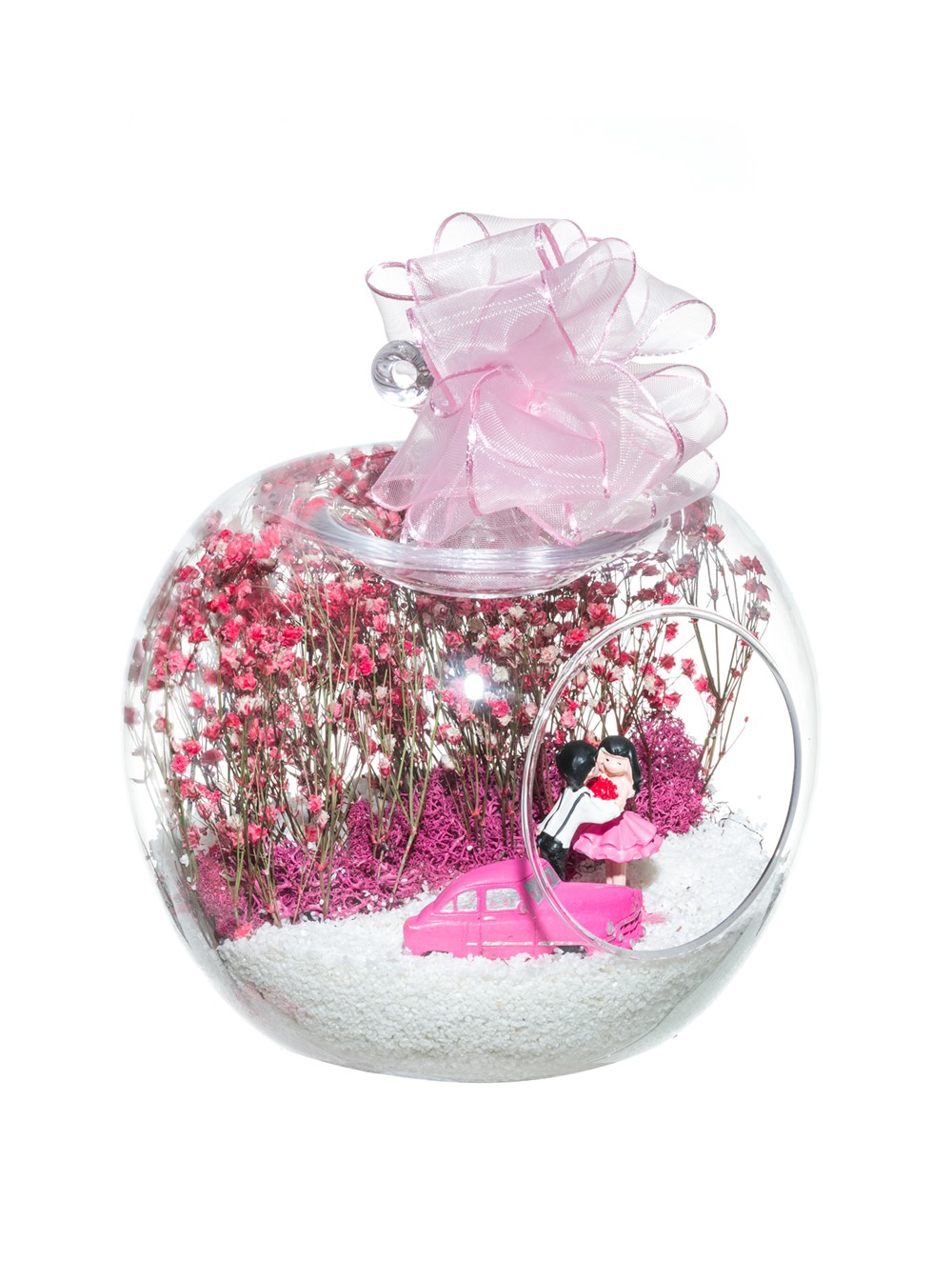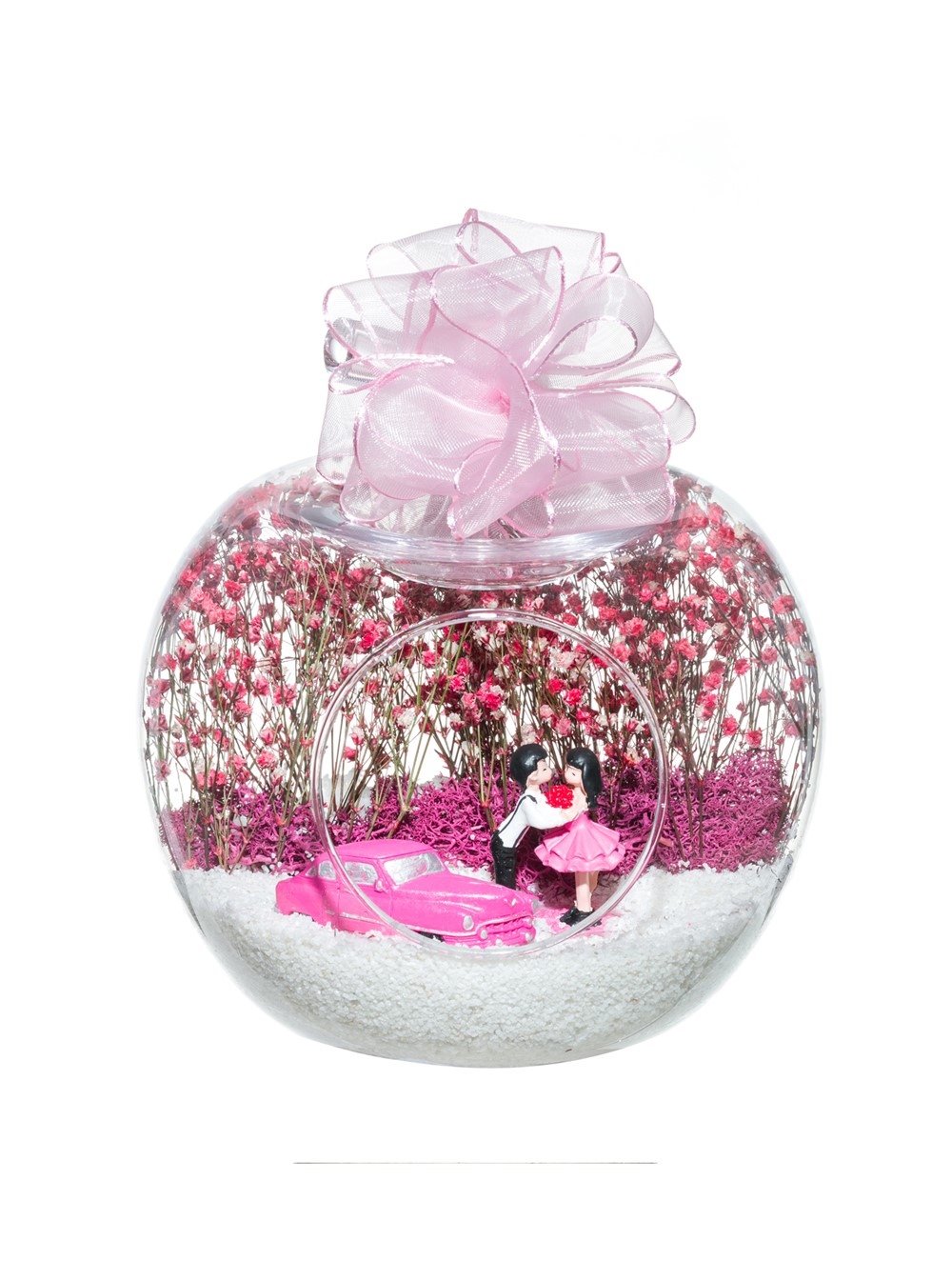 Kurdele takılı küçük boy elma cam fanus içerisinde tasarladığımız bu güzel teraryum; beyaz kum, şoklanmış yosunlar, kurutulmuş bitkiler, bir adet antika otomobil görseli, bir adet bir birlerine sarılmış aşıkları simgeleyen objelerle tamamlanmıştır. Ev ve ofis ortamlarının tamamında sergilenebilir teraryumun içinde, kurutulmuş ve şoklanmış bitkiler bulunduğundan hava alması önemlidir. Açık olan kısmının kapatılmaması veya büfe vb. kapalı alanlara konulmaması gereklidir. Özellikle her ortamda yıllarca, zevkle izlenebilecek özel bir teraryumdur. Yaklaşık Ölçüleri: 20x20cm NOT: Teraryumlarda kullanılan camlar, üfleme cam işçiliğiyle üretildiğinden bazı detaylarda farklılıklar gözlenebilir. Örneğin, sap kısmı ve ağız bitiş noktalarının her biri kendine özgüdür.
