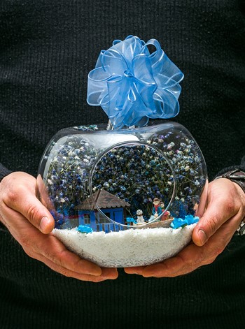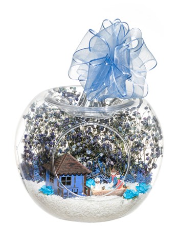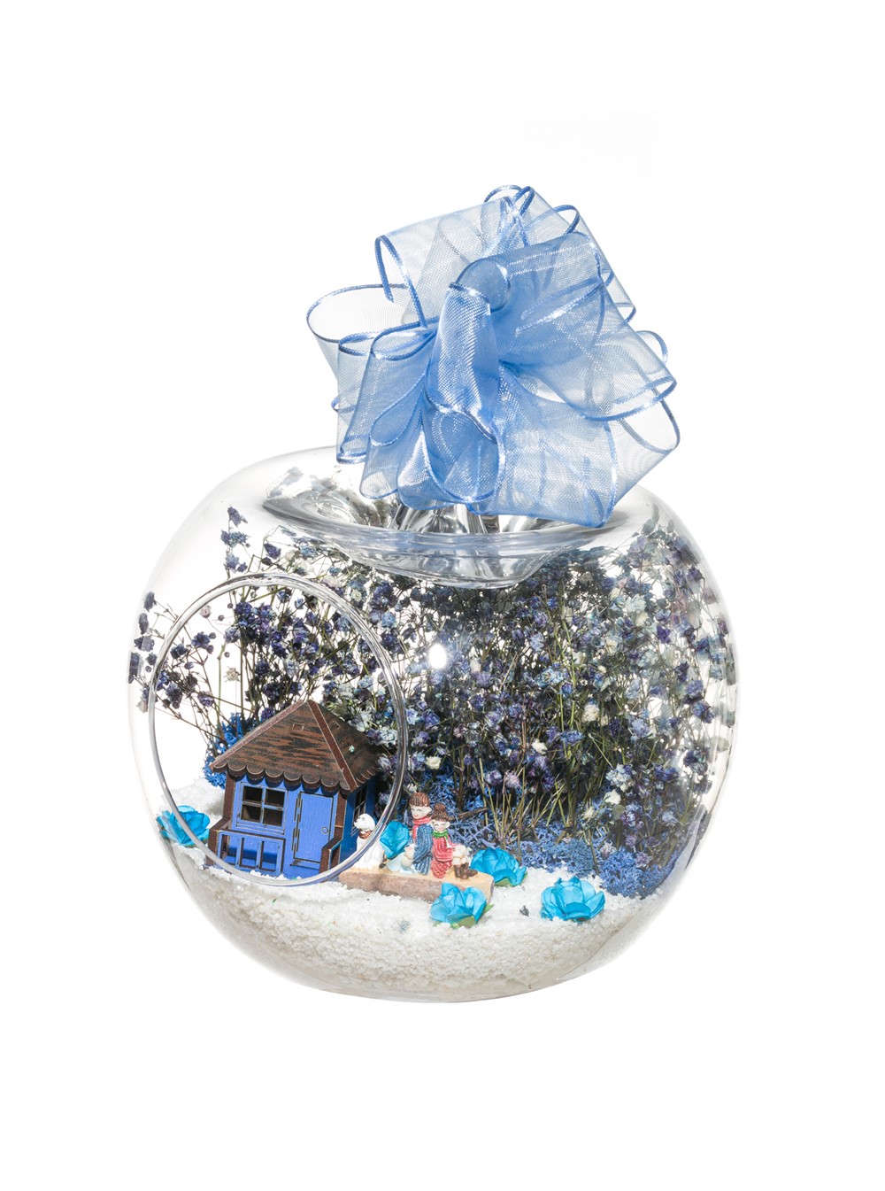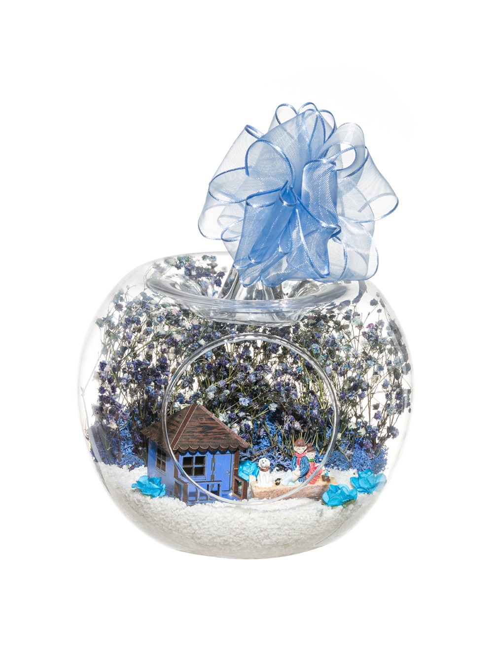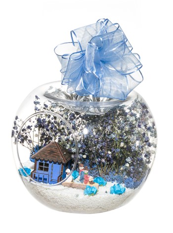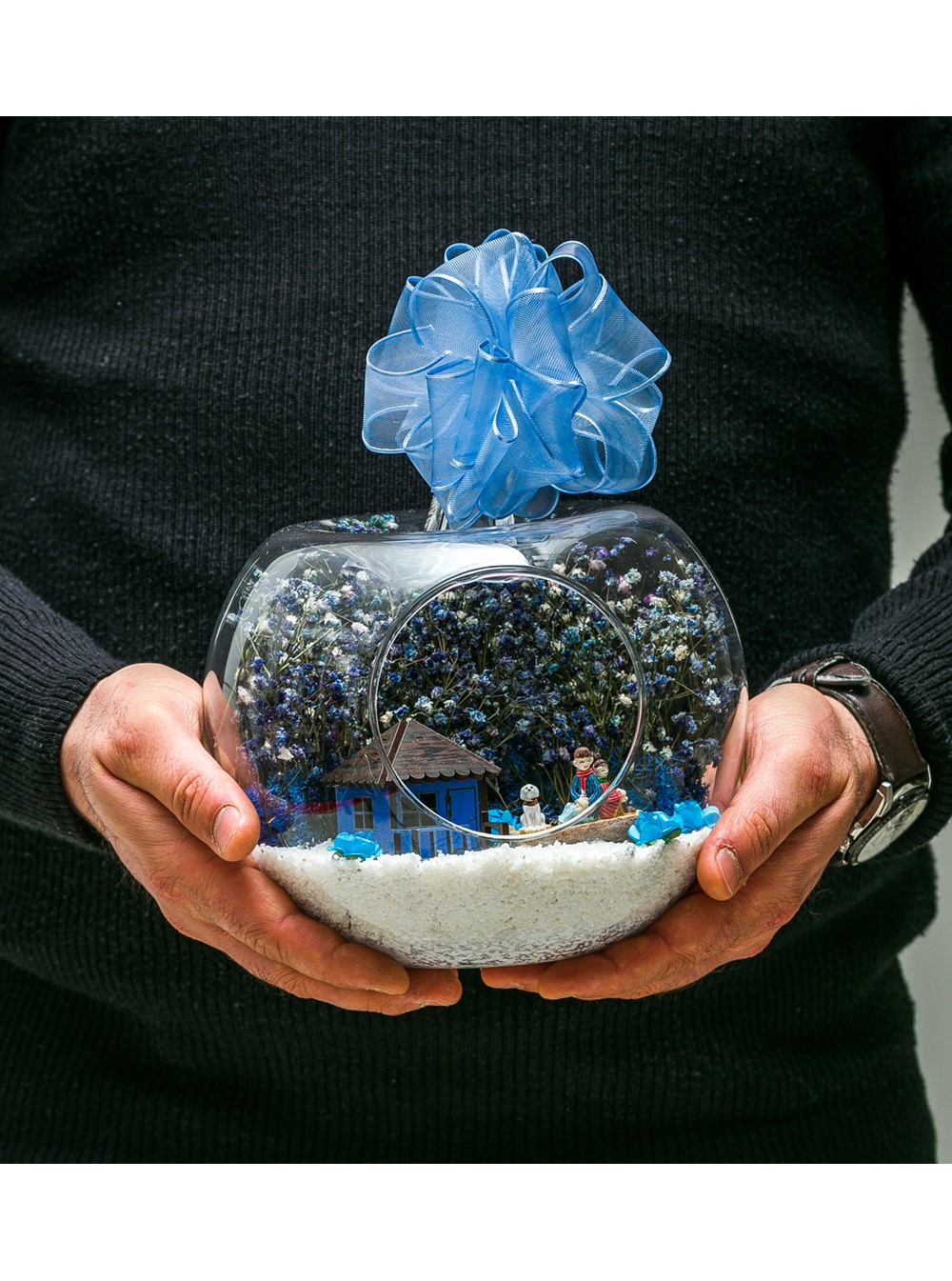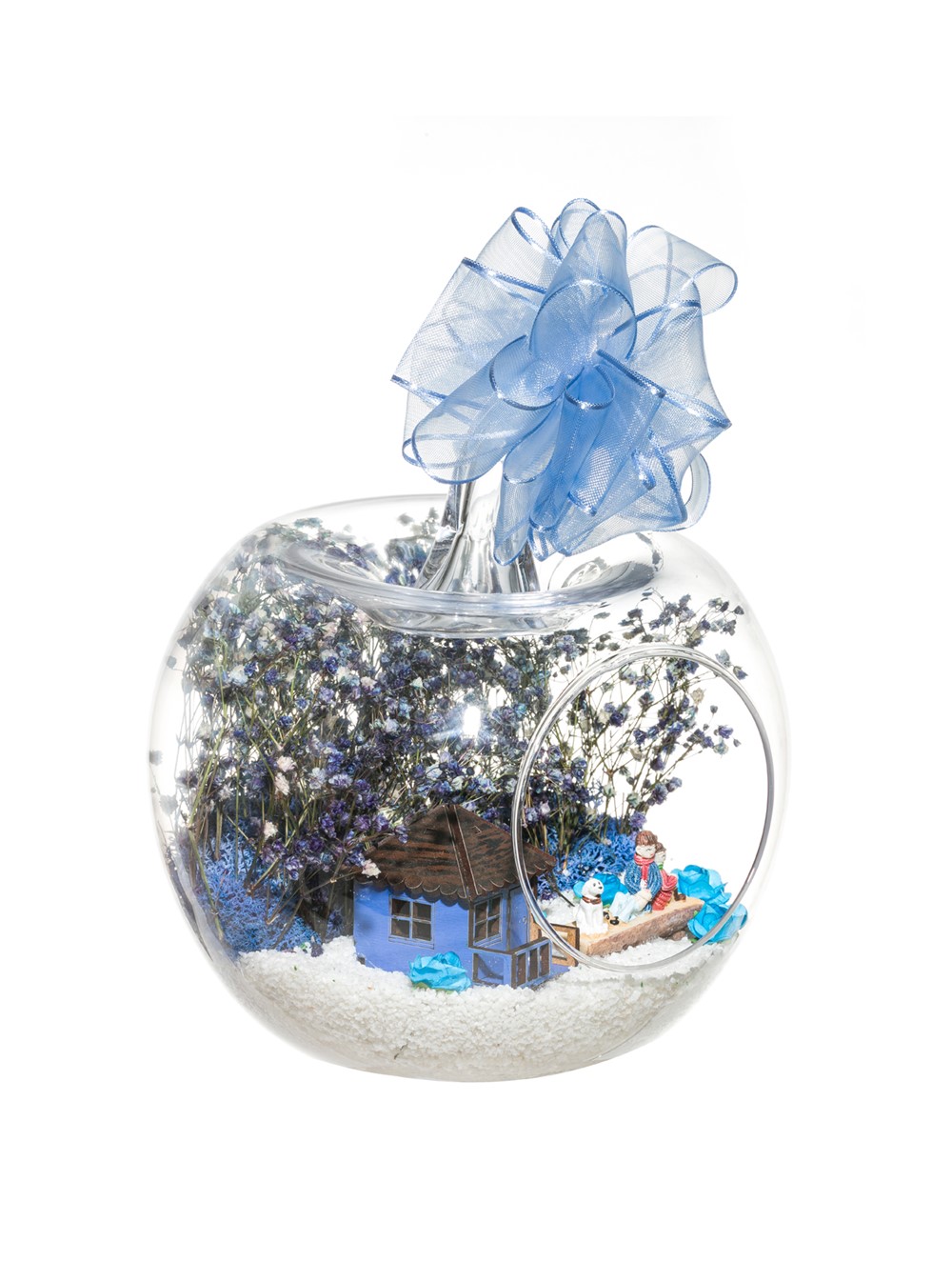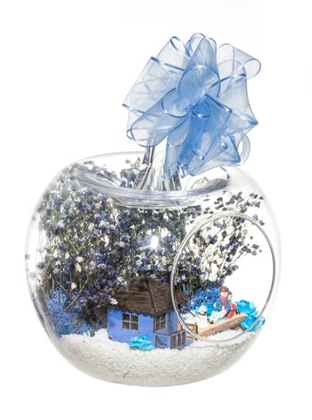 Kurdele takılı küçük boy elma cam fanus içerisinde tasarladığımız bu çok güzel teraryum; beyaz kum, şoklanmış yosunlar, kurutulmuş bitkiler, mini yapay güller, bir adet ahşap mavi ev ve bahçelerinde yanlarında köpekleriyle, bankta bir birine yaslanmış anı paylaşan yetişkinleri simgeleyen objelerle tamamlanmıştır. Ev ve ofis ortamlarının tamamında sergilenebilir teraryumun içinde, kurutulmuş ve şoklanmış bitkiler bulunduğundan hava alması önemlidir. Açık olan kısmının kapatılmaması veya büfe vb. kapalı alanlara konulmaması gereklidir. Özellikle her ortamda yıllarca, zevkle izlenebilecek özel bir teraryumdur. Yaklaşık Ölçüleri: 20x20cm NOT: Teraryumlarda kullanılan camlar, üfleme cam işçiliğiyle üretildiğinden bazı detaylarda farklılıklar gözlenebilir. Örneğin, sap kısmı ve ağız bitiş noktalarının her biri kendine özgüdür.