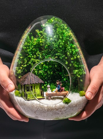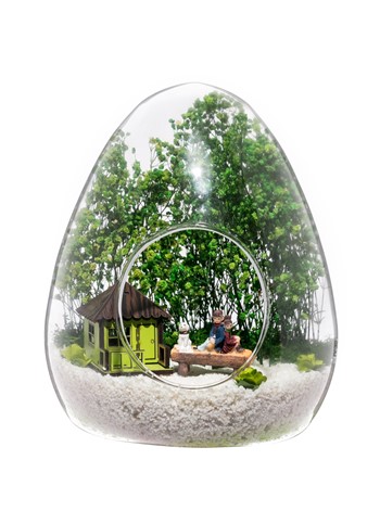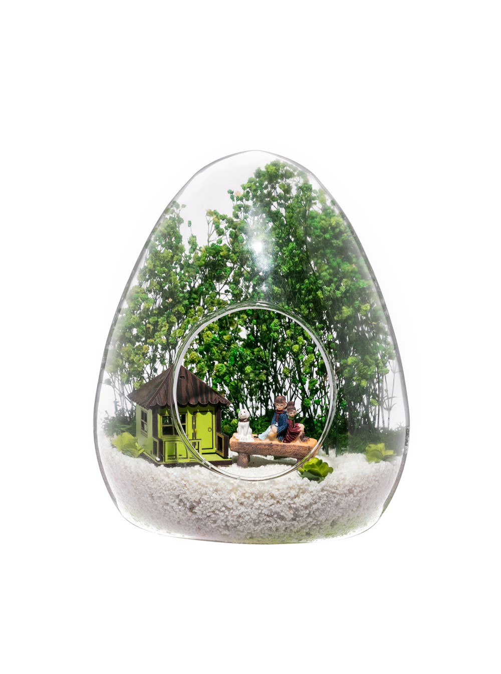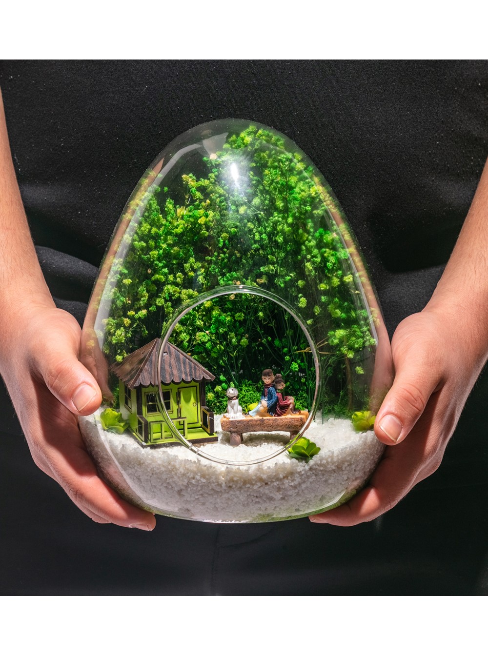Küçük boy yumurta cam fanus içerisinde tasarladığımız, bu özgün teraryum; beyaz kum, kuru bitkiler, şoklanmış yosunlar, yapay mini güller, bir adet bankta köpekleriyle sırt sırta sohbet eden iki yetişkin, bir adet yeşil ahşap ev objeleri kullanılarak tamamlanmıştır. Ev ve ofis ortamlarının tamamında sergilenebilir teraryumun içinde, kurutulmuş ve şoklanmış bitkiler olduğundan hava alması önemlidir. Açık olan kısmının kapatılmaması veya büfe vb. kapalı alanlara konulmaması gereklidir. Özellikle her ortamda yıllarca, zevkle izlenebilecek özel bir teraryumdur. Yaklaşık Ölçüleri: 18x22cm NOT: Teraryumlarda kullanılan camlar, üfleme cam işçiliğiyle üretildiğinden bazı detaylarda farklılıklar gözlenebilir. Örneğin, ağız bitiş noktalarının her biri kendine özgüdür.