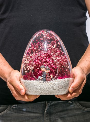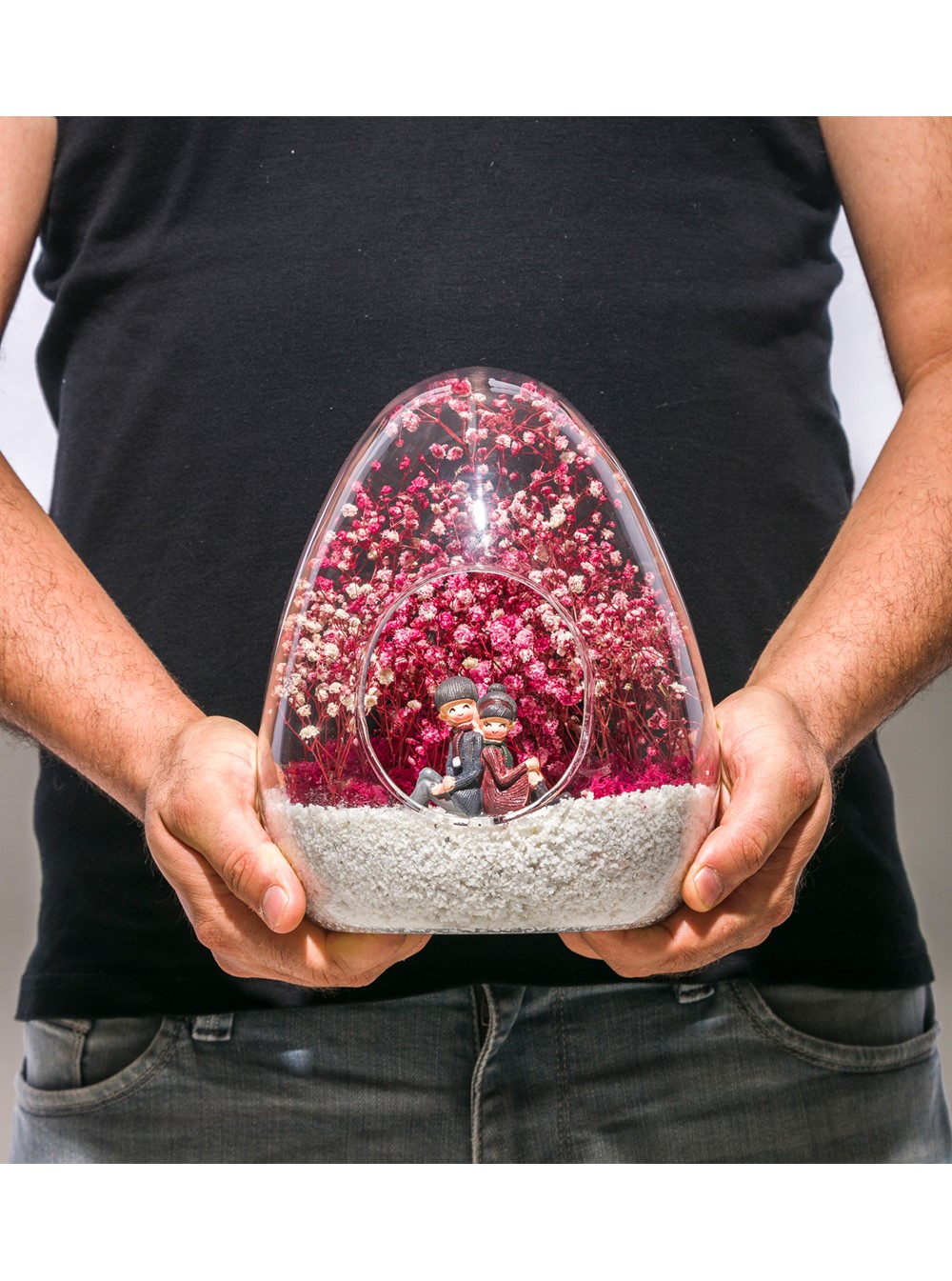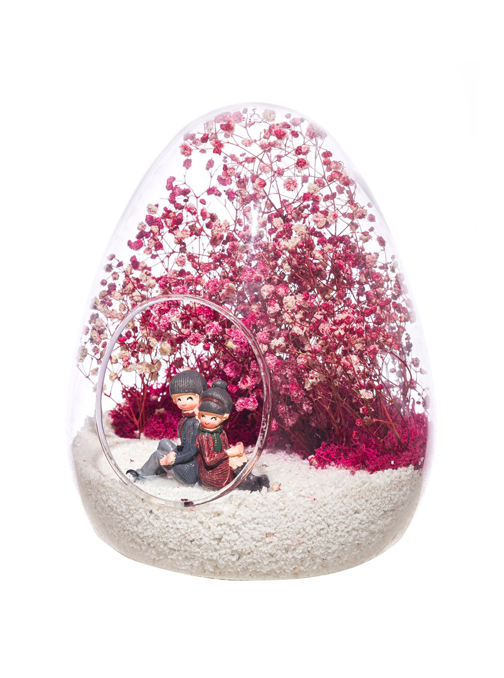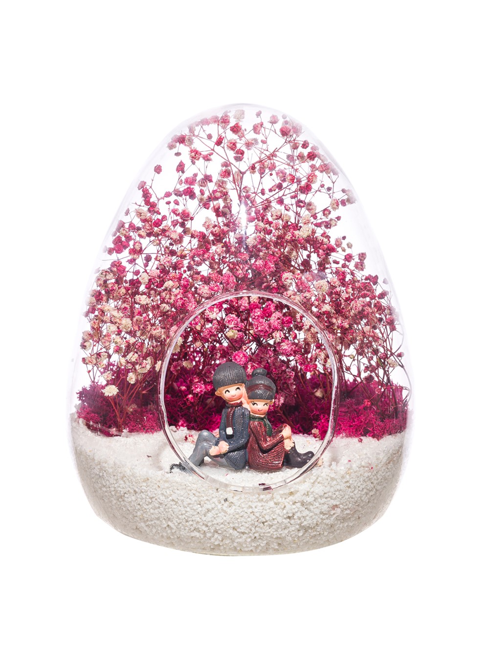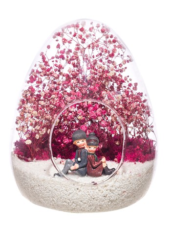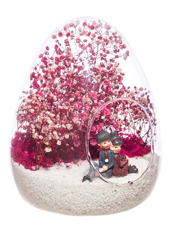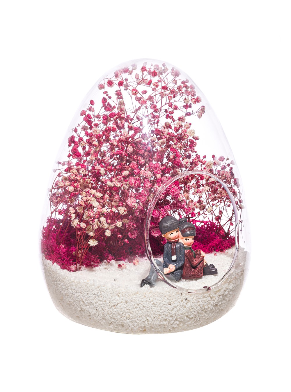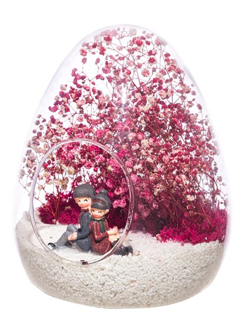 Küçük boy yumurta cam fanus içerisinde tasarladığımız bu güzel teraryum; beyaz kum, kurutulmuş bitkiler, şoklanmış yosunlar ve bir adet sırt sırta vermiş anın tadını paylaşan iki yetişkin görselleriyle tamamlanmıştır. Ev ve ofis ortamlarının tamamında sergilenebilir teraryumun içinde, kurutulmuş ve şoklanmış bitkiler bulunduğundan hava alması önemlidir. Açık olan kısmının kapatılmaması veya büfe vb. kapalı alanlara konulmaması gereklidir. Özellikle her ortamda yıllarca, zevkle izlenebilecek özel bir teraryumdur. Yaklaşık Ölçüleri: 18x22cm NOT: Teraryumlarda kullanılan camlar, üfleme cam işçiliğiyle üretildiğinden bazı detaylarda farklılıklar gözlenebilir. Örneğin, sap kısmı ve ağız bitiş noktalarının her biri kendine özgüdür.