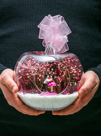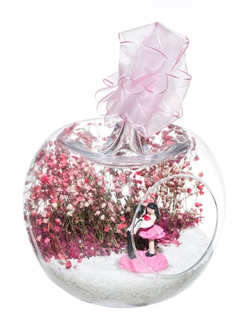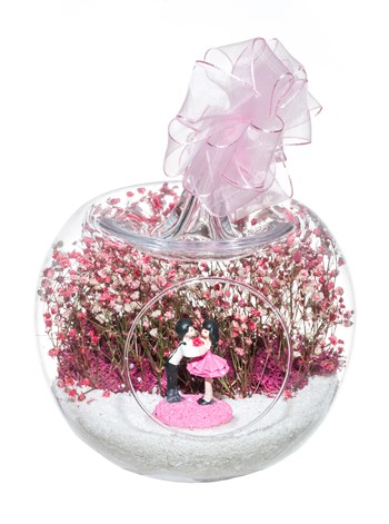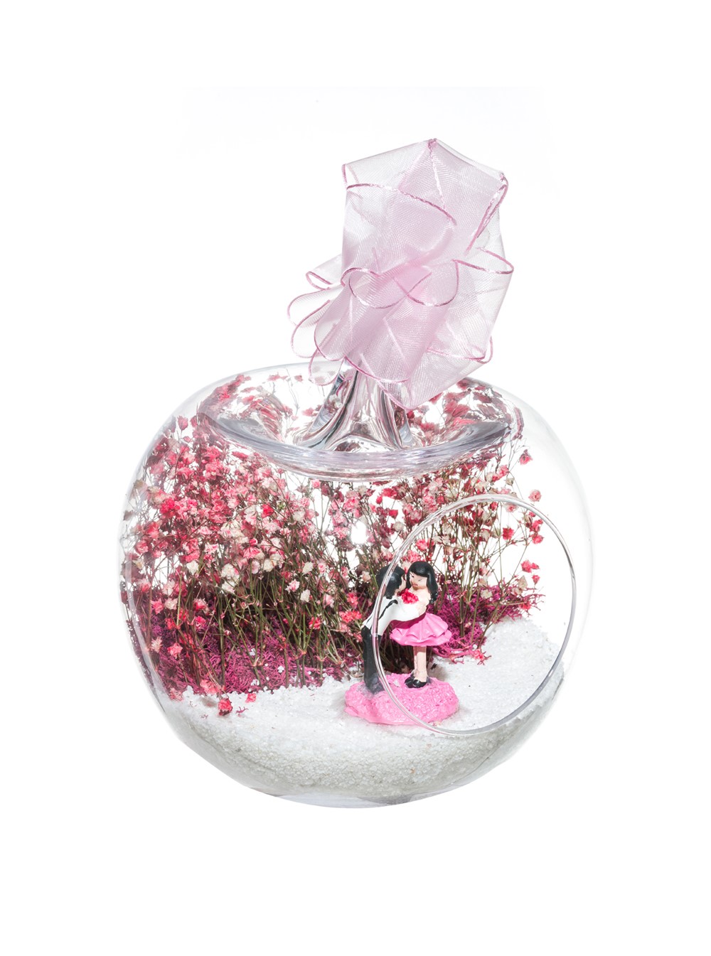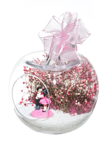 Kurdele takılı küçük boy elma cam fanus içerisinde tasarladığımız bu çok güzel teraryum; beyaz kum, şoklanmış yosunlar, kurutulmuş bitkiler ve yanında sevdiği kıza aşkını pembe güllerle anlatan aşıkları simgeleyen obje ile tamamlanmıştır. Ev ve ofis ortamlarının tamamında sergilenebilir teraryumun içinde, kurutulmuş ve şoklanmış bitkiler bulunduğundan hava alması önemlidir. Açık olan kısmının kapatılmaması veya büfe vb. kapalı alanlara konulmaması gereklidir. Özellikle her ortamda yıllarca, zevkle izlenebilecek özel bir teraryumdur. Yaklaşık Ölçüleri: 20x20cm NOT: Teraryumlarda kullanılan camlar, üfleme cam işçiliğiyle üretildiğinden bazı detaylarda farklılıklar gözlenebilir. Örneğin, sap kısmı ve ağız bitiş noktalarının her biri kendine özgüdür.