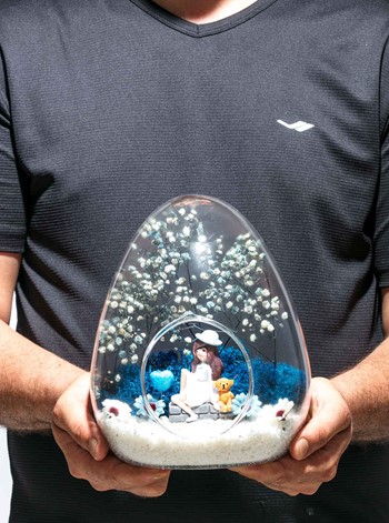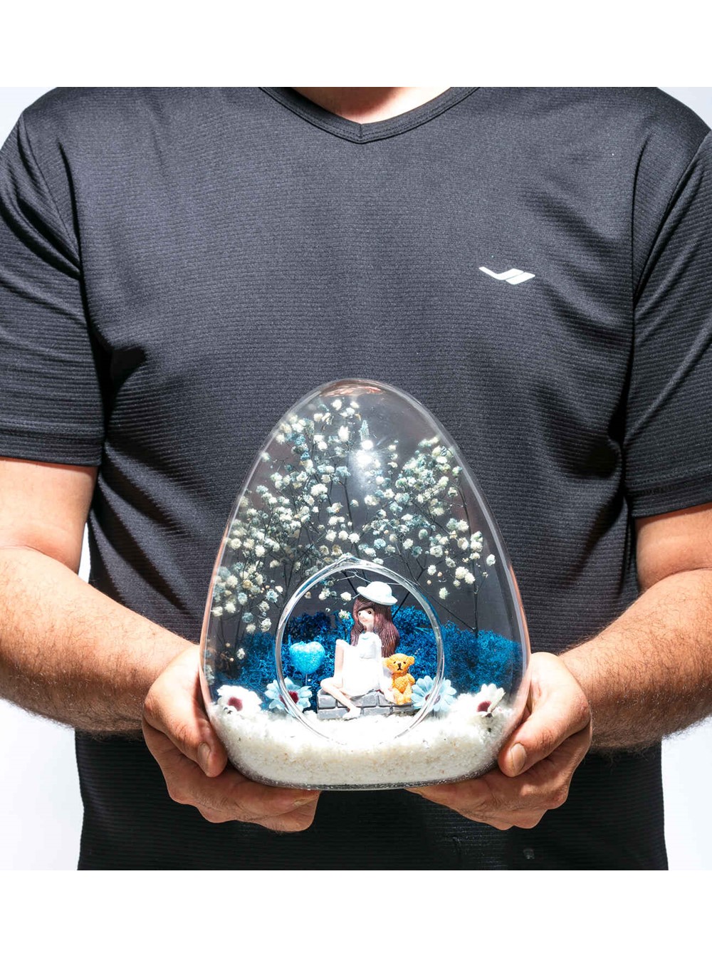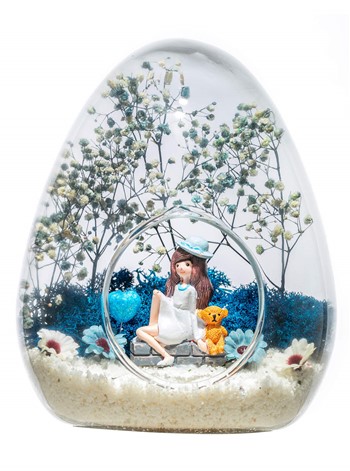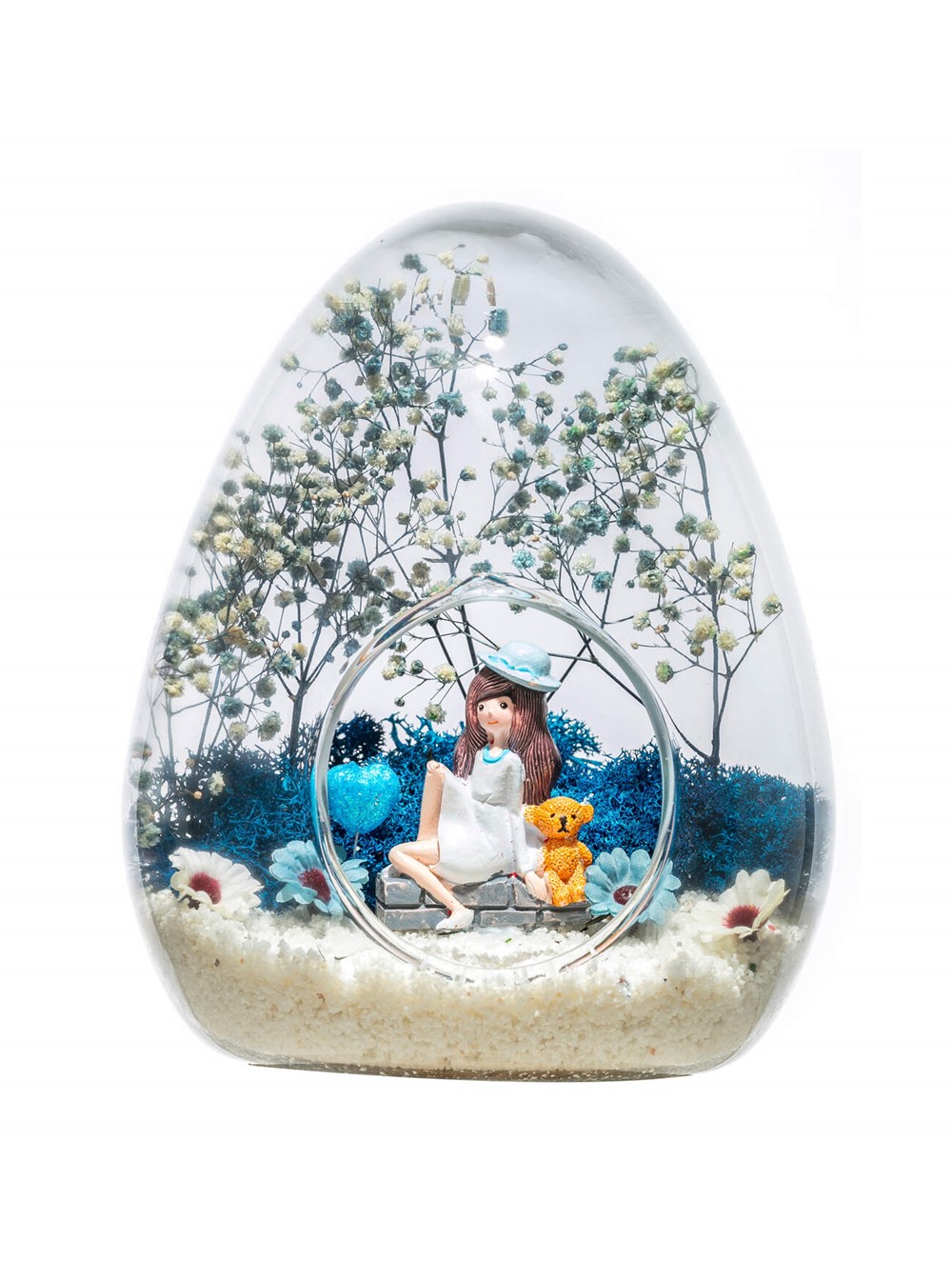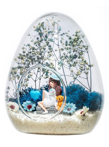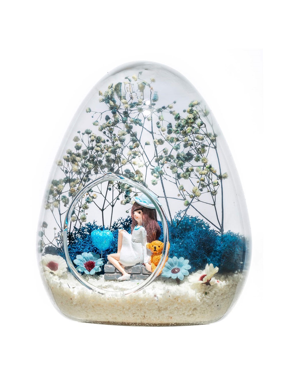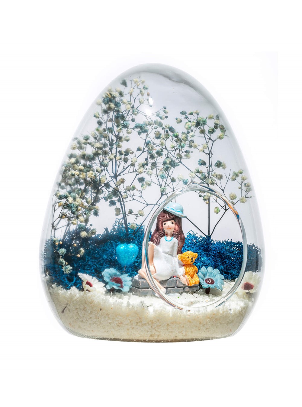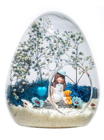 Küçük boy yumurta cam fanus içerisinde tasarladığımız teraryum; beyaz kum, şoklanmış yosunlar, yapay çiçekler, bir adet kalpve genç kızobjeleriyle tamamlanmıştır.Ev ve ofis ortamlarının tamamında sergilenebilir teraryumun içinde canlı bitki bulunmadığından, herhangi bir bakıma ihtiyacı yoktur. Özellikle her ortamda yıllarca, zevkle izlenebilecek özel bir teraryumdur.Yaklaşık Ölçüleri: 18x22cmNOT: Teraryumlarda kullanılan camlar, üfleme cam işçiliğiyle üretildiğinden bazı detaylarda farklılıklar gözlenebilir. Örneğin, sap kısmı ve ağız bitiş noktalarının her biri kendine özgüdür.
