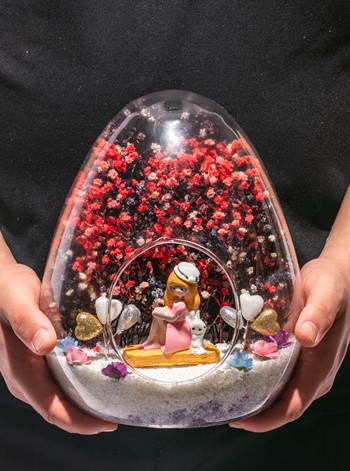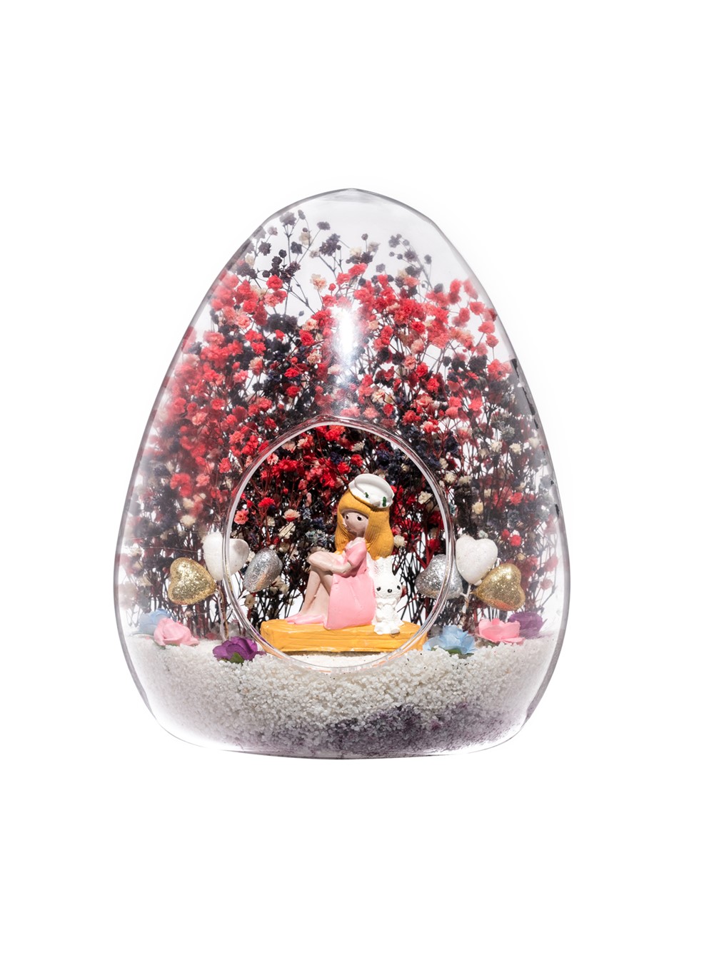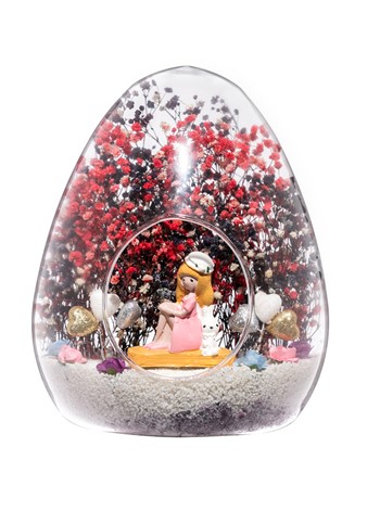 Küçük boy yumurta cam fanus içerisinde tasarladığımız bu özgün teraryum; beyaz kum, karışık renkli kurutulmuş bitkiler, renkli simli kalpler, renkli yapay mini güller ve bayan obje kullanılarak tamamlanmıştır. Ev ve ofis ortamlarının tamamında sergilenebilir teraryumun içinde, kurutulmuş bitkiler olduğundan hava alması önemlidir. Açık olan kısmının kapatılmaması veya büfe vb. kapalı alanlara konulmaması gereklidir. Özellikle her ortamda, zevkle izlenebilecek özel bir teraryumdur. Yaklaşık Ölçüleri: 18x22cm NOT: Teraryumlarda kullanılan camlar, üfleme cam işçiliğiyle üretildiğinden bazı detaylarda farklılıklar gözlenebilir. Örneğin, ağız bitiş noktalarının her biri kendine özgüdür.