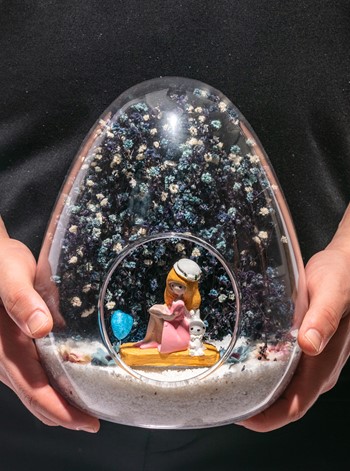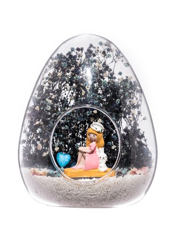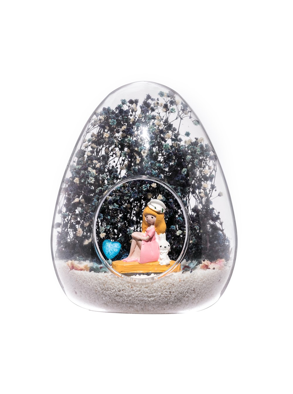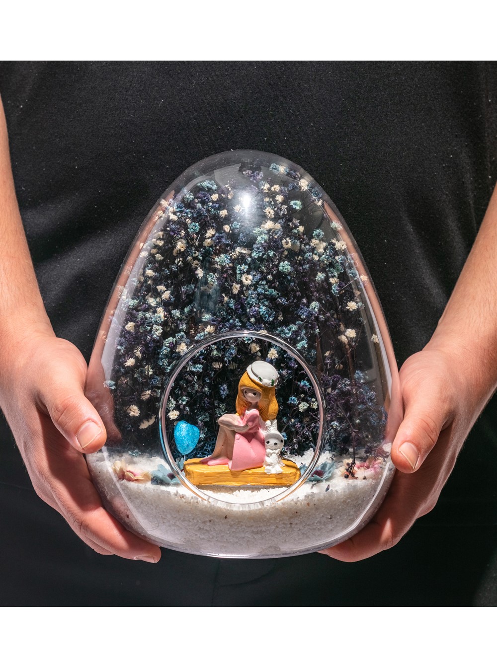 Küçük boy yumurta cam fanus içerisinde tasarladığımız bu özgün teraryum; beyaz kum, kurutulmuş bitkiler, şoklanmış yosunlar, bir adet simli kalp, yapay mini çiçekler ve bayan obje kullanılarak tamamlanmıştır. Ev ve ofis ortamlarının tamamında sergilenebilir teraryumun içinde, kurutulmuş bitkiler olduğundan hava alması önemlidir. Açık olan kısmının kapatılmaması veya büfe vb. kapalı alanlara konulmaması gereklidir. Özellikle her ortamda, zevkle izlenebilecek özel bir teraryumdur. Yaklaşık Ölçüleri: 18x22cm NOT: Teraryumlarda kullanılan camlar, üfleme cam işçiliğiyle üretildiğinden bazı detaylarda farklılıklar gözlenebilir. Örneğin, ağız bitiş noktalarının her biri kendine özgüdür.