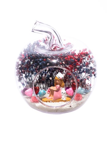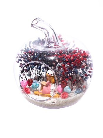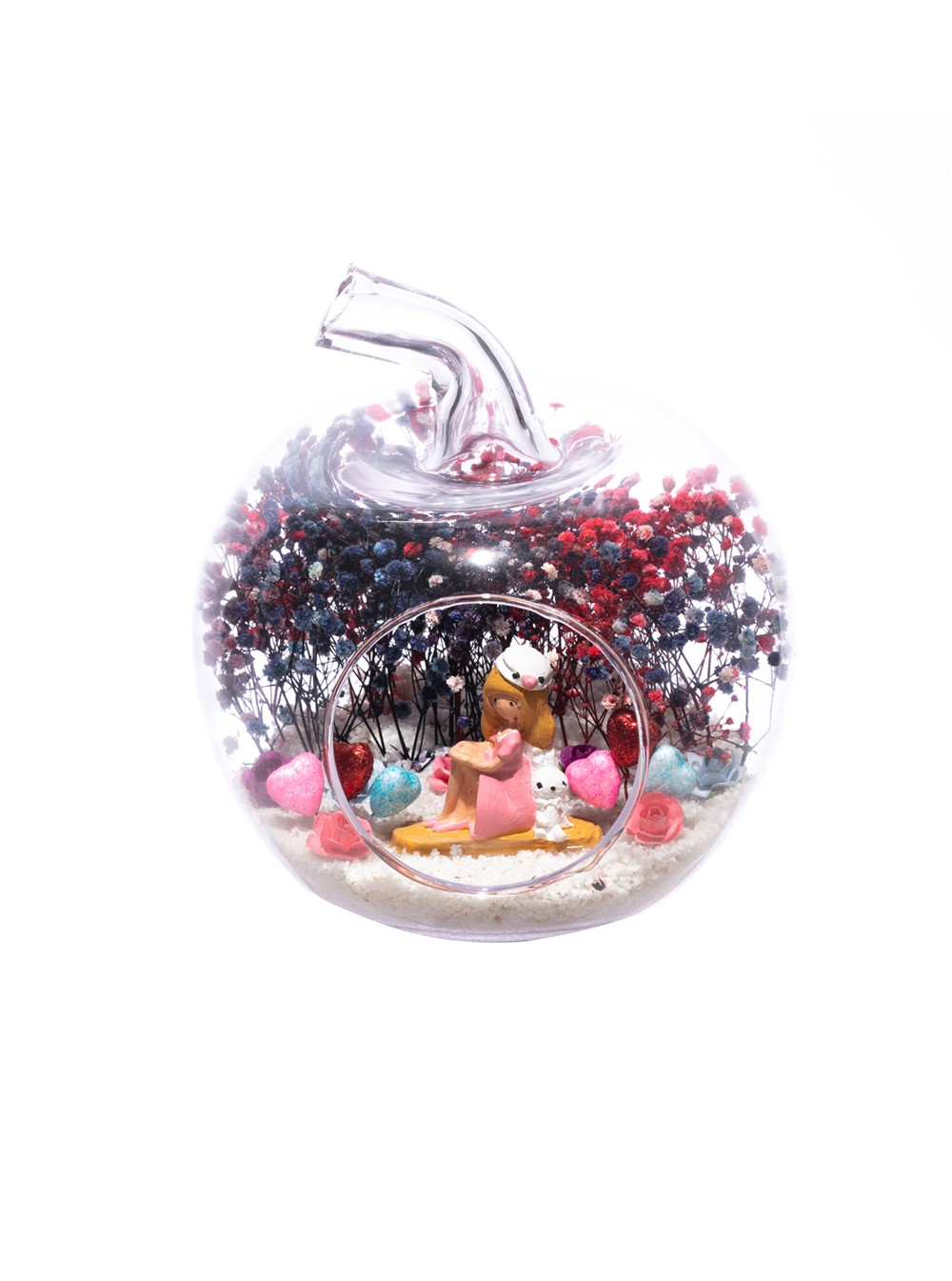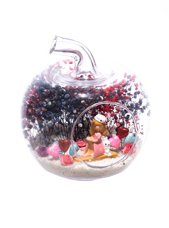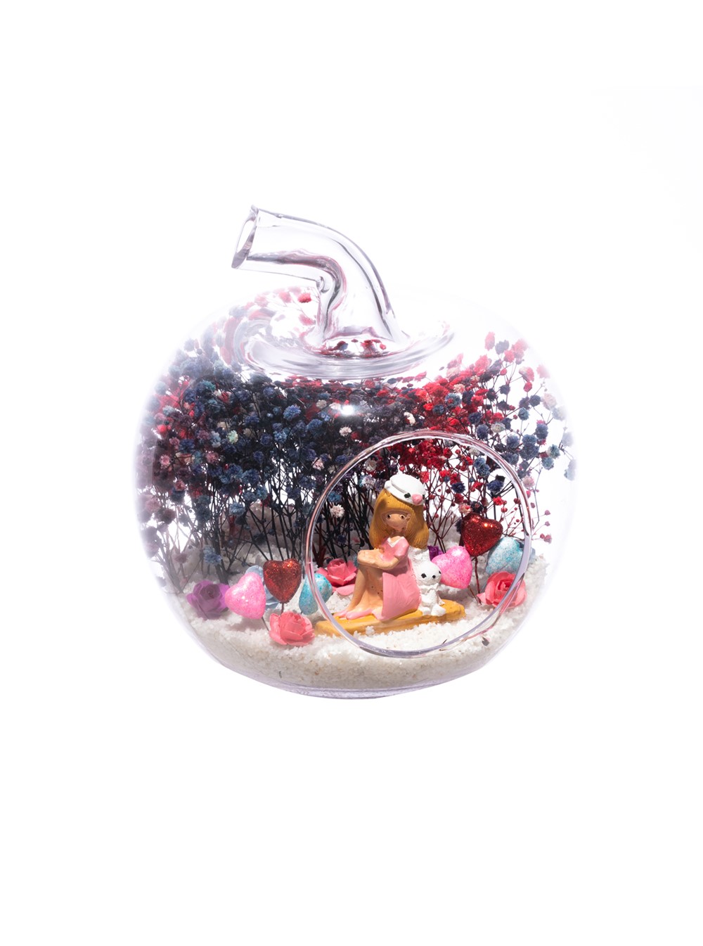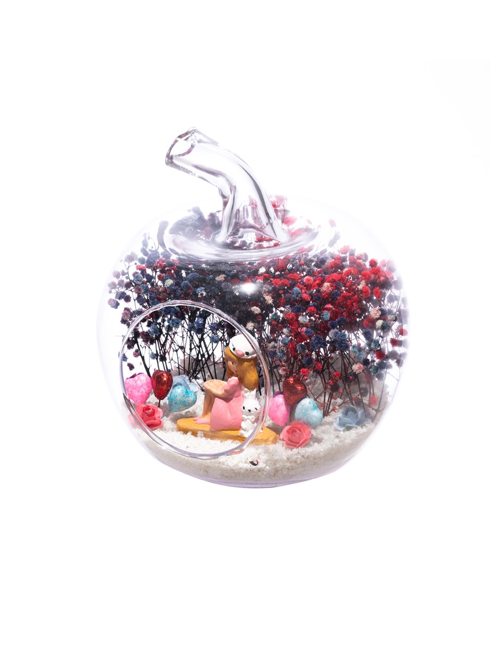 Küçük boy elma cam fanus içerisinde tasarladığımız bu çok güzel teraryum; beyaz kum, karışık renkli kurutulmuş bitkiler, renkli mini yapay güller, renkli simli kalpler ve bir adet sarışın genç kızı simgeleyen objeler kullanılarak tamamlanmıştır. Ev ve ofis ortamlarının tamamında sergilenebilir teraryumun içinde, kurutulmuş bitkiler bulunduğundan hava alması önemlidir. Açık olan kısmının kapatılmaması veya büfe vb. kapalı alanlara konulmaması gereklidir. Özellikle her ortamda yıllarca, zevkle izlenebilecek özel bir teraryumdur. Yaklaşık Ölçüleri: 20x20cm NOT: Teraryumlarda kullanılan camlar, üfleme cam işçiliğiyle üretildiğinden bazı detaylarda farklılıklar gözlenebilir. Örneğin, sap kısmı ve ağız bitiş noktalarının her biri kendine özgüdür.