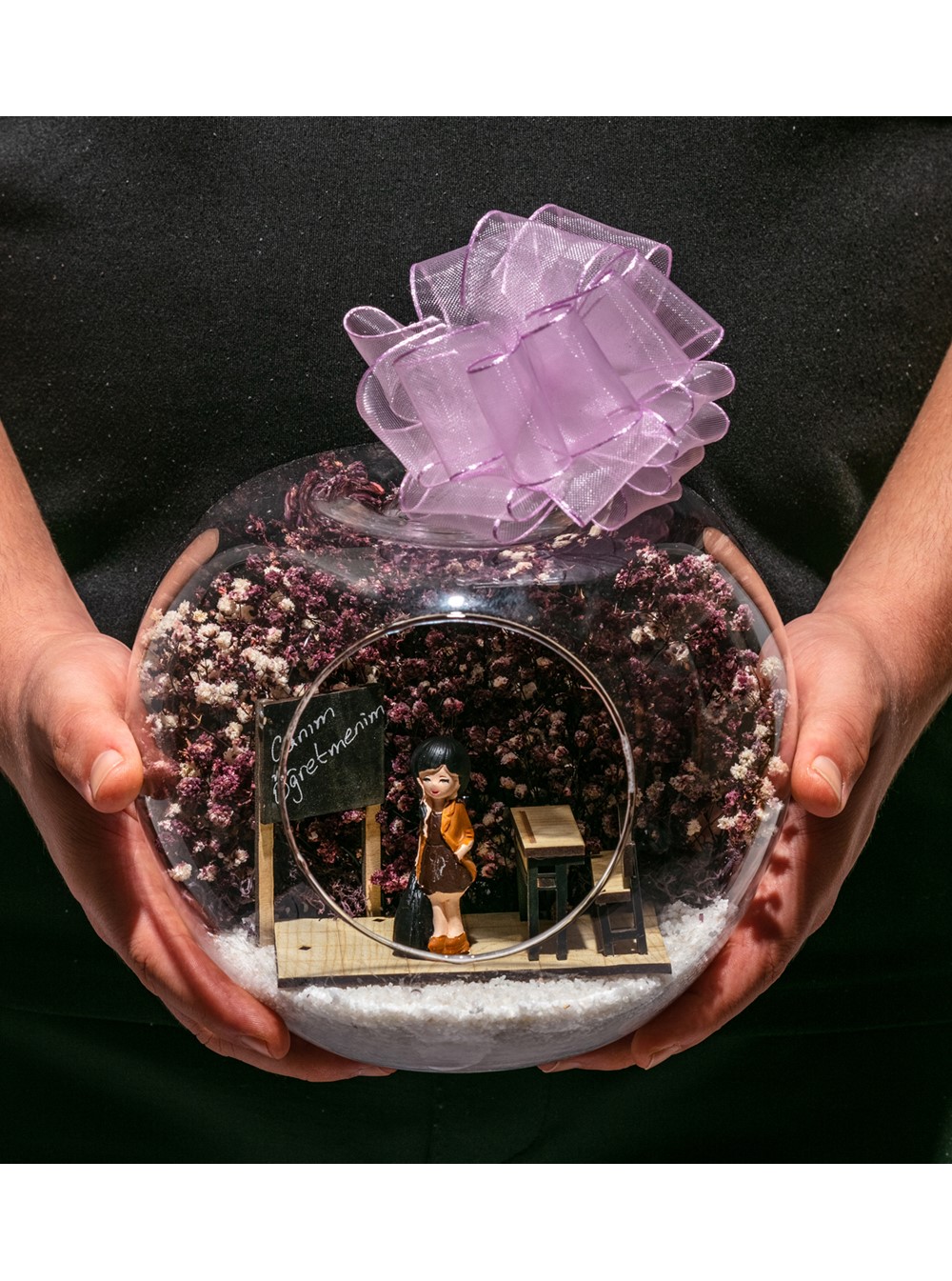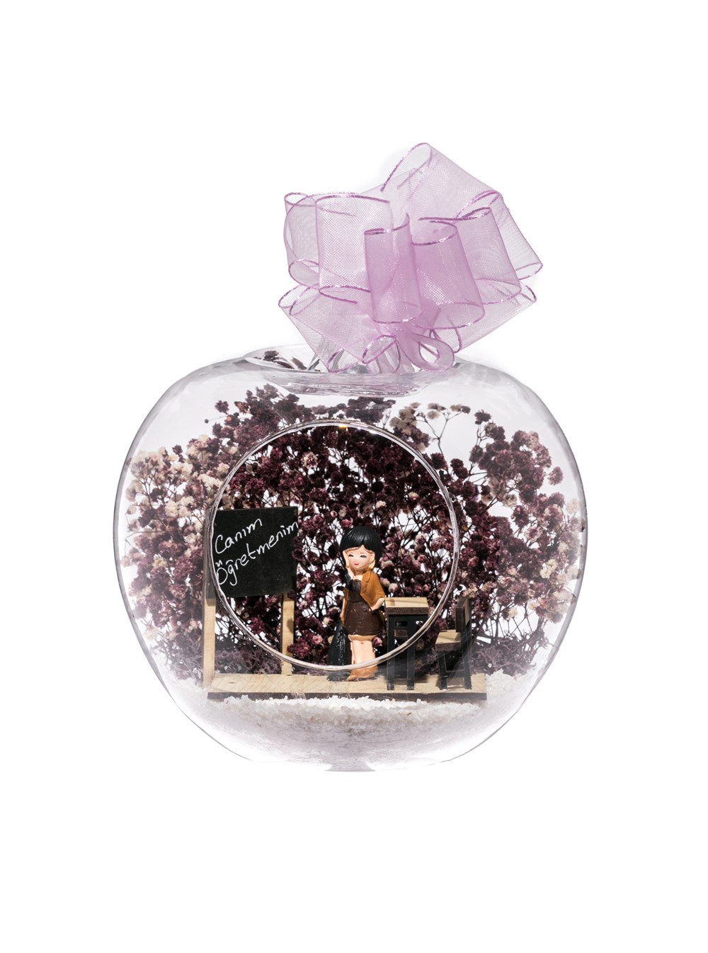 Küçük boy elma cam fanus içerisinde tasarladığımız bu kurdeleli teraryum, sevgili öğretmenlerimizi, gördükleri anda mutlu edecek şekilde tasarlandı. Tasarımımız; beyaz kum, kurutulmuş bitkilerle beraber bir adet CANIM ÖĞRETMENİM yazılı kara tahtalı sınıf görseli ve bir adet bayan objeyle tamamlanmıştır. Ev ve ofis ortamlarının tamamında sergilenebilir teraryumun içinde, kurutulmuş bitkiler bulunduğundan hava alması önemlidir. Açık olan kısmının kapatılmaması veya büfe vb. kapalı alanlara konulmaması gereklidir. Özellikle her ortamda, zevkle izlenebilecek çok özel bir teraryumdur. Yaklaşık Ölçüleri: 20x20cm NOT: Teraryumlarda kullanılan camlar, üfleme cam işçiliğiyle üretildiğinden bazı detaylarda farklılıklar gözlenebilir. Örneğin, sap kısmı ve ağız bitiş noktalarının her biri kendine özgüdür.