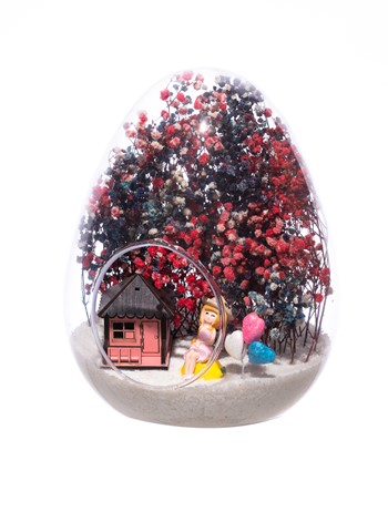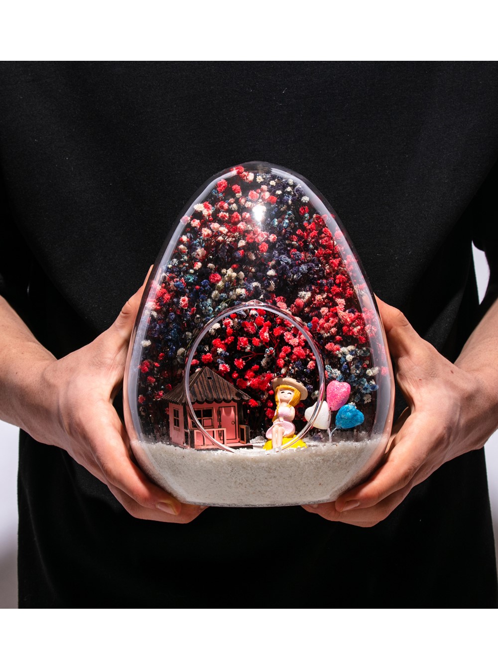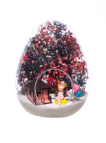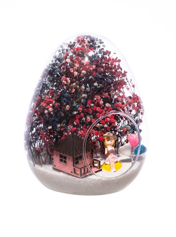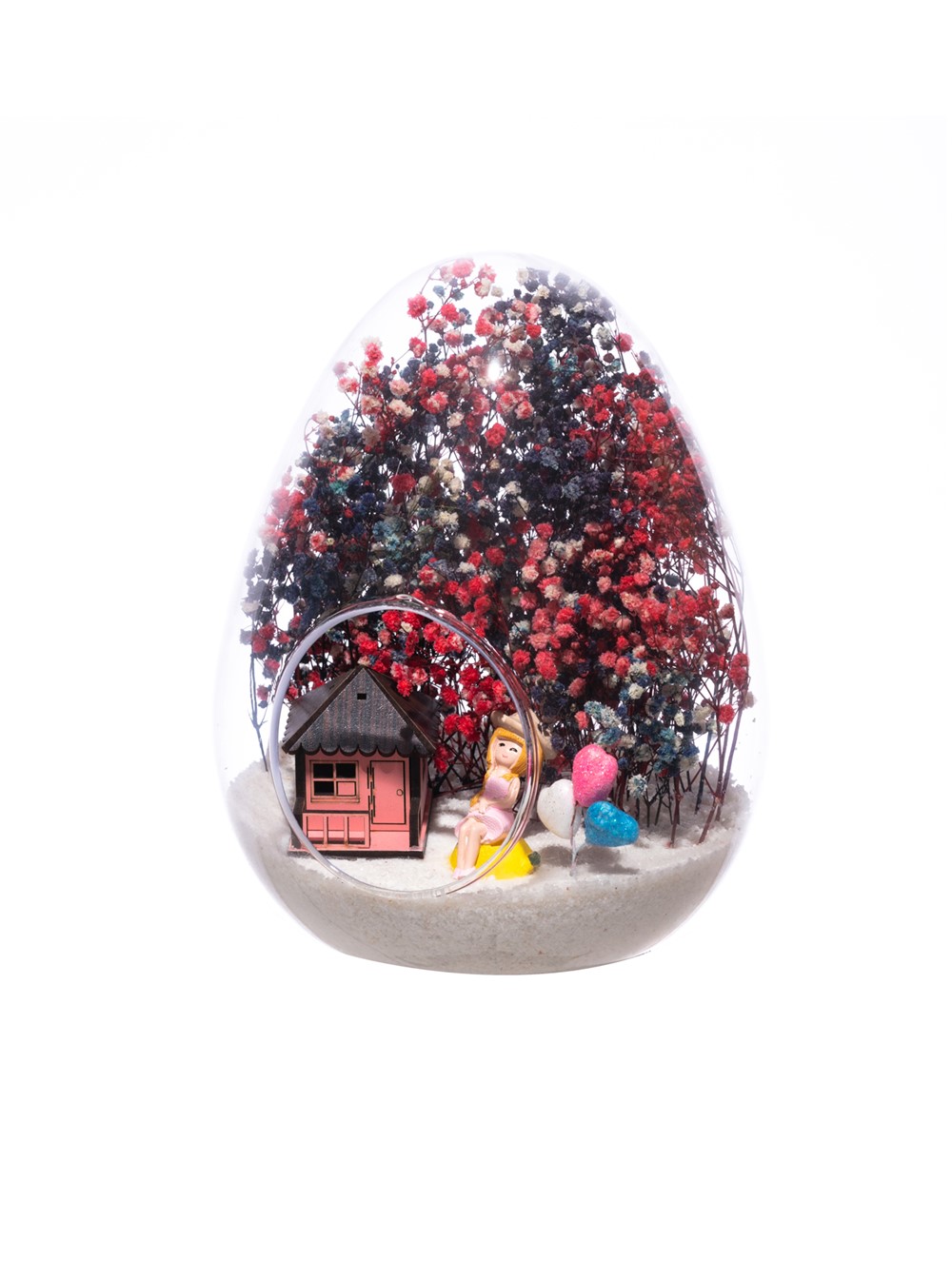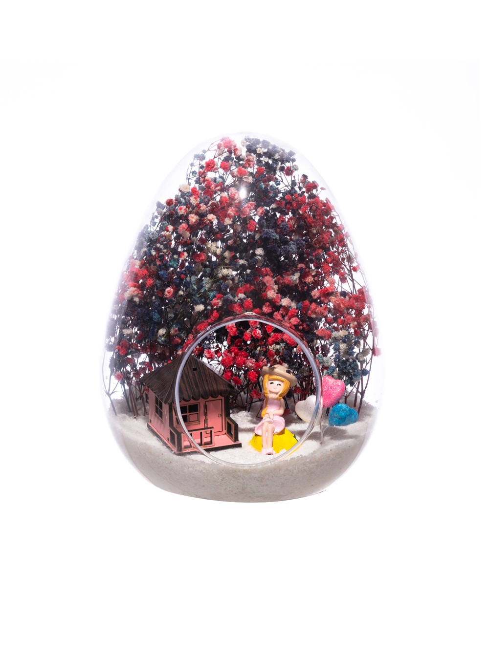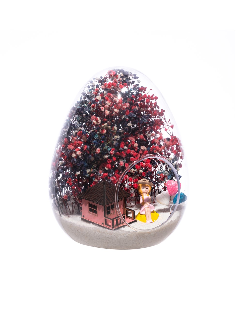 Küçük boy yumurta cam fanus içerisinde tasarladığımız, bu özgün teraryum; beyaz kum, karışık renkli kurutulmuş bitkiler, renkli simli kalpler, bir adet ahşap ev ve bir adet genç kızı simgeleyen objeler kullanılarak tamamlanmıştır. Ev ve ofis ortamlarının tamamında sergilenebilir teraryumun içinde, kurutulmuş ve şoklanmış bitkiler olduğundan hava alması önemlidir. Açık olan kısmının kapatılmaması veya büfe vb. kapalı alanlara konulmaması gereklidir. Özellikle her ortamda yıllarca, zevkle izlenebilecek özel bir teraryumdur. Yaklaşık Ölçüleri: 18x22cm NOT: Teraryumlarda kullanılan camlar, üfleme cam işçiliğiyle üretildiğinden bazı detaylarda farklılıklar gözlenebilir. Örneğin, ağız bitiş noktalarının her biri kendine özgüdür.