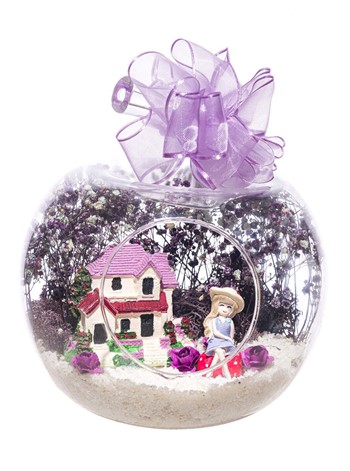 Kurdele takılı küçük boy elma cam fanus içerisinde tasarladığımız bu çok güzelteraryum; beyaz kum, şoklanmış yosunlar, kurutulmuş bitkiler, yapay çiçekler, bir adet taş ev ve bir adet bahçede anın tadını çıkaran kadın objelerle tamamlanmıştır. Ev ve ofis ortamlarının tamamında sergilenebilir teraryumun içinde,kurutulmuş ve şoklanmış bitkiler bulunduğundan hava alması önemlidir. Açık olan kısmının kapatılmaması veya büfe vb. kapalı alanlara konulmaması gereklidir. Özellikle her ortamda yıllarca, zevkle izlenebilecek özel bir teraryumdur. Yaklaşık Ölçüleri: 20x20cm NOT: Teraryumlarda kullanılan camlar, üfleme cam işçiliğiyle üretildiğinden bazı detaylarda farklılıklar gözlenebilir. Örneğin, sap kısmı ve ağız bitiş noktalarının her biri kendine özgüdür.