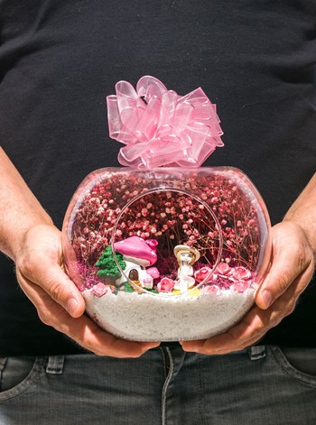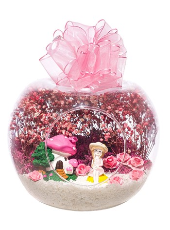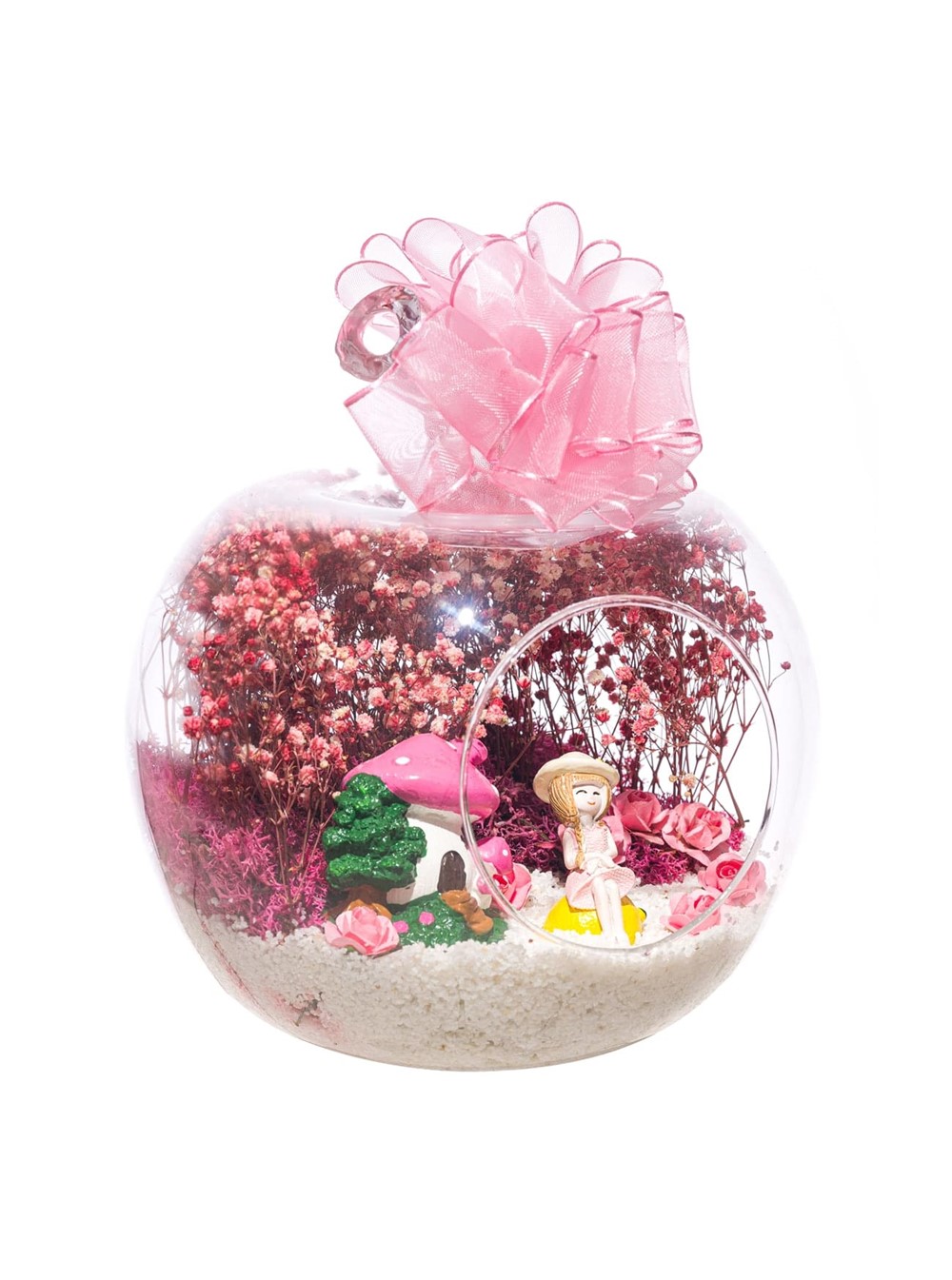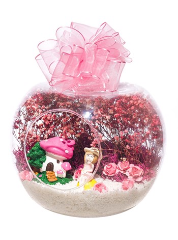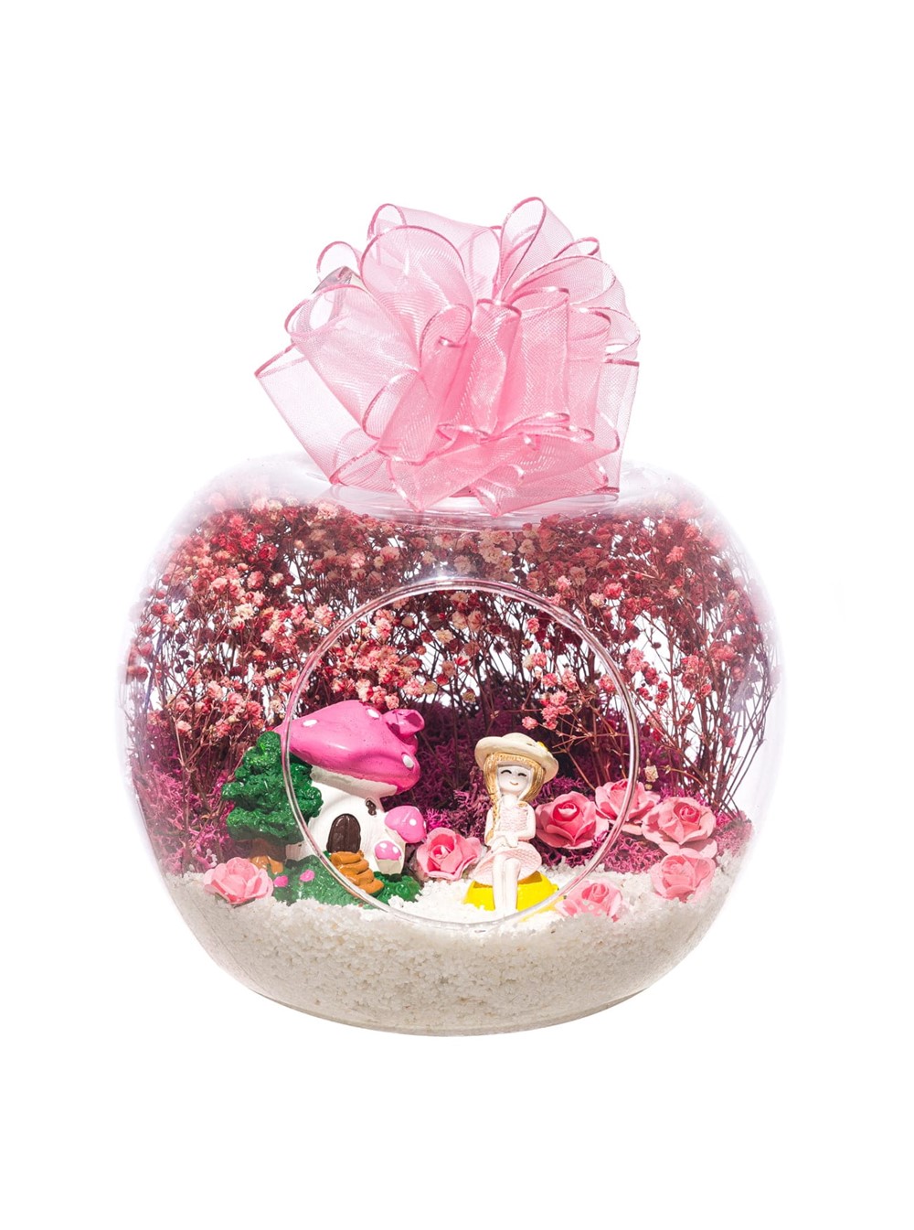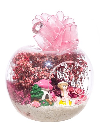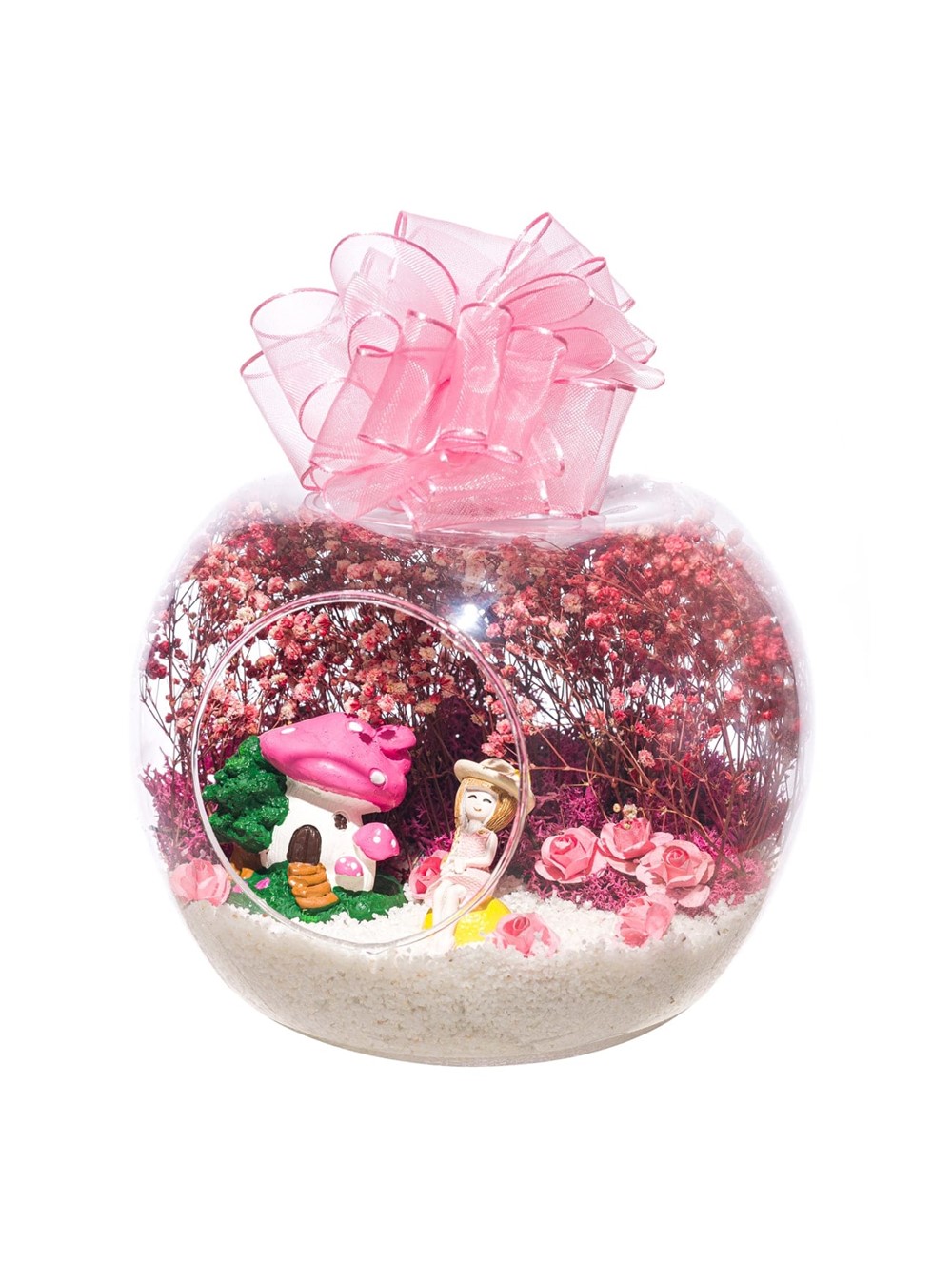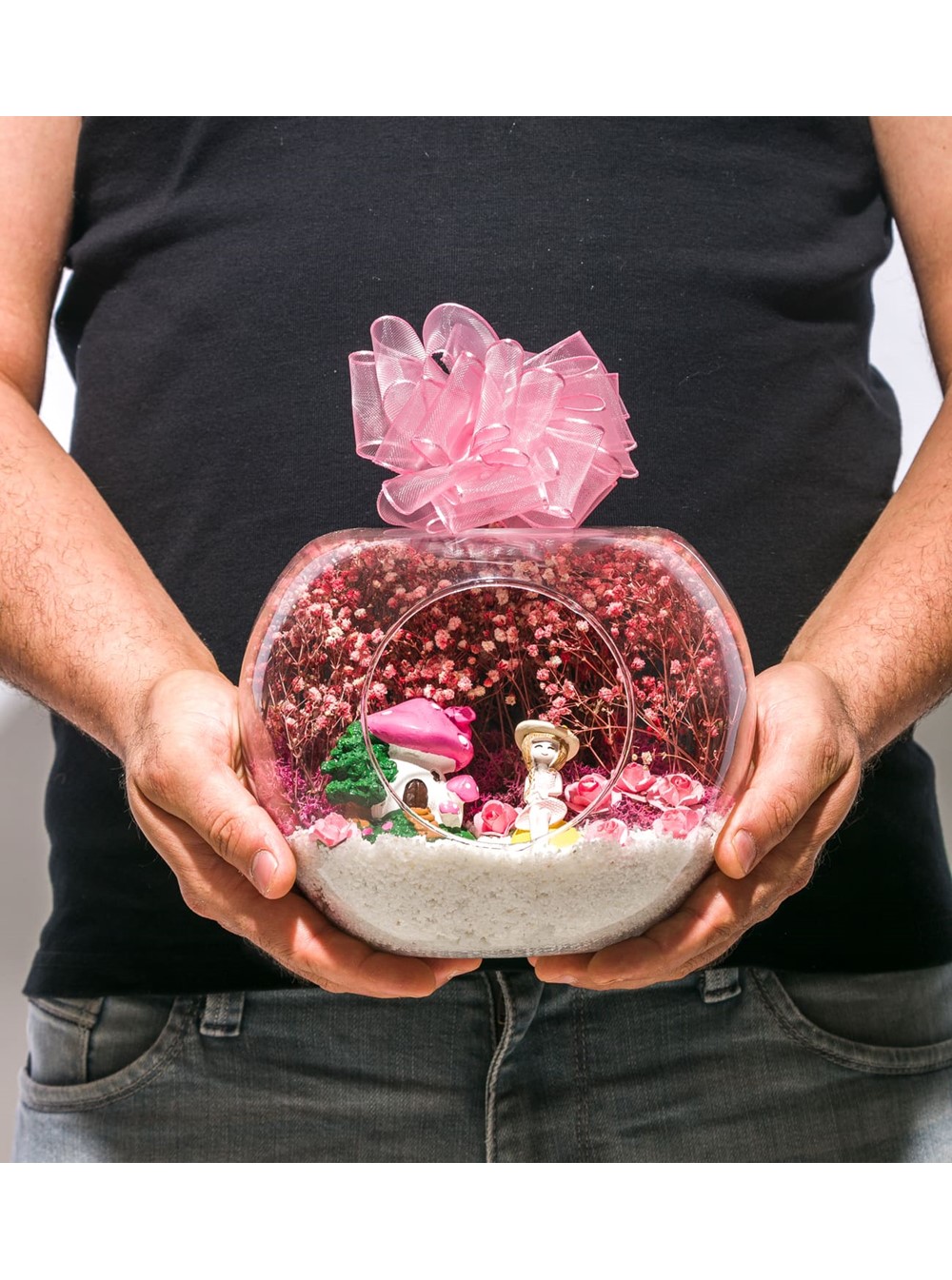 Kurdele takılı küçük boy elma cam fanus içerisinde tasarladığımız bu çok güzel teraryum; beyaz kum, şoklanmış yosunlar, kurutulmuş bitkiler, yapay çiçekler, bir adet taş mantar ev ve bir adet bahçede anın tadını çıkaran kadın objelerle tamamlanmıştır. Ev ve ofis ortamlarının tamamında sergilenebilir teraryumun içinde, kurutulmuş ve şoklanmış bitkiler bulunduğundan hava alması önemlidir. Açık olan kısmının kapatılmaması veya büfe vb. kapalı alanlara konulmaması gereklidir. Özellikle her ortamda yıllarca, zevkle izlenebilecek özel bir teraryumdur. Yaklaşık Ölçüleri: 20x20cm NOT: Teraryumlarda kullanılan camlar, üfleme cam işçiliğiyle üretildiğinden bazı detaylarda farklılıklar gözlenebilir. Örneğin, sap kısmı ve ağız bitiş noktalarının her biri kendine özgüdür. Teraryum Şirin Evim Pembe