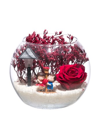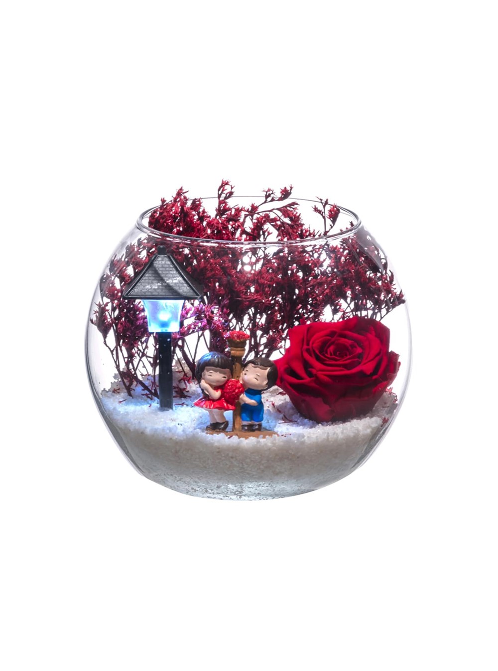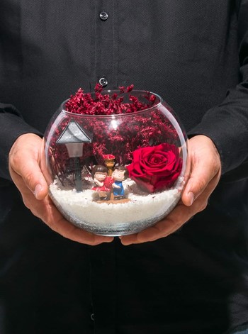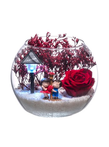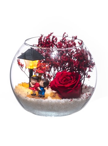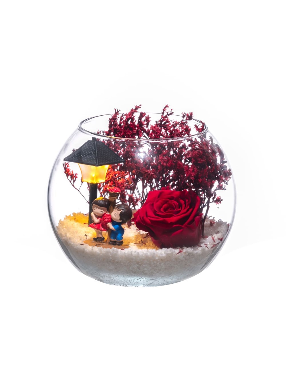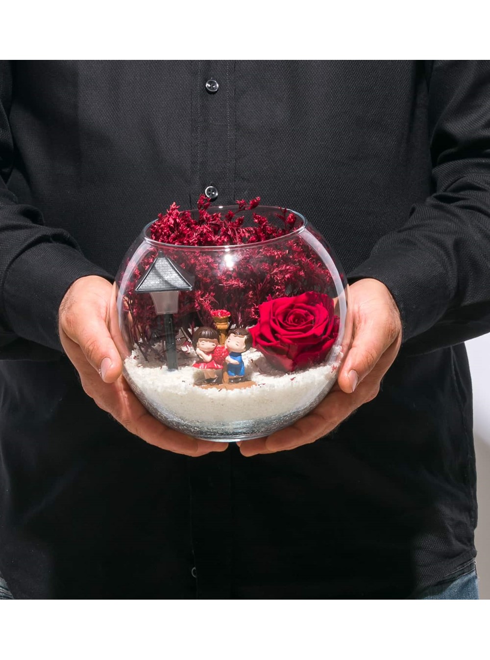 Küçük boy, Paşabahçe cam fanus içerisinde tasarladığımız bu alıcısına özel teraryum; beyaz kum, kurutulmuş bitkiler, bir adet ışığı iki farklı renkte yanan led sokak lambası görseli, bir adet sevgilisine çiçek almış buluşan aşıklar görseli ve bir adet şoklanmış gerçek gül kullanılarak sizler için tasarlanmıştır. Ev ve ofis ortamlarının tamamında sergilenebilir teraryumun içinde kurutulmuş bitkiler bulunduğundan hava alması önemlidir. Açık olan kısmının kapatılmaması veya büfe vb. kapalı alanlara konulmaması gereklidir. Özellikle her ortamda yıllarca, zevkle izlenebilecek özel bir teraryumdur. Yaklaşık Ölçüleri: 16x18 cm