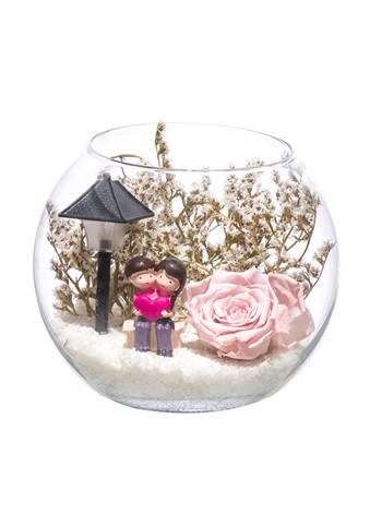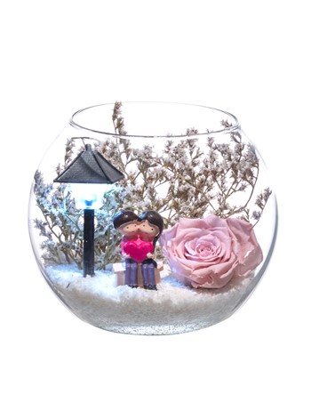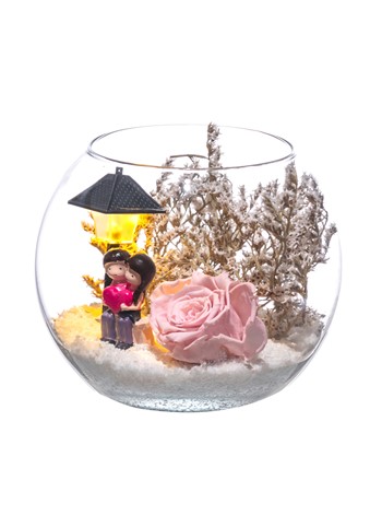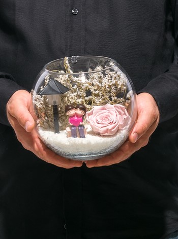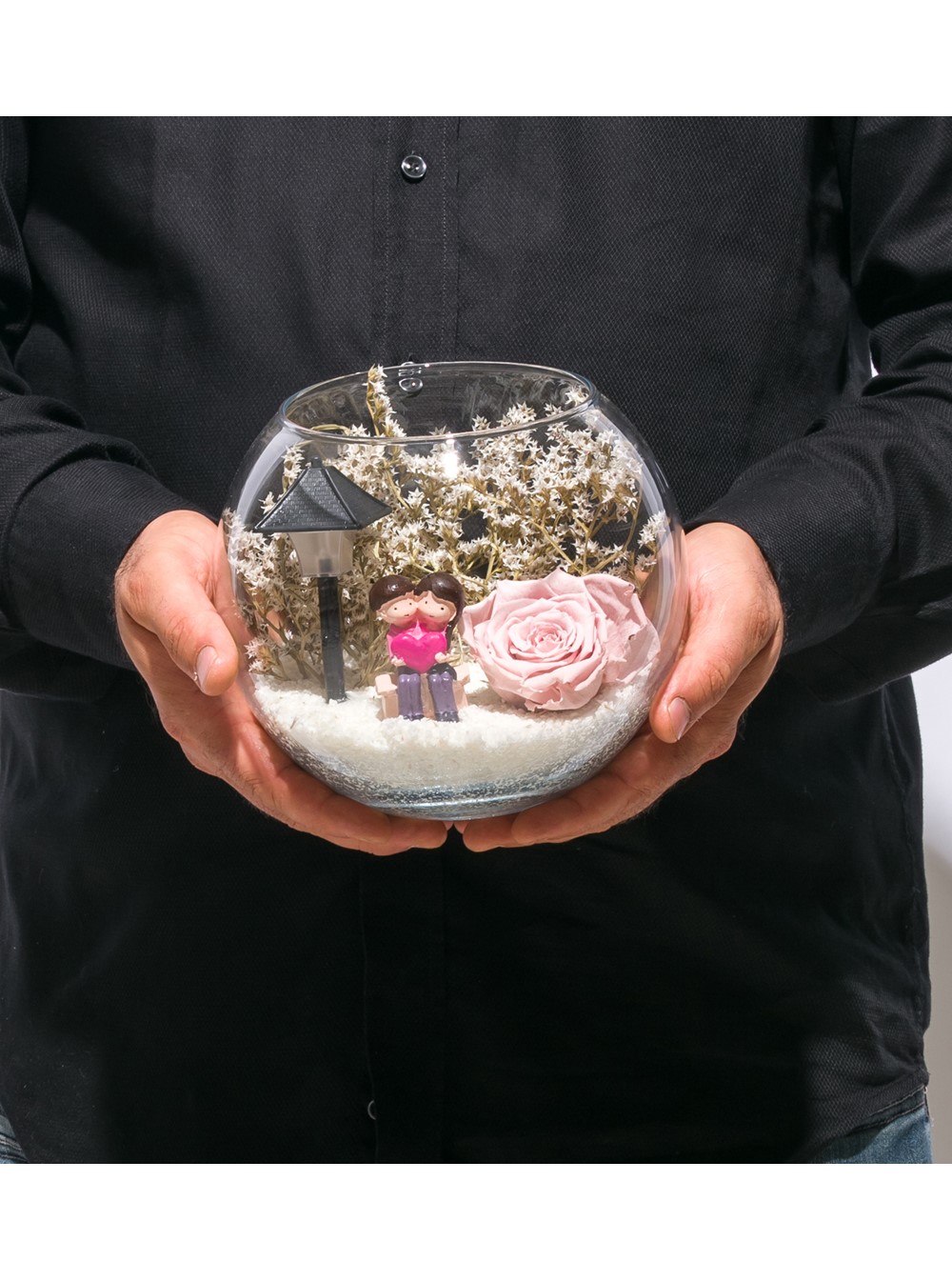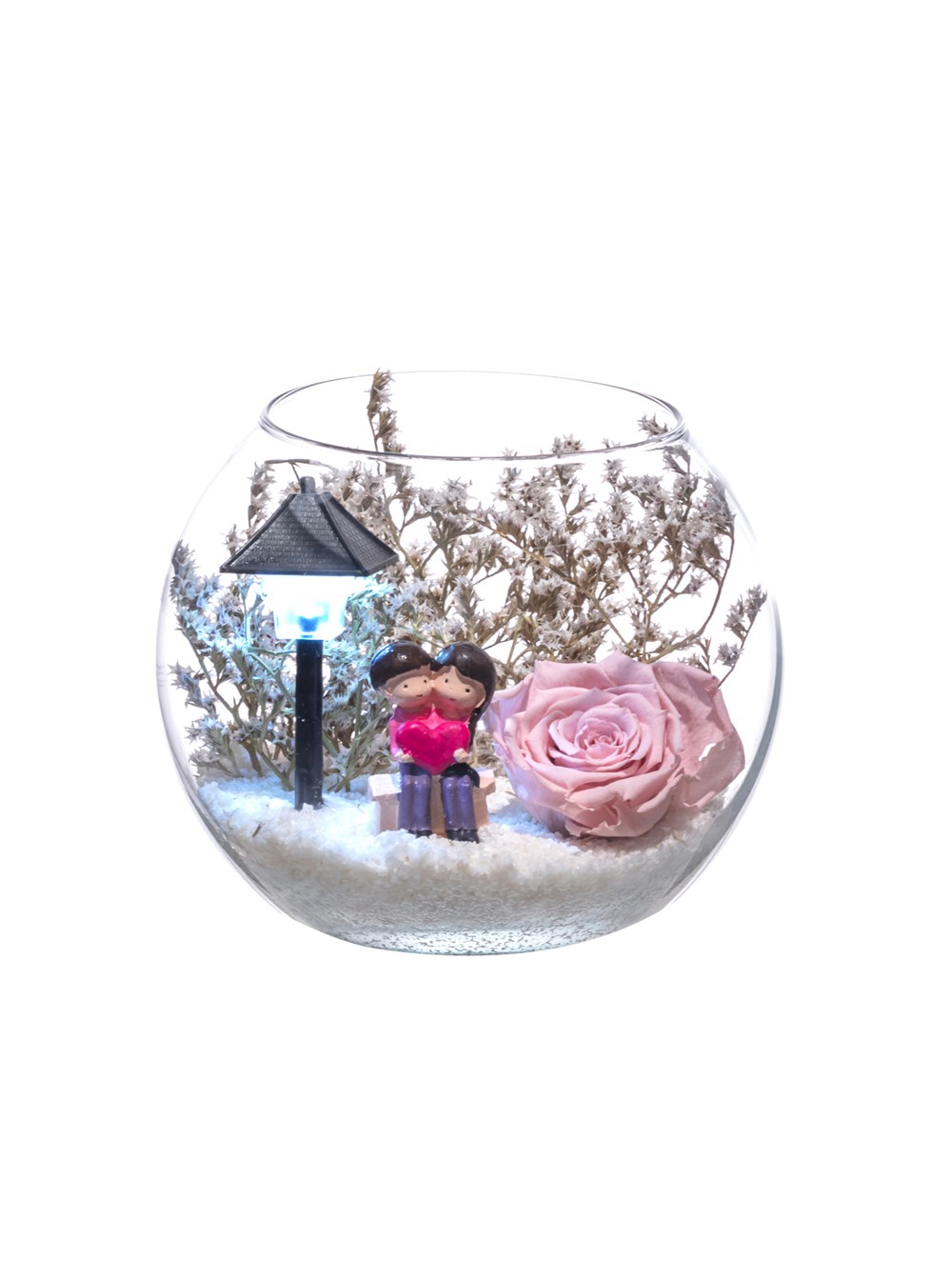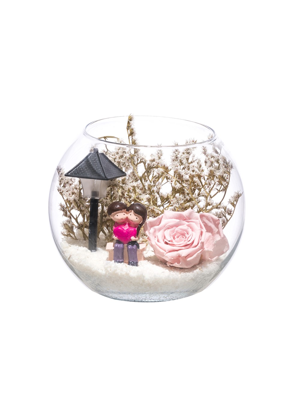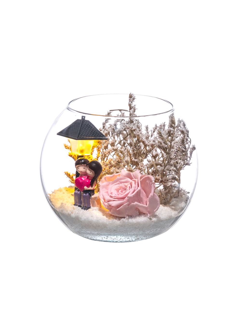 Küçük boy, Paşabahçe cam fanus içerisinde tasarladığımız bu alıcısına özel teraryum; beyaz kum, kurutulmuş bitkiler, bir adet ışığı iki farklı renkte yanan led sokak lambası görseli, bir adet sevgililer görseli ve bir adet şoklanmış gerçek gül kullanılarak sizler için tasarlanmıştır. Ev ve ofis ortamlarının tamamında sergilenebilir teraryumun içinde kurutulmuş bitkiler bulunduğundan hava alması önemlidir. Açık olan kısmının kapatılmaması veya büfe vb. kapalı alanlara konulmaması gereklidir. Özellikle her ortamda yıllarca, zevkle izlenebilecek özel bir teraryumdur. Yaklaşık Ölçüleri: 16x18 cm