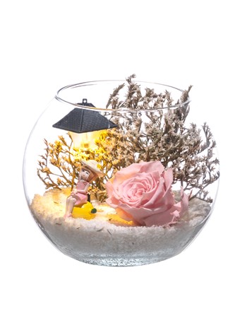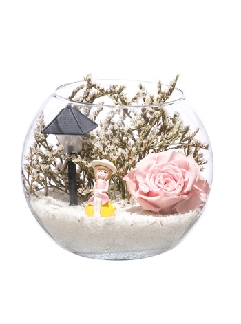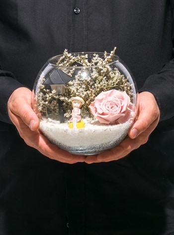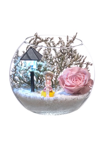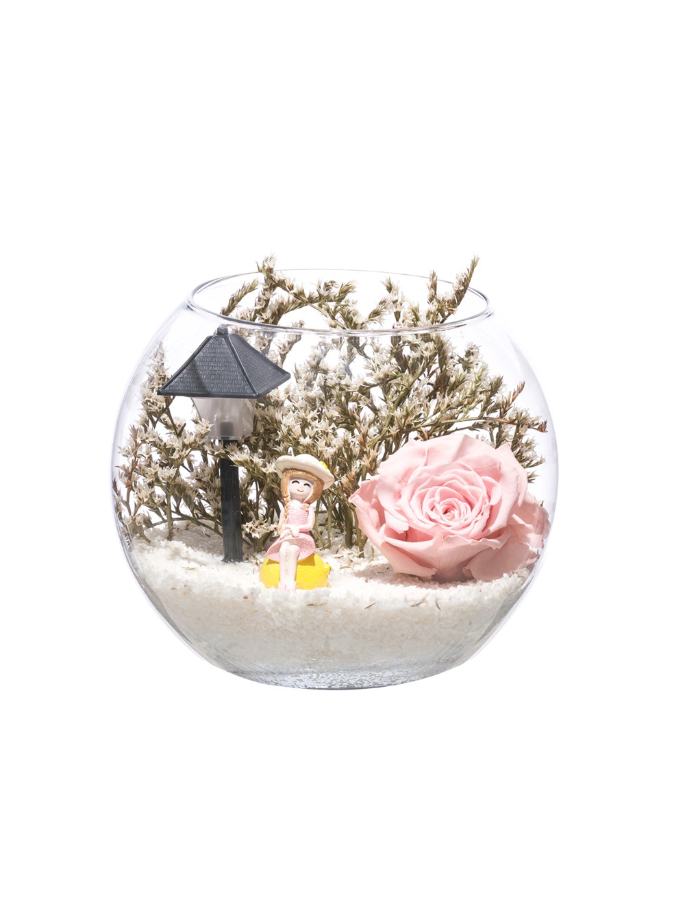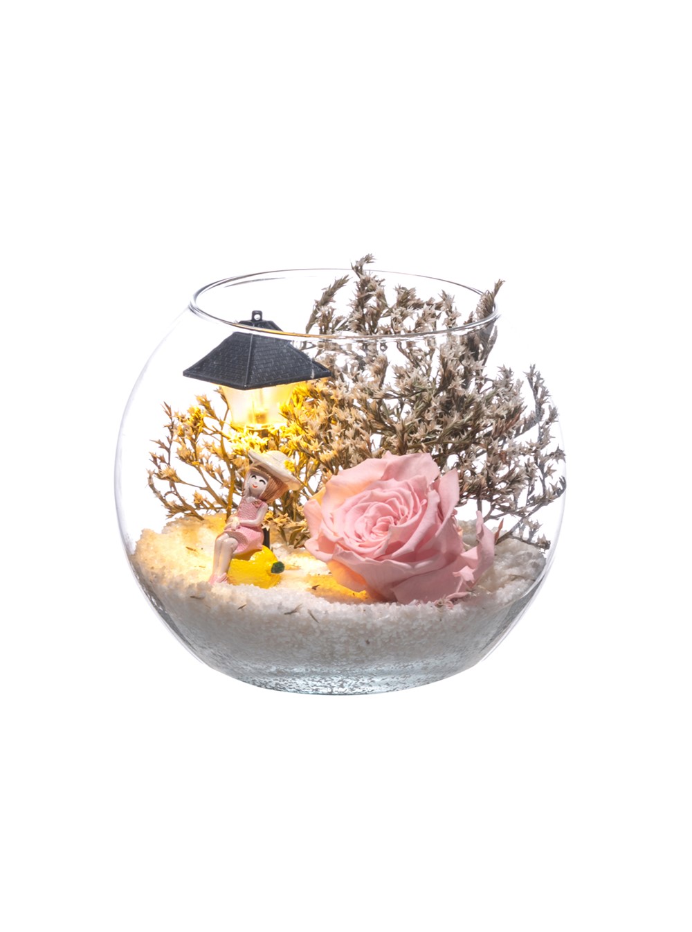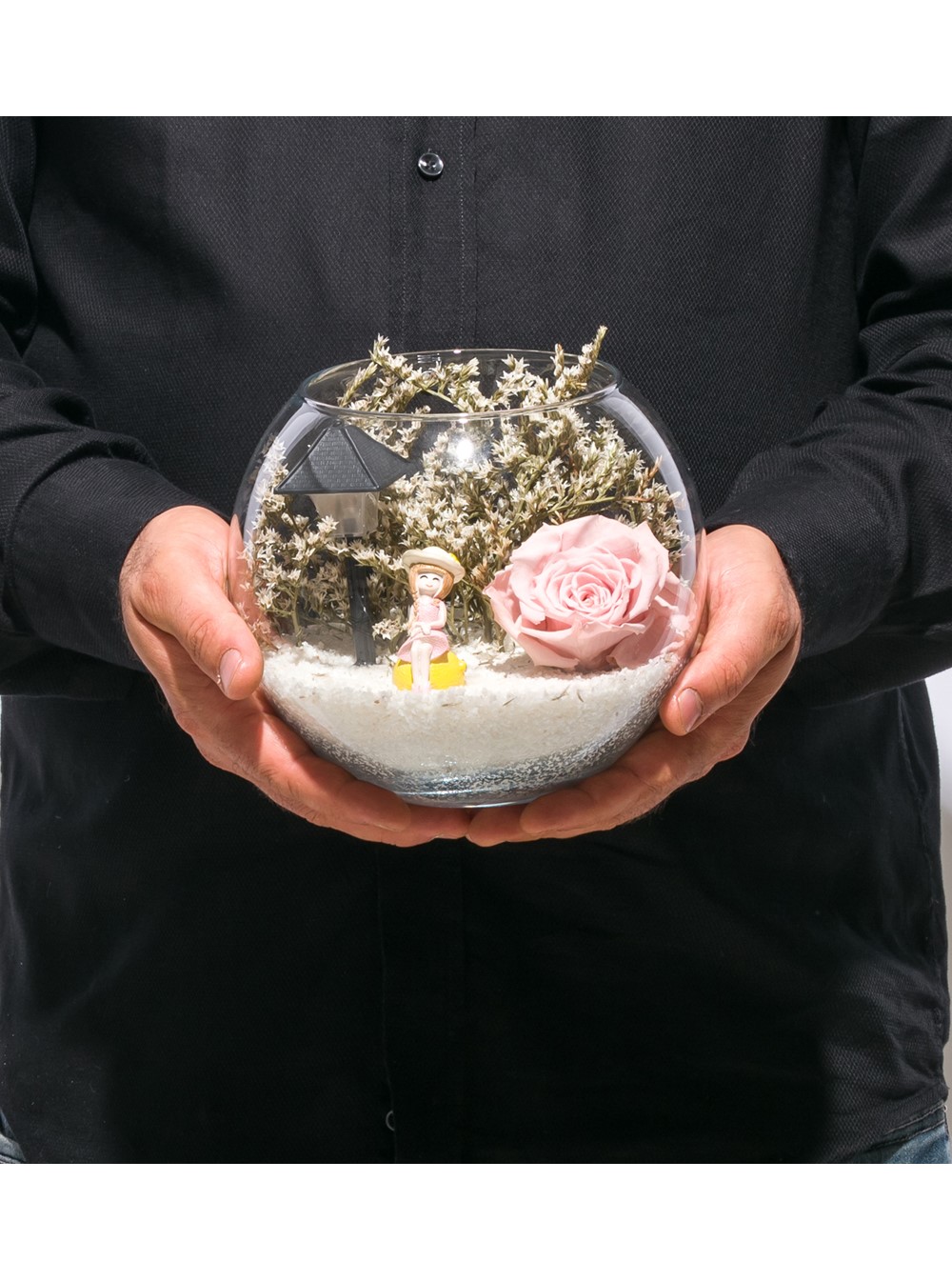 Küçük boy, Paşabahçe cam fanus içerisinde tasarladığımız bu alıcısına özel teraryum; beyaz kum, kurutulmuş bitkiler, bir adet ışığı iki farklı renkte yanan led sokak lambası görseli, bir adet genç kız görseli ve bir adet şoklanmış gerçek gül kullanılarak sizler için tasarlanmıştır. Ev ve ofis ortamlarının tamamında sergilenebilir teraryumun içinde kurutulmuş bitkiler bulunduğundan hava alması önemlidir. Açık olan kısmının kapatılmaması veya büfe vb. kapalı alanlara konulmaması gereklidir. Özellikle her ortamda yıllarca, zevkle izlenebilecek özel bir teraryumdur. Yaklaşık Ölçüleri: 16x18 cm