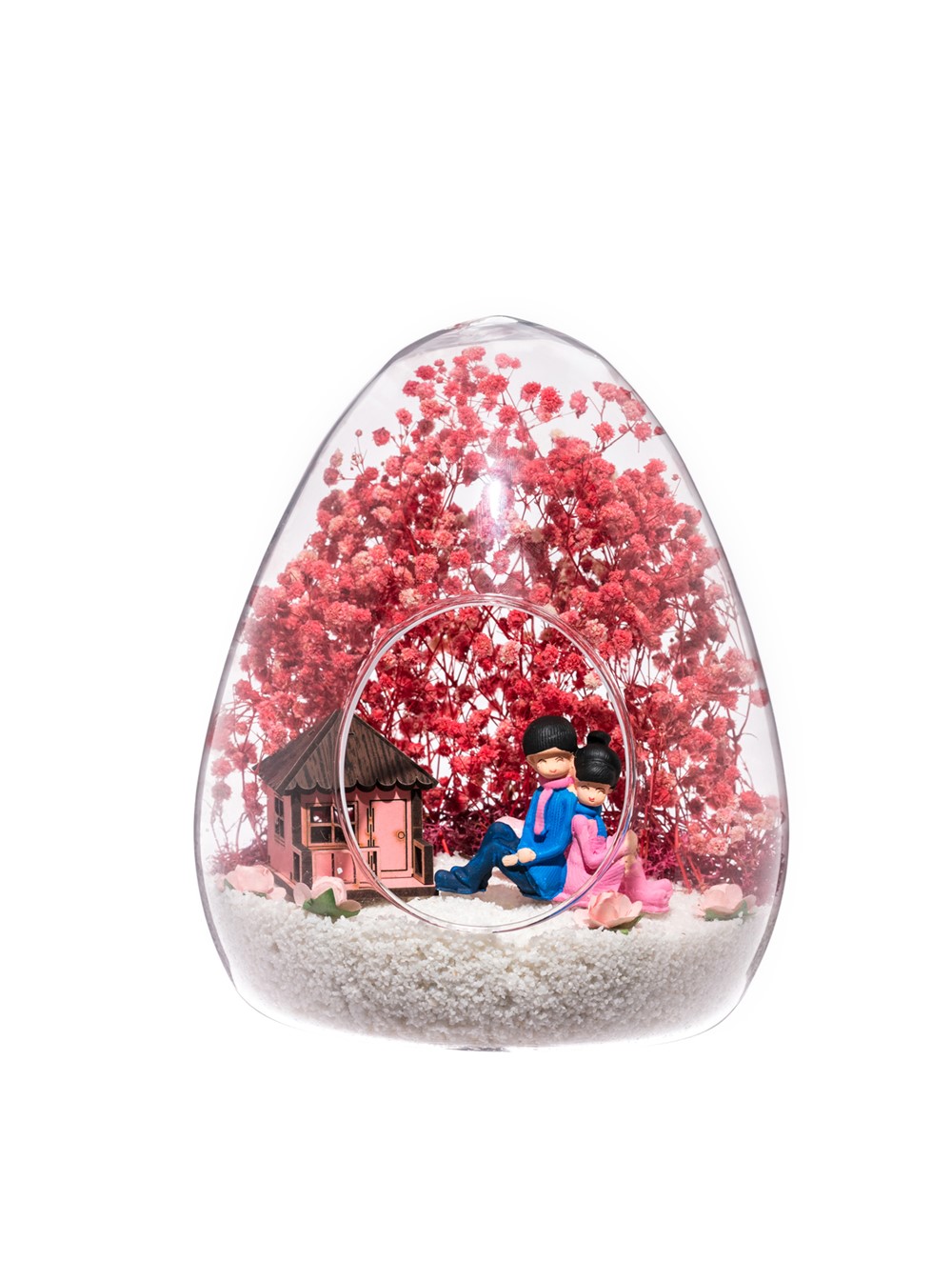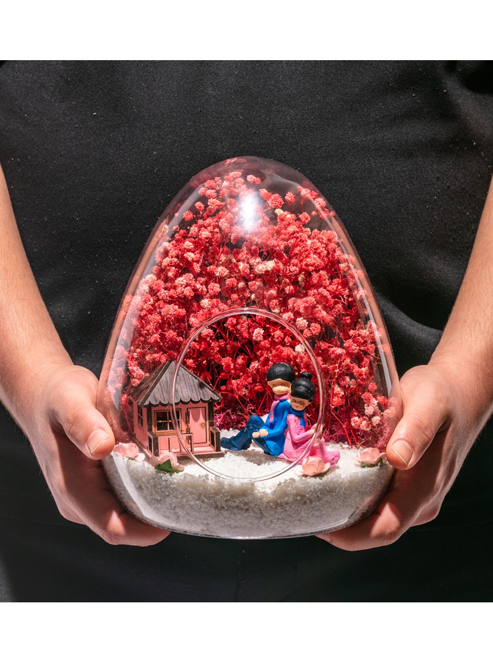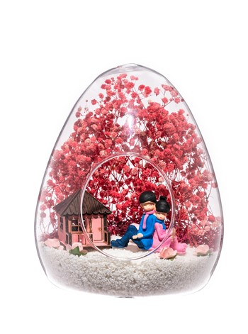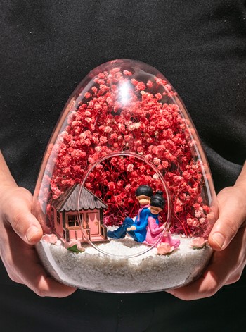 <p> Küçük boy yumurta cam fanus içerisinde tasarladığımız bu güzel teraryum; beyaz kum, kurutulmuş bitkiler, şoklanmış yosunlar, yapay güller, bir adet pembe ahşap ev görseli ve bir adet sırt sırta anı paylaşan sevgilileri simgeleyen obje ile kurgulanarak tamamlanmıştır. Ev ve ofis ortamlarının tamamında sergilenebilir teraryumun içinde, kurutulmuş ve şoklanmış bitkiler bulunduğundan hava alması önemlidir. Açık olan kısmının kapatılmaması veya büfe vb. kapalı alanlara konulmaması gereklidir. Özellikle her ortamda yıllarca, zevkle izlenebilecek özel bir teraryumdur. Yaklaşık Ölçüleri: 18x22cm NOT: Teraryumlarda kullanılan camlar, üfleme cam işçiliğiyle üretildiğinden bazı detaylarda farklılıklar gözlenebilir. Örneğin, yumurta şekli ve ağız bitiş noktalarının her biri kendine özgüdür. Teraryum Sonsuz Aşk 1 Pembe