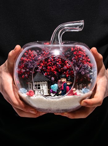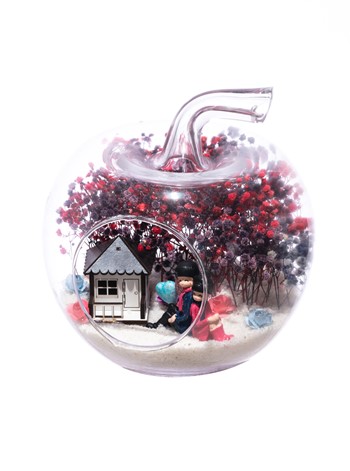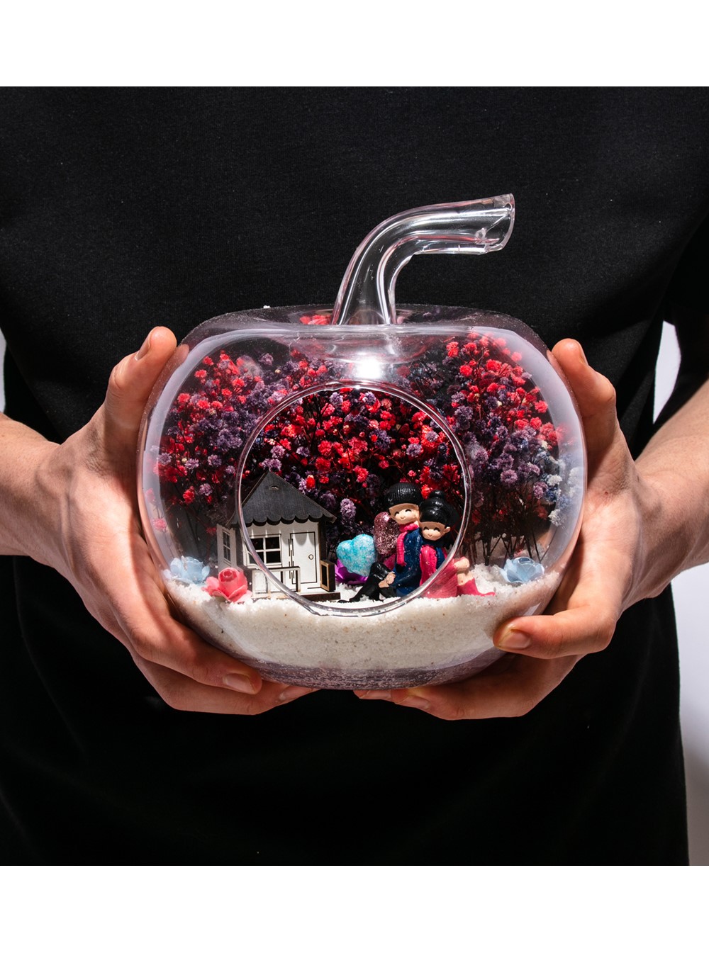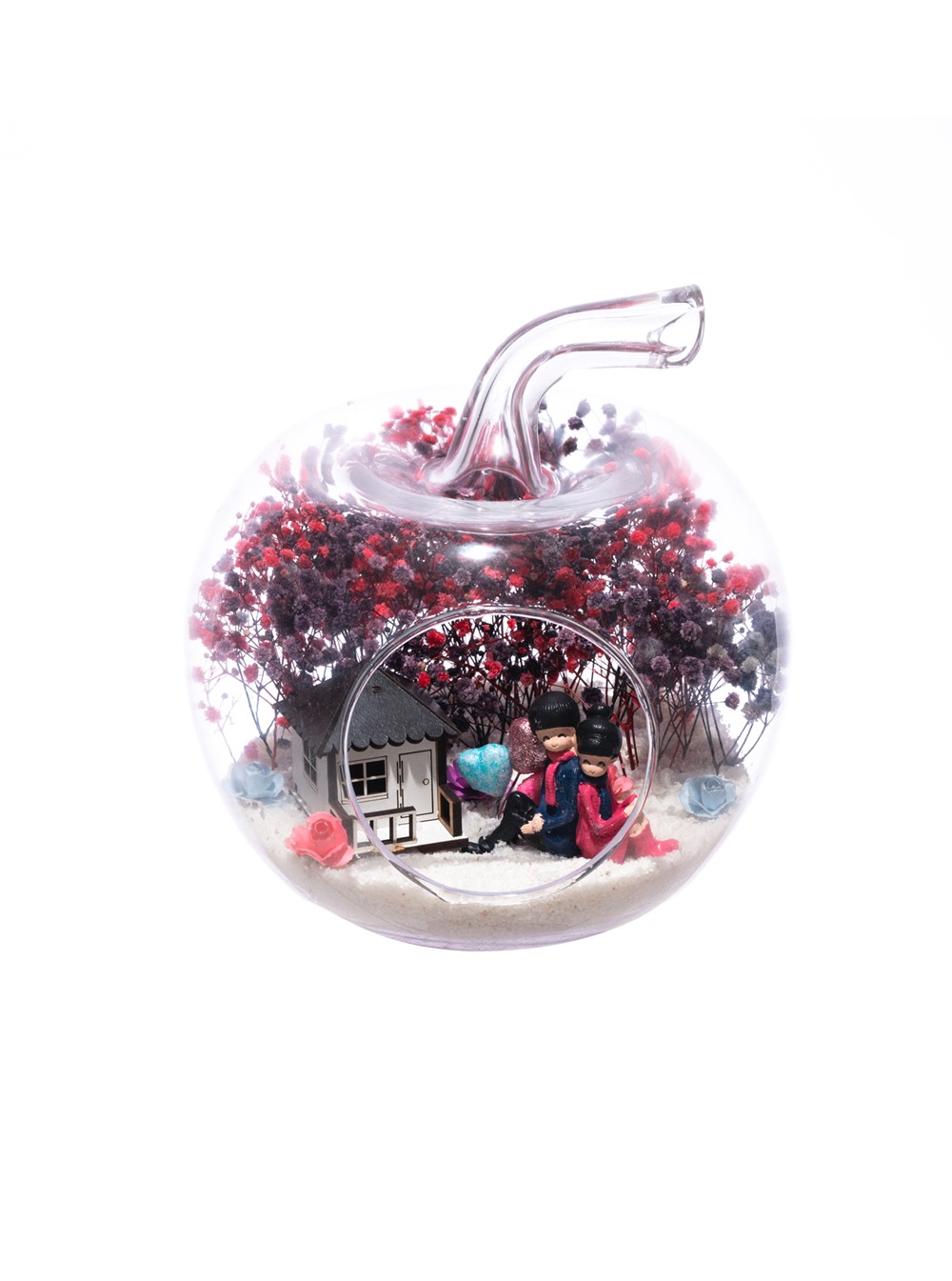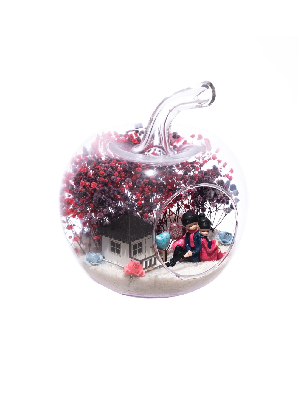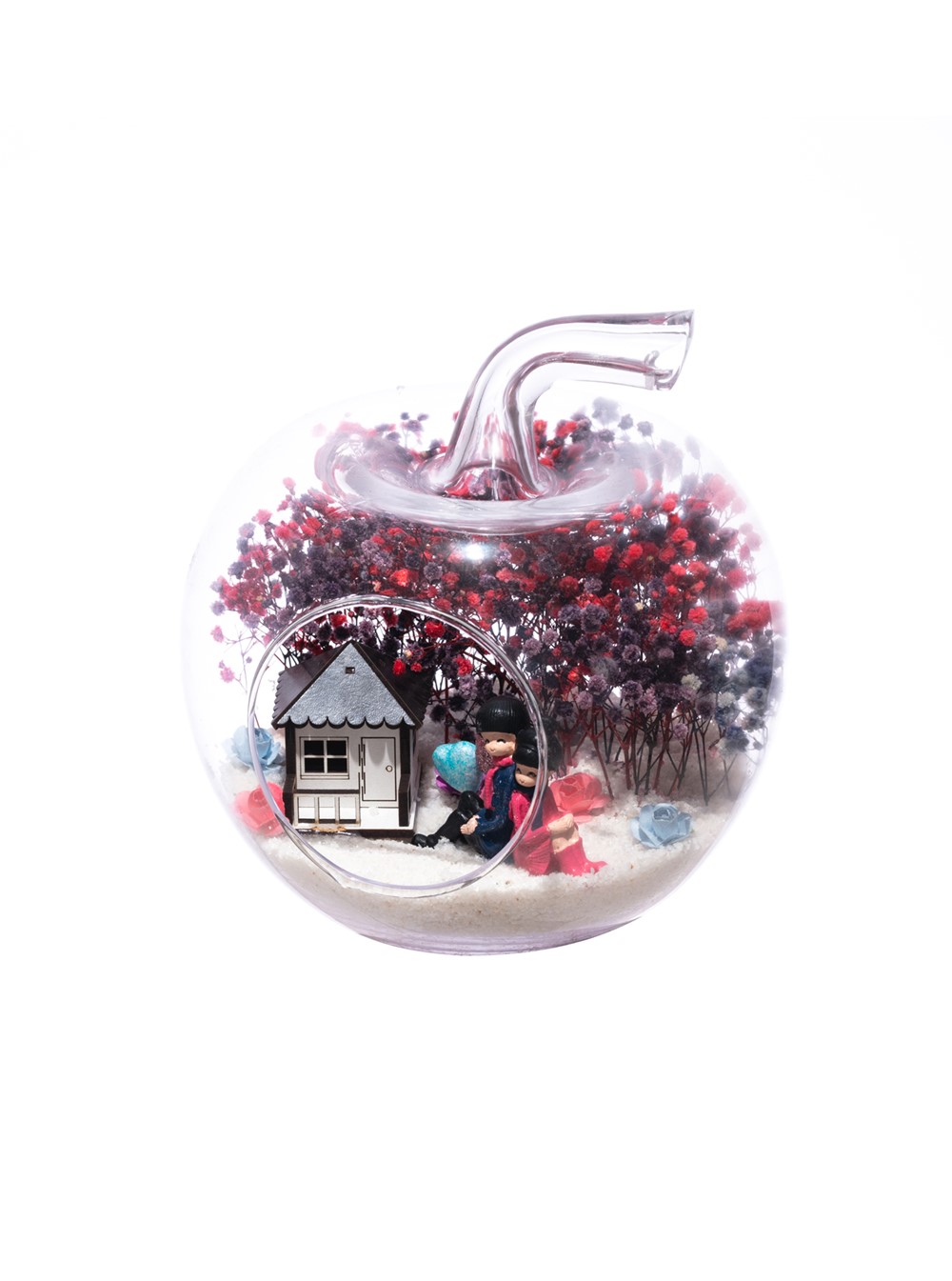 Küçük boy elma cam fanus içerisinde tasarladığımız bu çok güzel teraryum; beyaz kum, karışık renkli kurutulmuş bitkiler, renkli yapay mini güller, simli kalpler, bir adet ahşap ev ve sırt sırta oturmuş, anı paylaşan aşıkları simgeleyen objeler kullanılarak tamamlanmıştır. Ev ve ofis ortamlarının tamamında sergilenebilir teraryumun içinde, kurutulmuş bitkiler bulunduğundan hava alması önemlidir. Açık olan kısmının kapatılmaması veya büfe vb. kapalı alanlara konulmaması gereklidir. Özellikle her ortamda yıllarca, zevkle izlenebilecek özel bir teraryumdur. Yaklaşık Ölçüleri: 20x20cm NOT: Teraryumlarda kullanılan camlar, üfleme cam işçiliğiyle üretildiğinden bazı detaylarda farklılıklar gözlenebilir. Örneğin, sap kısmı ve ağız bitiş noktalarının her biri kendine özgüdür.