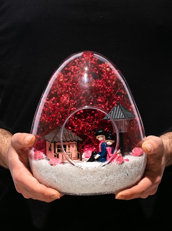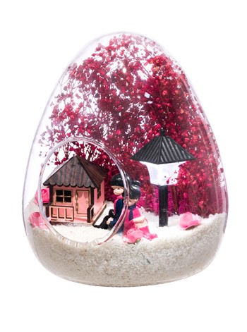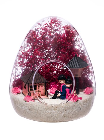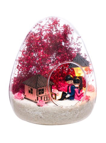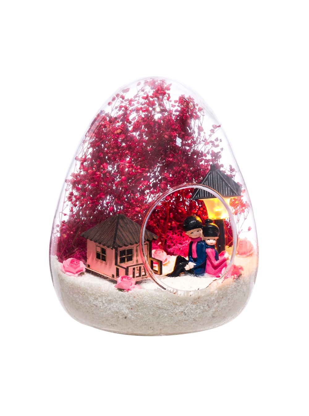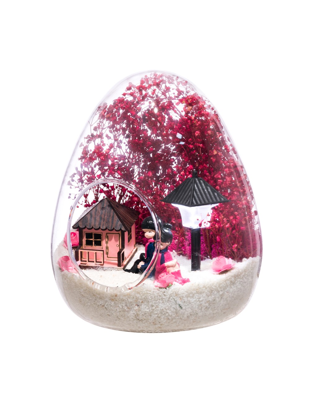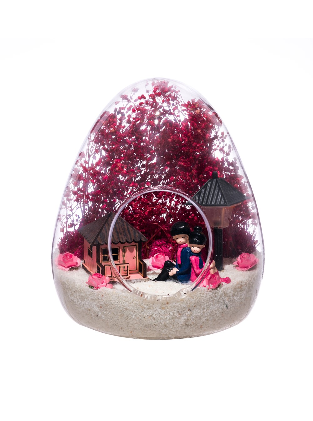 Küçük boy yumurta cam fanus içerisinde tasarladığımız bu güzel teraryum; beyaz kum, kurutulmuş bitkiler, şoklanmış yosunlar, yapay güller, bir adet pembe ahşap ev görseli, bir adet ışığı iki farklı renkte yanan led sokak lambası görseli ve bir adet sırt sırta anı paylaşan sevgilileri simgeleyen obje ile kurgulanarak tamamlanmıştır. Ev ve ofis ortamlarının tamamında sergilenebilir teraryumun içinde, kurutulmuş ve şoklanmış bitkiler bulunduğundan hava alması önemlidir. Açık olan kısmının kapatılmaması veya büfe vb. kapalı alanlara konulmaması gereklidir. Özellikle her ortamda yıllarca, zevkle izlenebilecek özel bir teraryumdur. Yaklaşık Ölçüleri: 18x22cm NOT: Teraryumlarda kullanılan camlar, üfleme cam işçiliğiyle üretildiğinden bazı detaylarda farklılıklar gözlenebilir. Örneğin, yumurta şekli ve ağız bitiş noktalarının her biri kendine özgüdür.