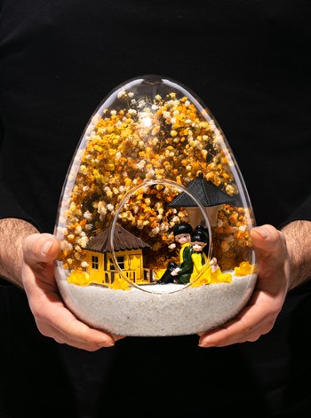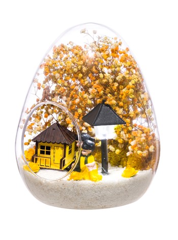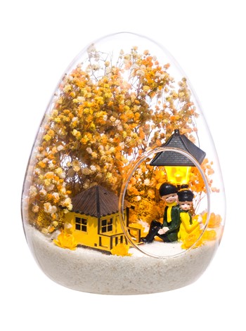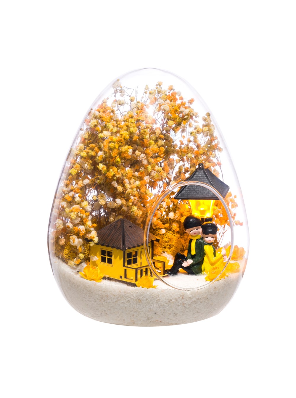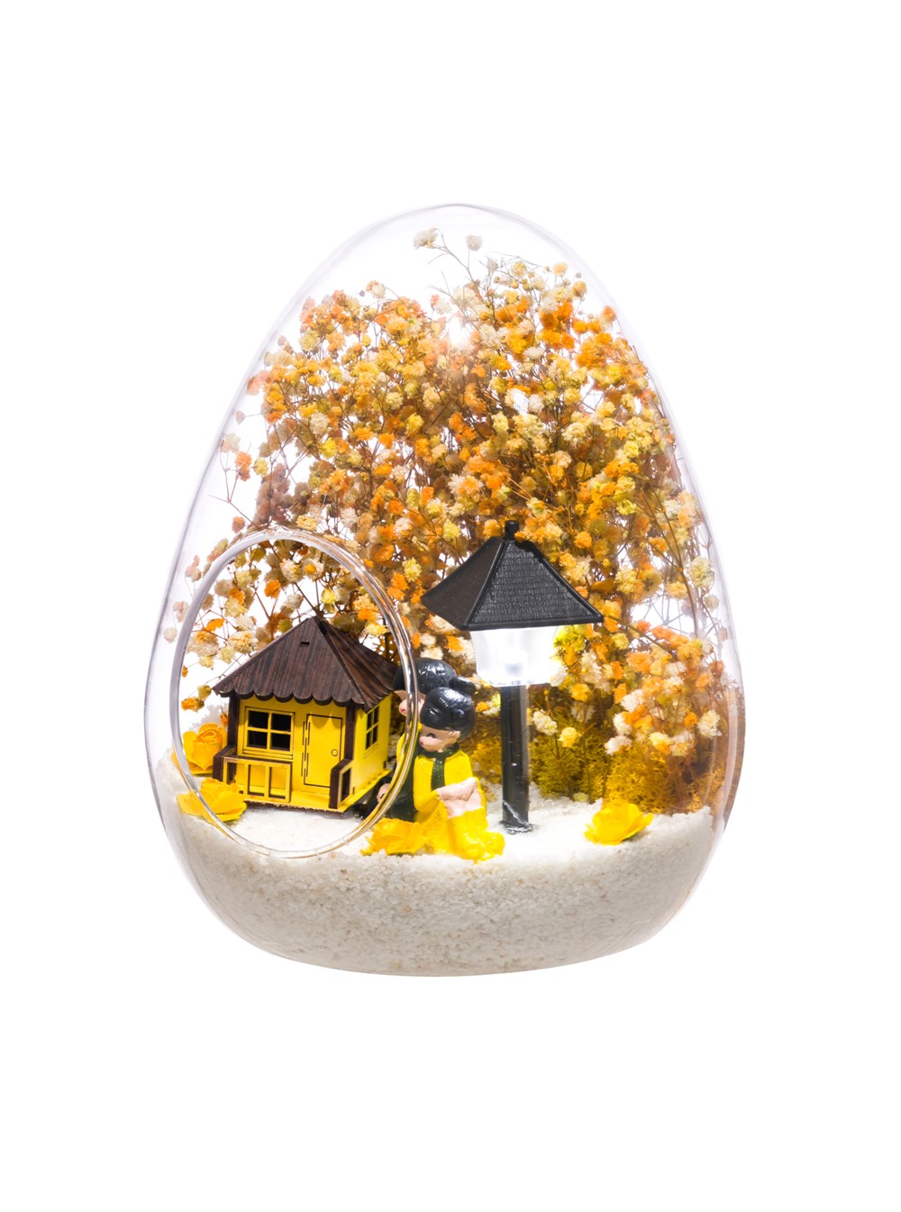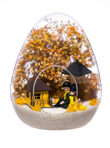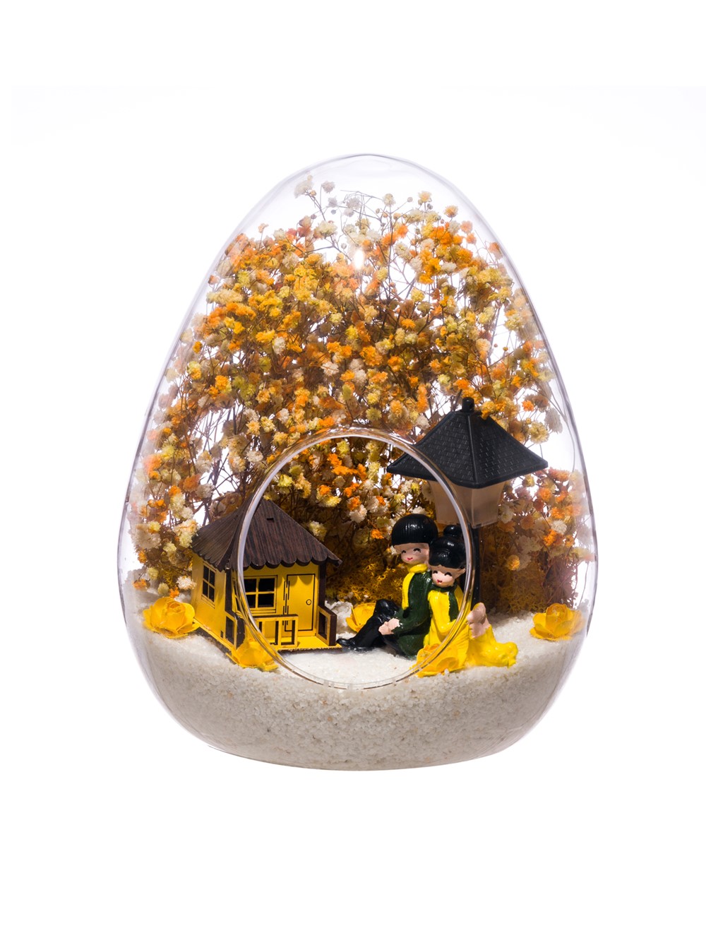 Küçük boy yumurta cam fanus içerisinde tasarladığımız bu güzel teraryum; beyaz kum, kurutulmuş bitkiler, şoklanmış yosunlar, yapay güller, bir adet sarı ahşap ev görseli, bir adet ışığı iki farklı renkte yanan led sokak lambası görseli ve bir adet sırt sırta anı paylaşan sevgilileri simgeleyen obje ile kurgulanarak tamamlanmıştır. Ev ve ofis ortamlarının tamamında sergilenebilir teraryumun içinde, kurutulmuş ve şoklanmış bitkiler bulunduğundan hava alması önemlidir. Açık olan kısmının kapatılmaması veya büfe vb. kapalı alanlara konulmaması gereklidir. Özellikle her ortamda yıllarca, zevkle izlenebilecek özel bir teraryumdur. Yaklaşık Ölçüleri: 18x22cm NOT: Teraryumlarda kullanılan camlar, üfleme cam işçiliğiyle üretildiğinden bazı detaylarda farklılıklar gözlenebilir. Örneğin, yumurta şekli ve ağız bitiş noktalarının her biri kendine özgüdür.