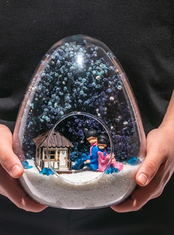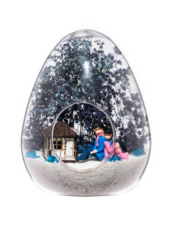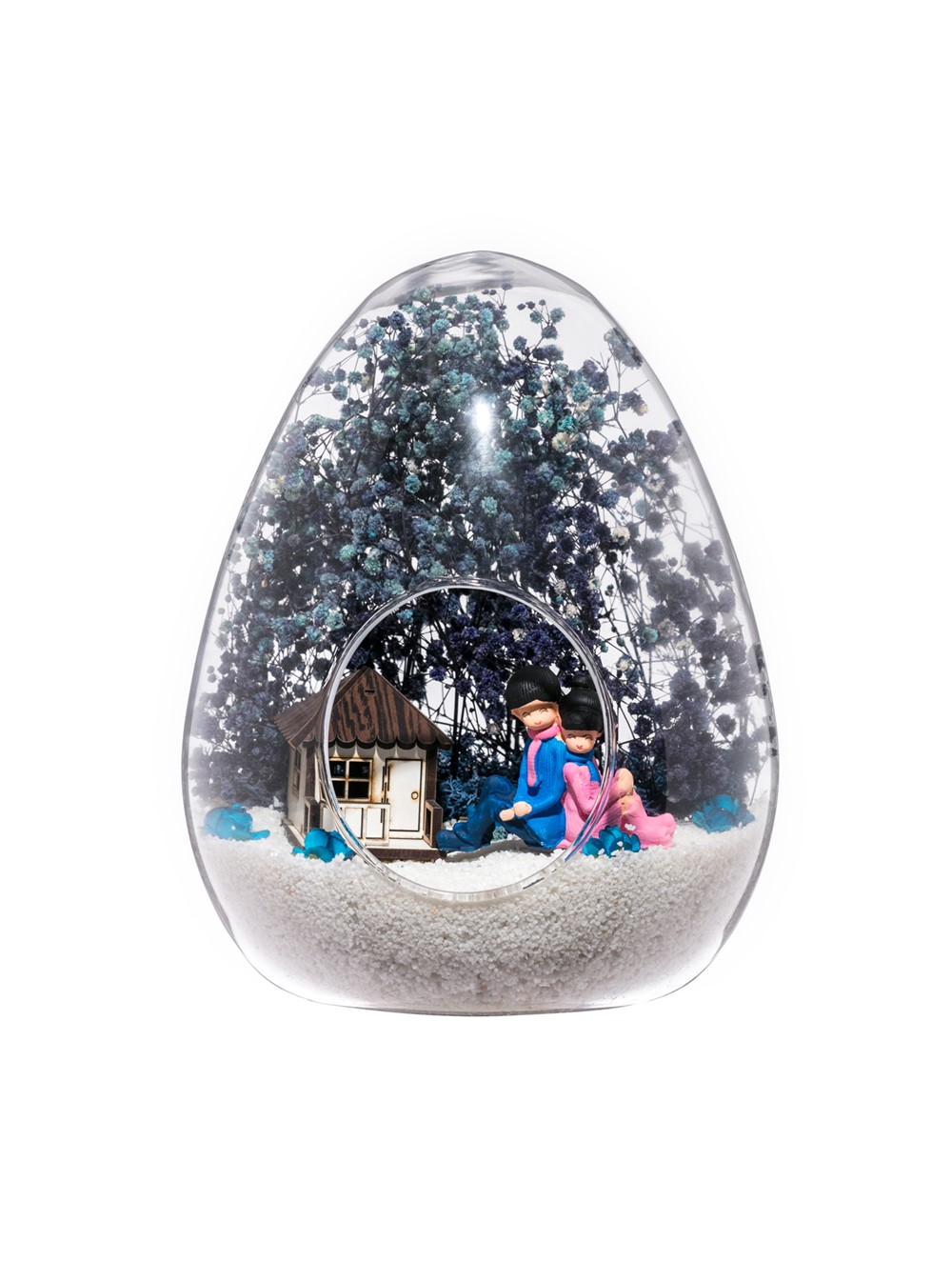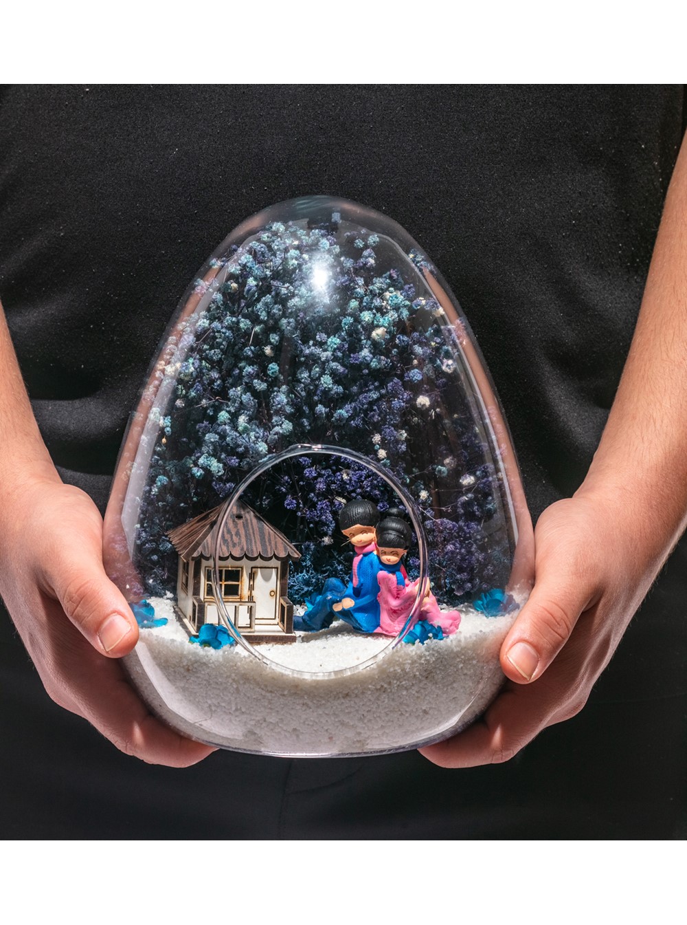 Küçük boy yumurta cam fanus içerisinde tasarladığımız bu güzel teraryum; beyaz kum, kurutulmuş bitkiler, şoklanmış yosunlar, yapay güller, bir adet beyaz ahşap ev görseli ve bir adet sırt sırta anı paylaşan sevgilileri simgeleyen obje ile kurgulanarak tamamlanmıştır. Ev ve ofis ortamlarının tamamında sergilenebilir teraryumun içinde, kurutulmuş ve şoklanmış bitkiler bulunduğundan hava alması önemlidir. Açık olan kısmının kapatılmaması veya büfe vb. kapalı alanlara konulmaması gereklidir. Özellikle her ortamda yıllarca, zevkle izlenebilecek özel bir teraryumdur. Yaklaşık Ölçüleri: 18x22cm NOT: Teraryumlarda kullanılan camlar, üfleme cam işçiliğiyle üretildiğinden bazı detaylarda farklılıklar gözlenebilir. Örneğin, yumurta şekli ve ağız bitiş noktalarının her biri kendine özgüdür.