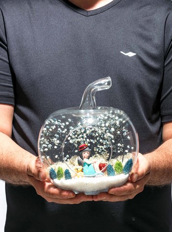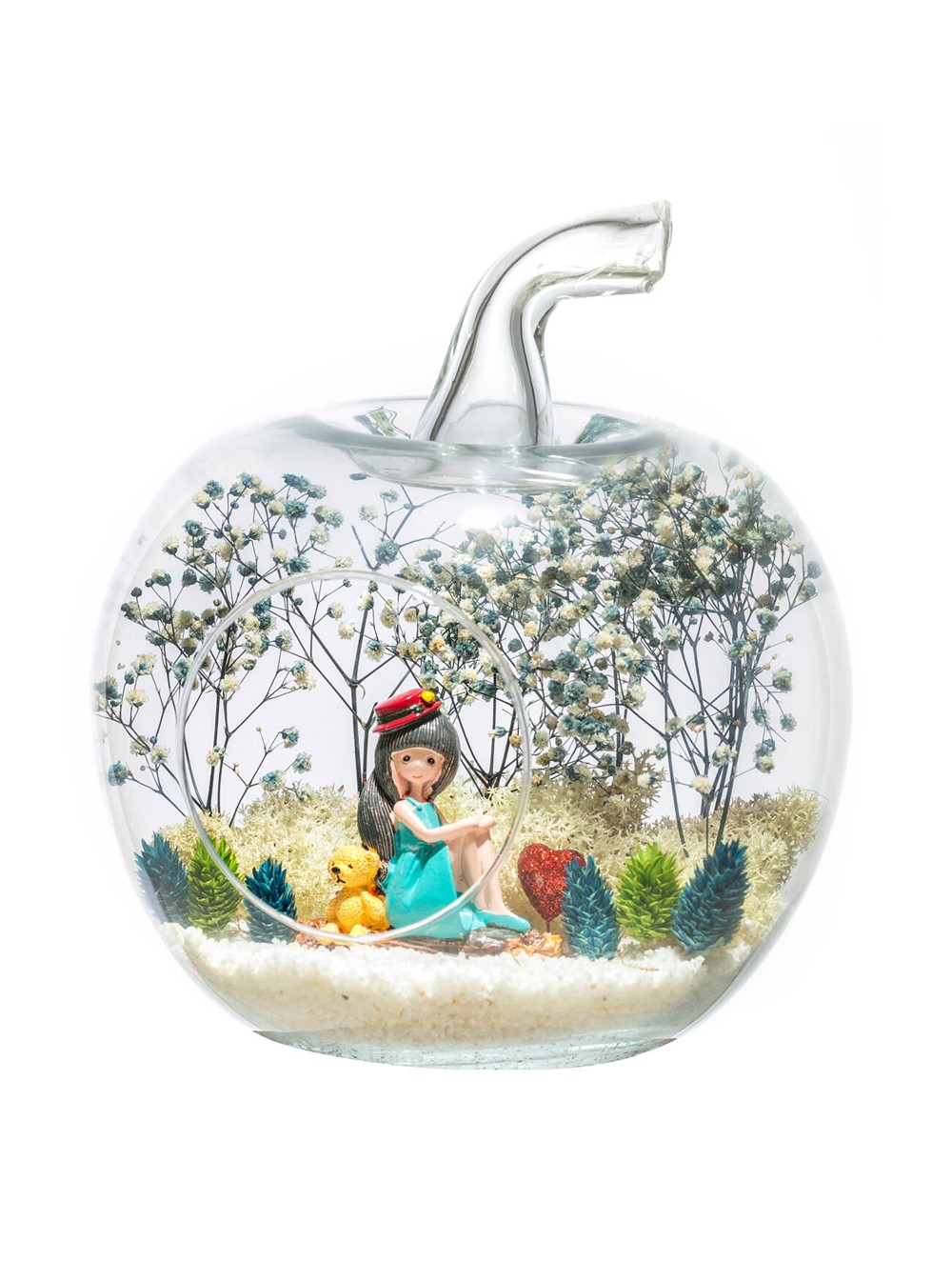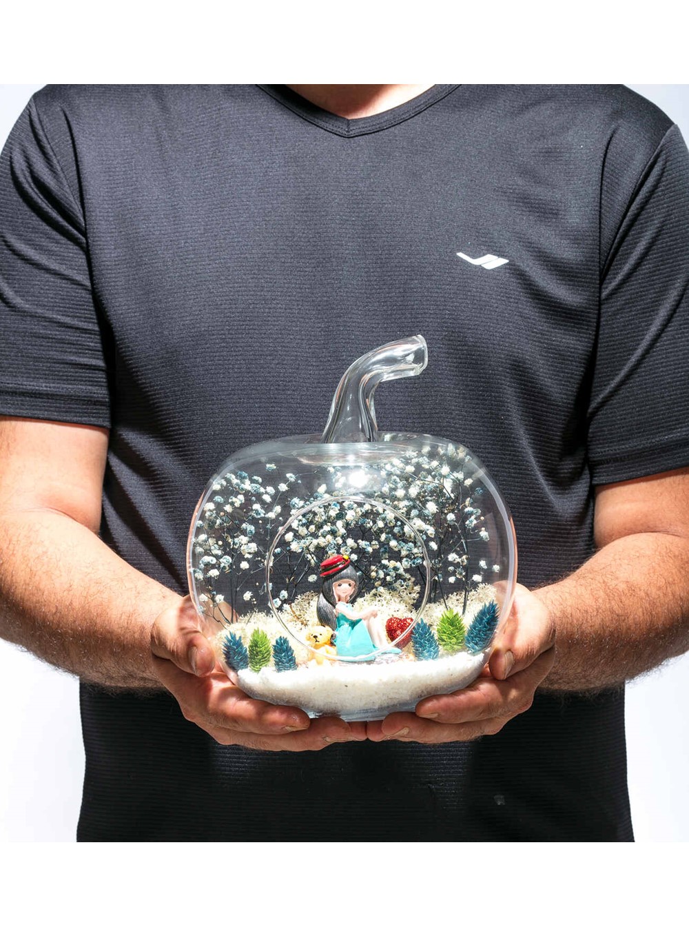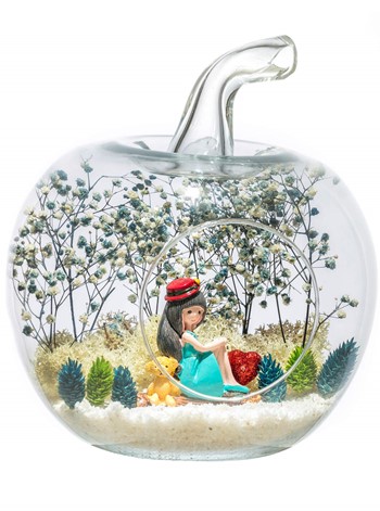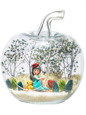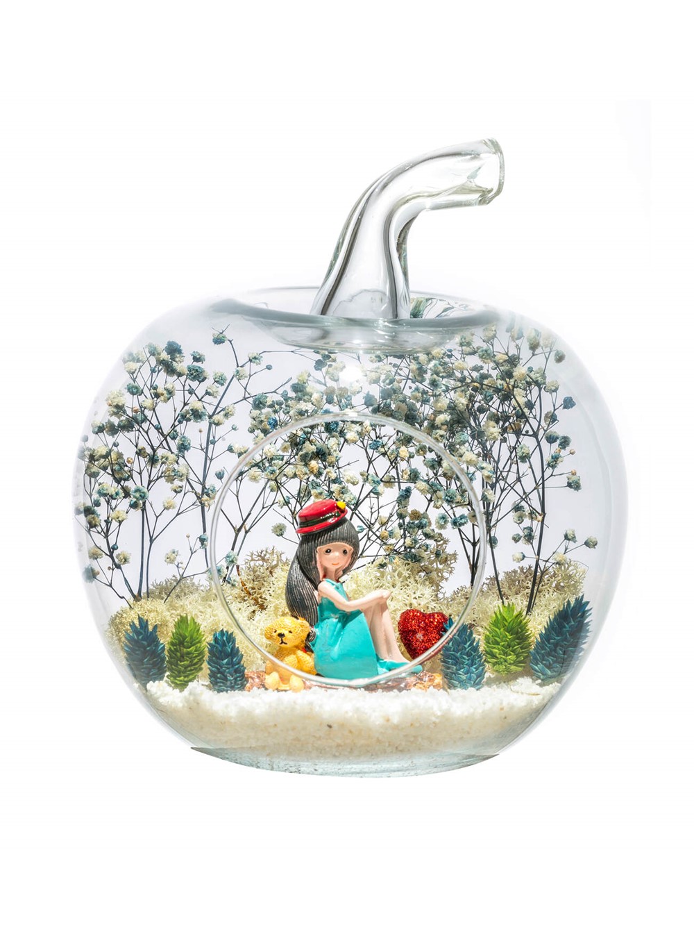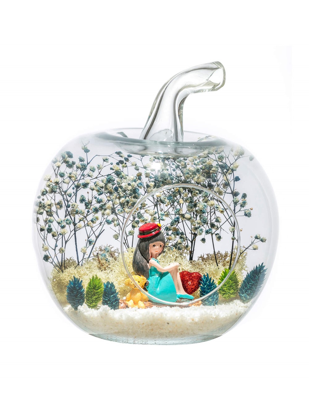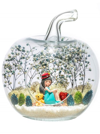 Küçük boy elmacam fanus içerisinde tasarladığımız bu teraryum, gönderilen bütün arkadaşlarınızı gördükleri anda mutlu edecek şekilde tasarlandı. Tasarımımız; beyaz kum, kuru başaklar, şoklanmış yosun, kurutulmuş bitkilerle beraber bir adet gençkız görseli ve bir adet simli kalp objelerle tamamlanmıştır. Ev ve ofis ortamlarının tamamında sergilenebilir teraryumun içinde canlı bitki bulunmadığından, herhangi bir bakıma ihtiyacı yoktur. Özellikle her ortamda yıllarca, zevkle izlenebilecek çok özel bir teraryumdur. Yaklaşık Ölçüleri: 20x20cmNOT:Teraryumlarda kullanılan camlar, üfleme cam işçiliğiyle üretildiğinden bazı detaylarda farklılıklar gözlenebilir. Örneğin, sap kısmı ve ağız bitiş noktalarının her biri kendine özgüdür.
