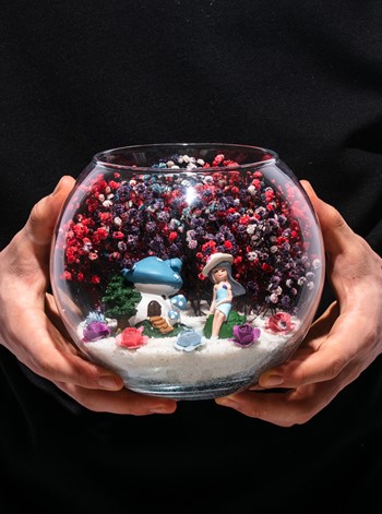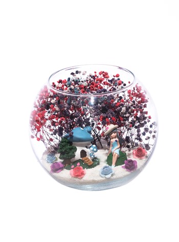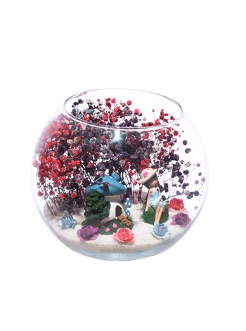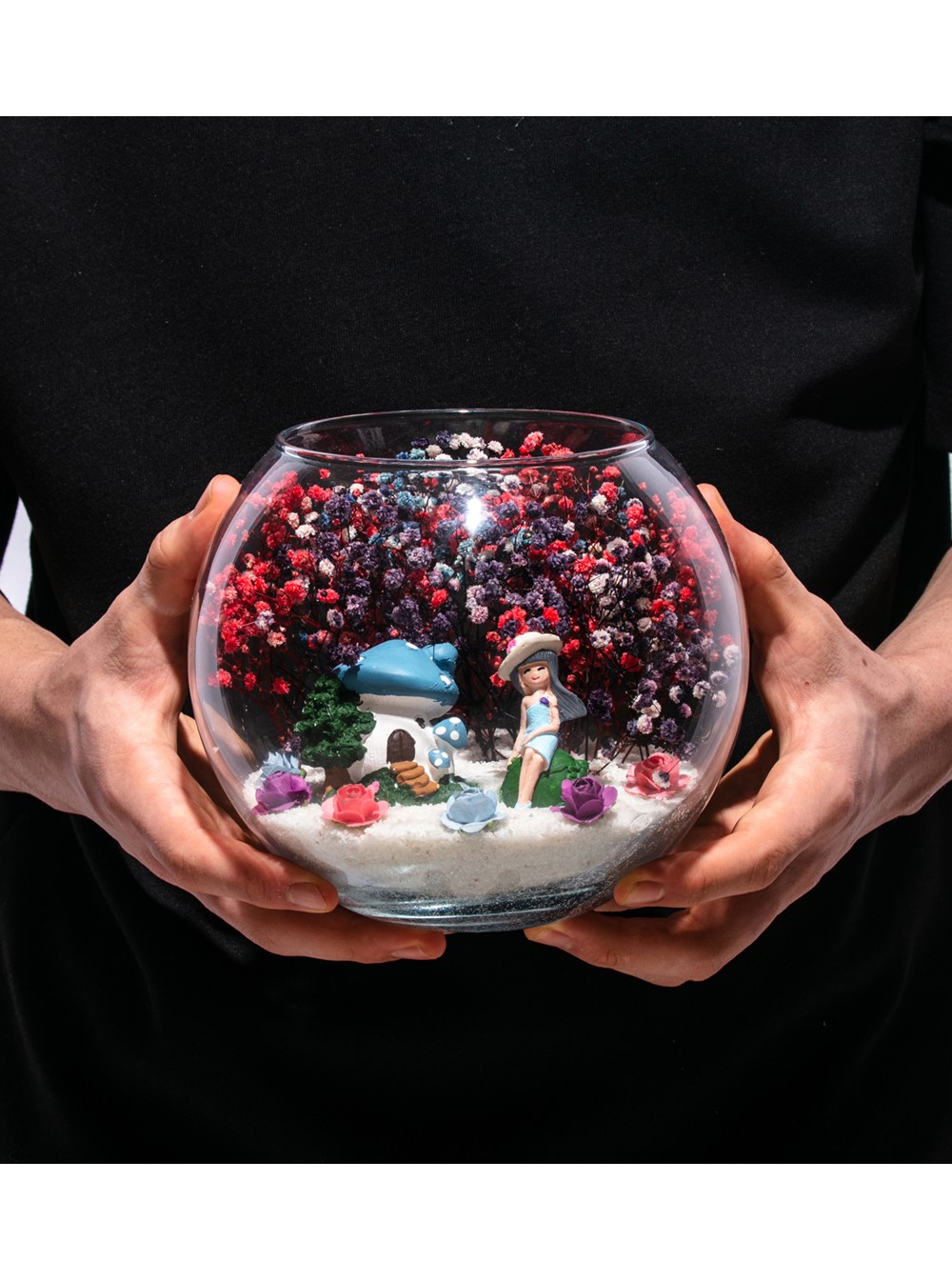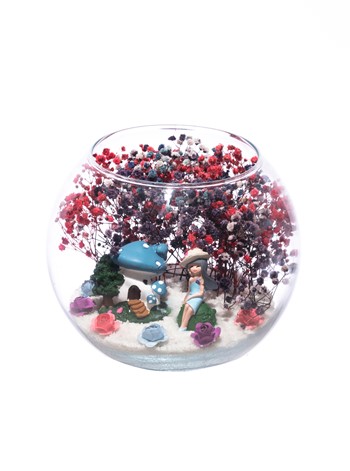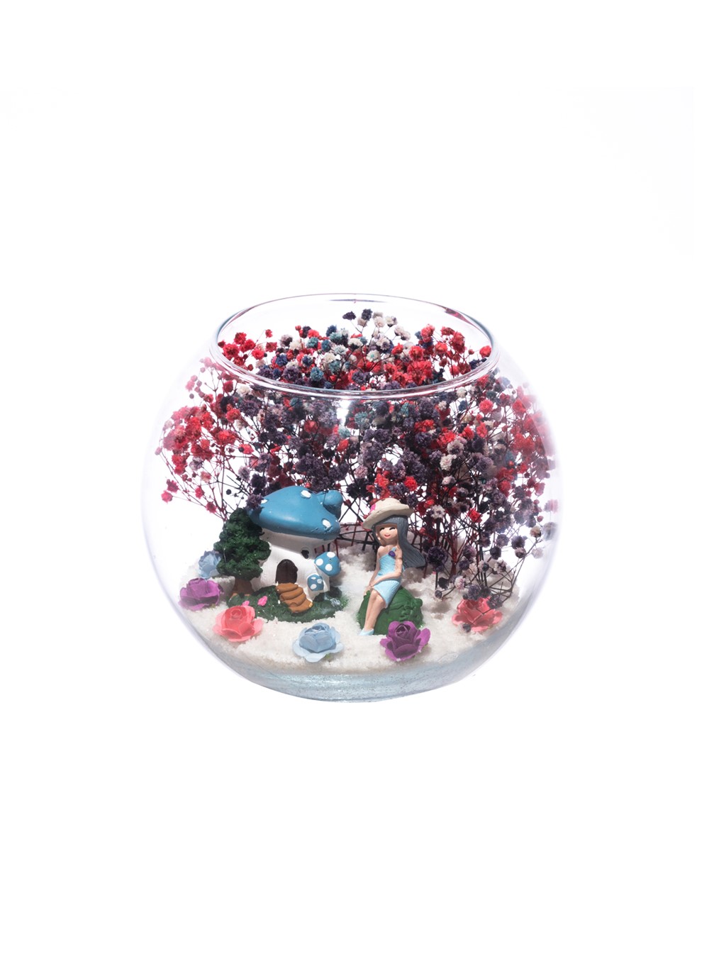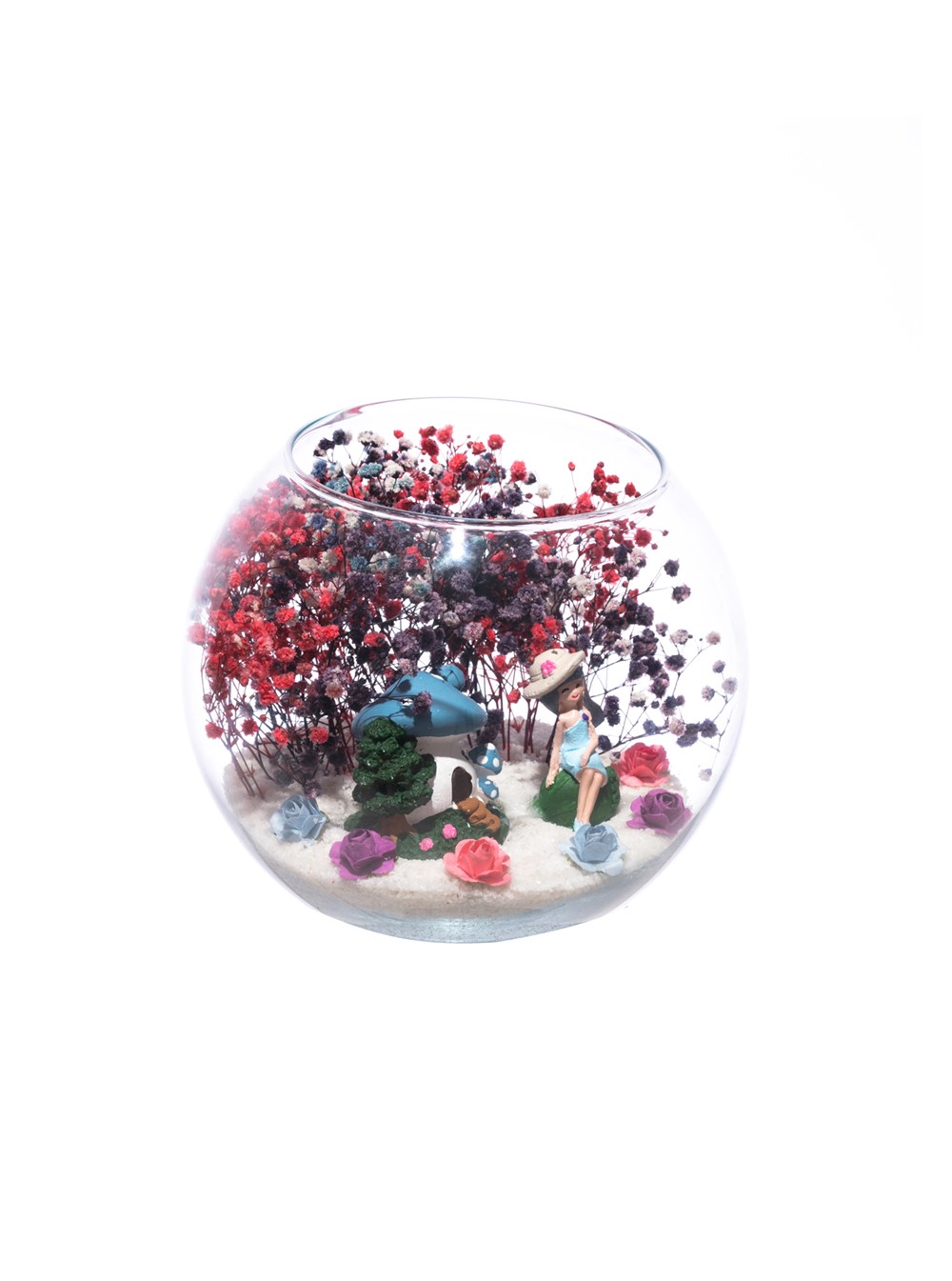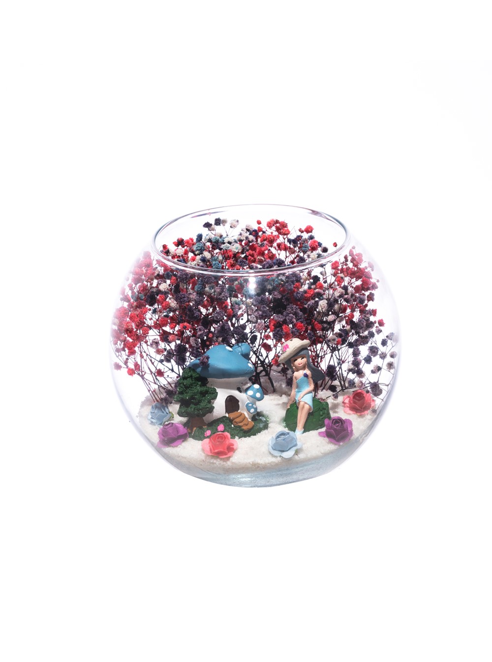 Küçük boy, cam fanus içerisinde tasarladığımız bu anlamlı teraryum; beyaz kum, karışık renkli kurutulmuş bitkiler, renkli mini yapay güller, bir adet mantar ev ve bir adet mavi elbiseli genç kız objelerle tamamlanmıştır. Ev ve ofis ortamlarının tamamında sergilenebilir teraryumun içinde kurutulmuş bitkiler bulunduğundan hava alması önemlidir. Açık olan kısmının kapatılmaması veya büfe vb. kapalı alanlara konulmaması gereklidir. Özellikle her ortamda yıllarca, zevkle izlenebilecek özel bir teraryumdur. Yaklaşık Ölçüleri: 16x18 cm