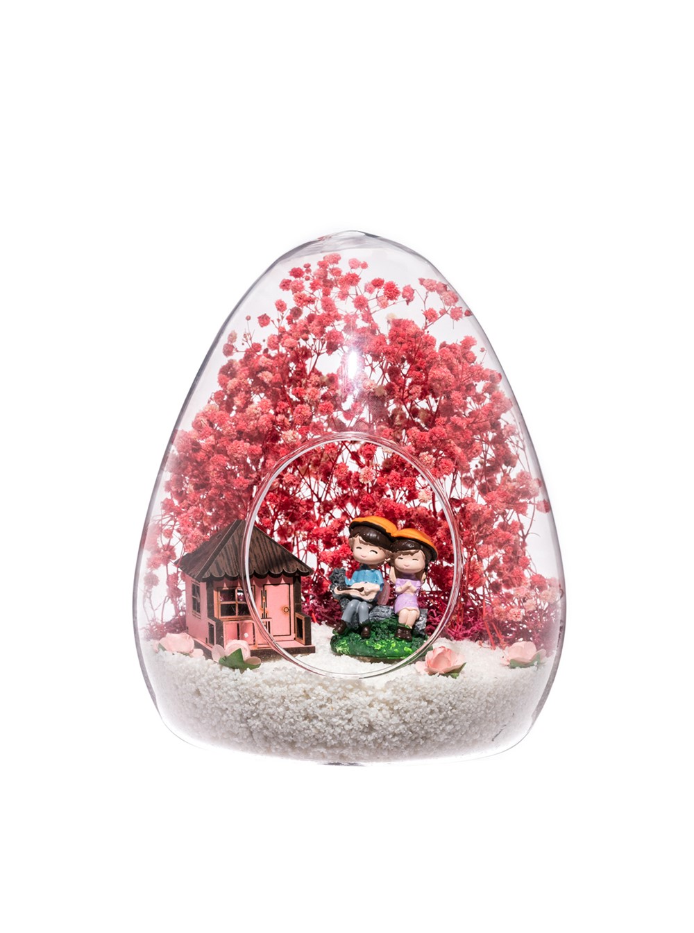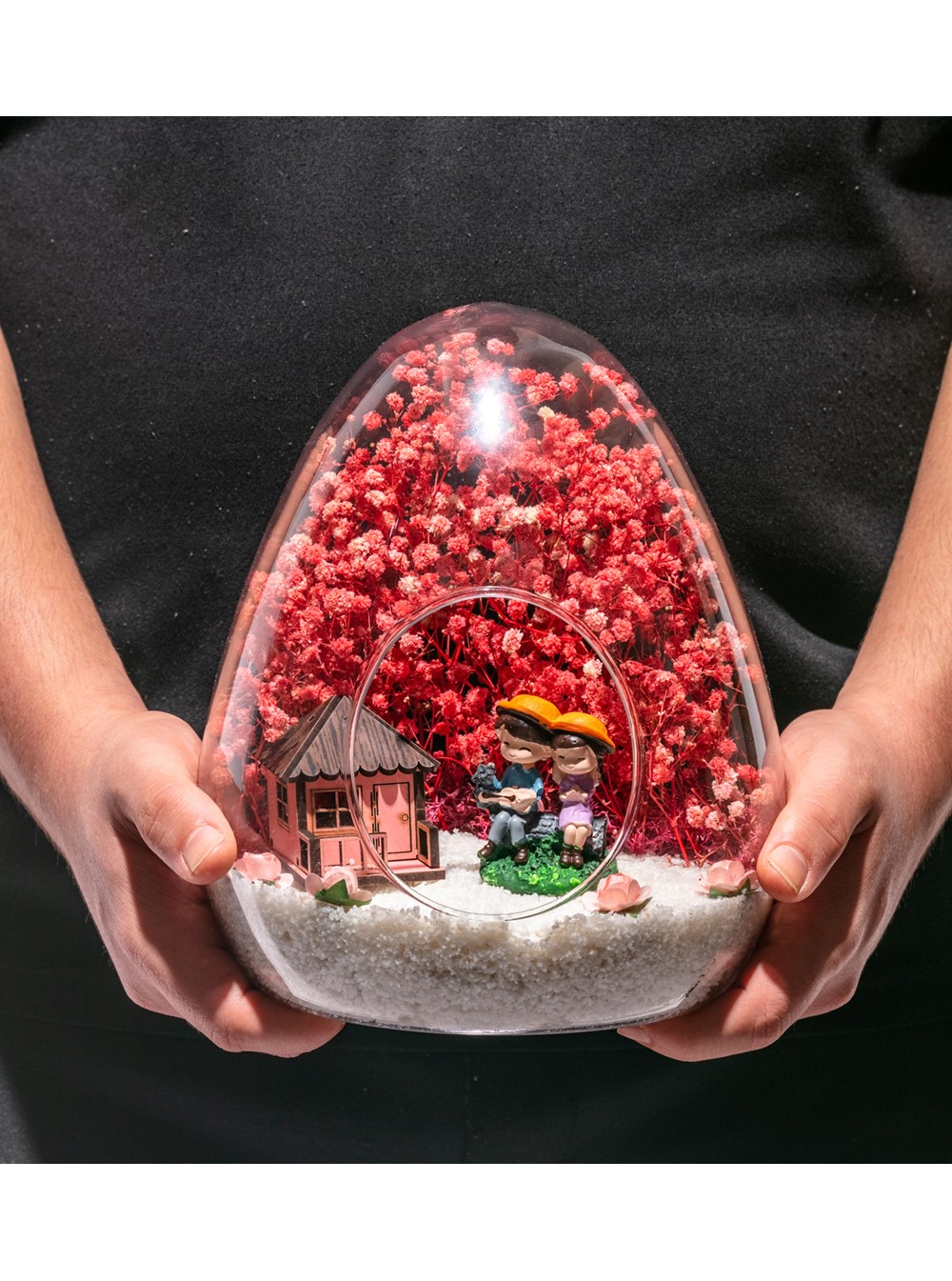 Küçük boy yumurta cam fanus içerisinde tasarladığımız bu güzel teraryum; beyaz kum, kurutulmuş bitkiler, şoklanmış yosunlar, yapay güller, bir adet pembe ahşap ev görseli ve bir adet yan yana anı paylaşan sevgilileri simgeleyen obje ile kurgulanarak tamamlanmıştır. Ev ve ofis ortamlarının tamamında sergilenebilir teraryumun içinde, kurutulmuş ve şoklanmış bitkiler bulunduğundan hava alması önemlidir. Açık olan kısmının kapatılmaması veya büfe vb. kapalı alanlara konulmaması gereklidir. Özellikle her ortamda yıllarca, zevkle izlenebilecek özel bir teraryumdur. Yaklaşık Ölçüleri: 18x22cm NOT: Teraryumlarda kullanılan camlar, üfleme cam işçiliğiyle üretildiğinden bazı detaylarda farklılıklar gözlenebilir. Örneğin, yumurta şekli ve ağız bitiş noktalarının her biri kendine özgüdür.