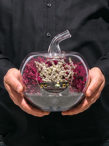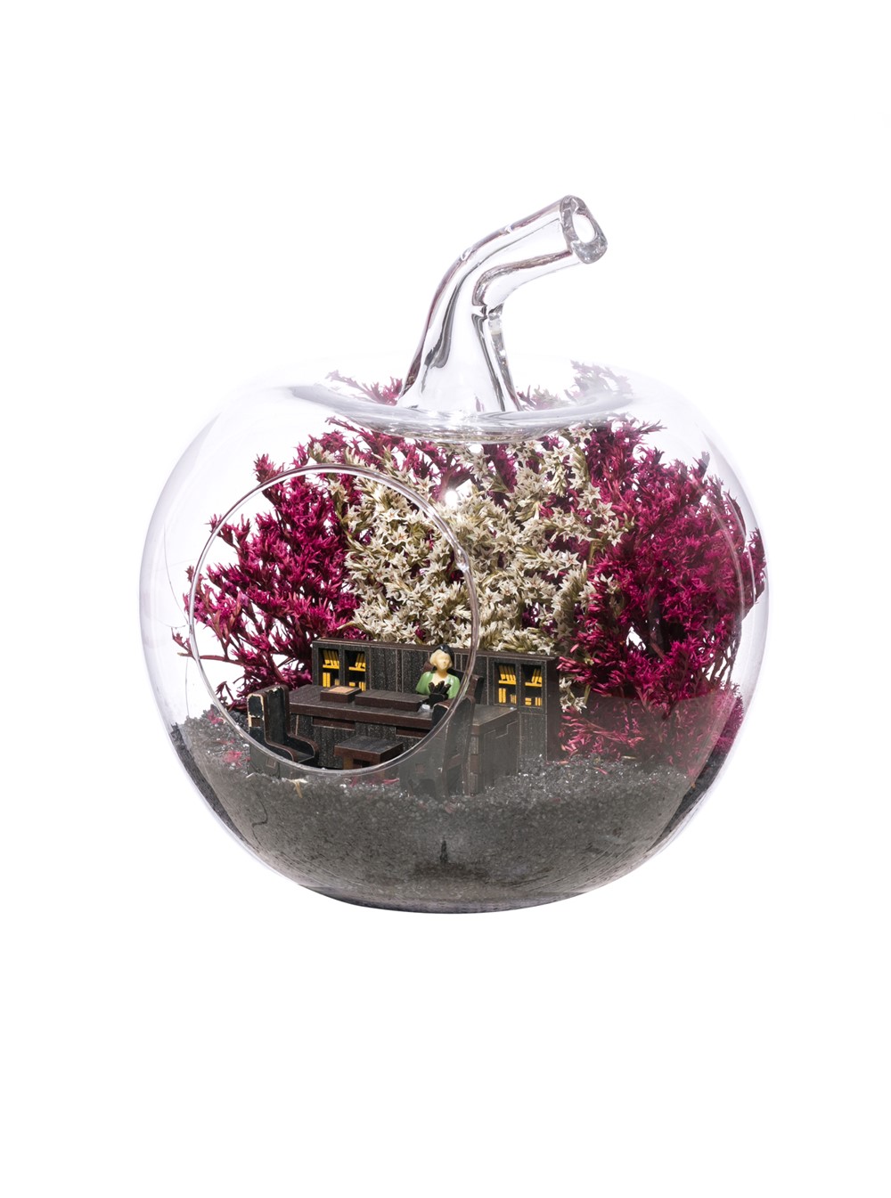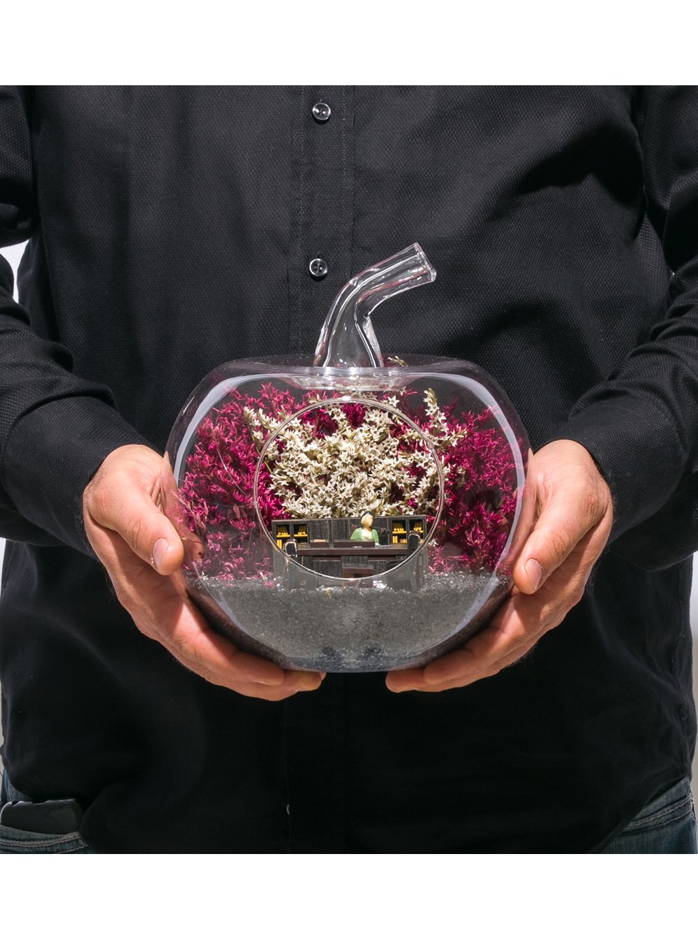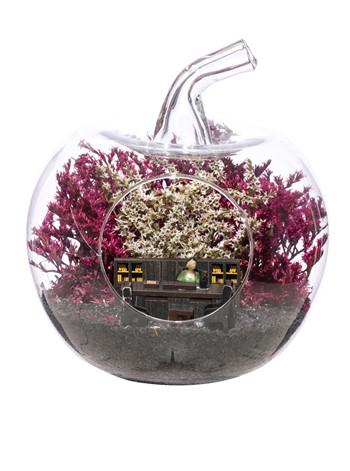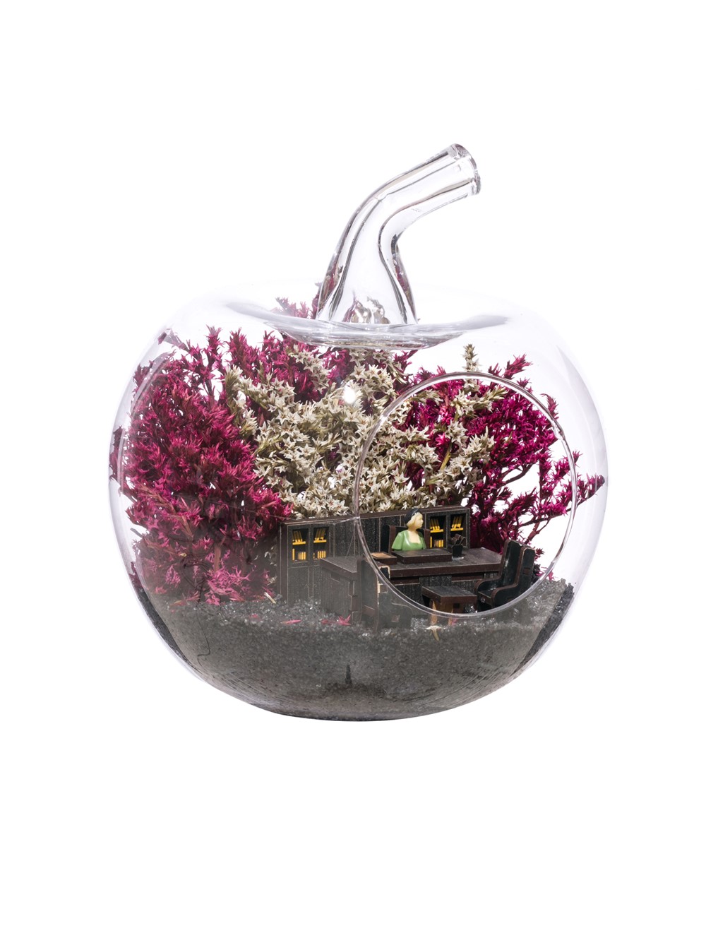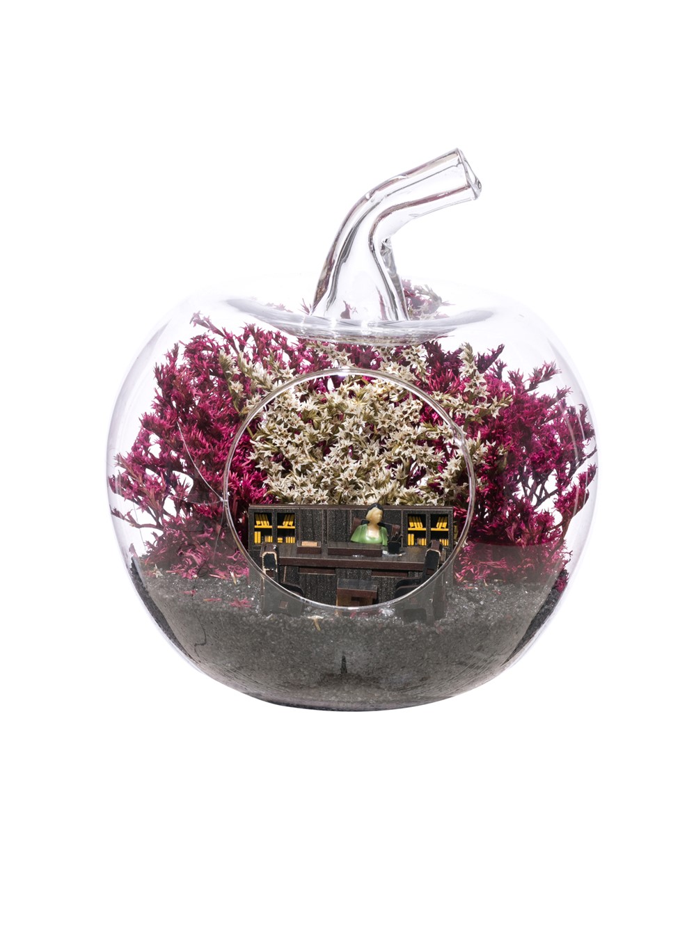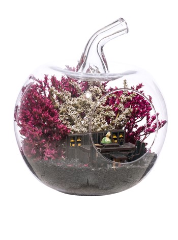 Küçük boy elma cam fanus içerisinde tasarladığımız bu çok güzel teraryum; siyah kum, şoklanmış yosunlar, kurutulmuş bitkiler, bir adet ahşap ofis görseli ve bir adet masasında çalışan kadın görseli kullanılarak tamamlanmıştır. Ev ve ofis ortamlarının tamamında sergilenebilir teraryumun içinde, kurutulmuş ve şoklanmış bitkiler bulunduğundan hava alması önemlidir. Açık olan kısmının kapatılmaması veya büfe vb. kapalı alanlara konulmaması gereklidir. Özellikle her ortamda yıllarca, zevkle izlenebilecek özel bir teraryumdur. Yaklaşık Ölçüleri: 20x20cm NOT: Teraryumlarda kullanılan camlar, üfleme cam işçiliğiyle üretildiğinden bazı detaylarda farklılıklar gözlenebilir. Örneğin, sap kısmı ve ağız bitiş noktalarının her biri kendine özgüdür.