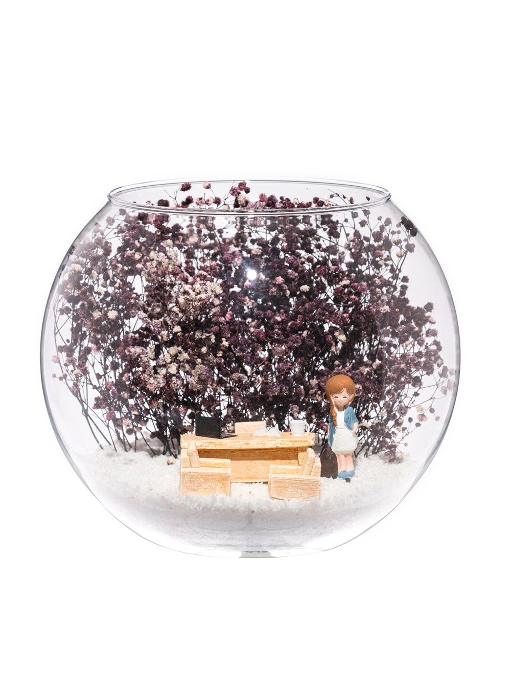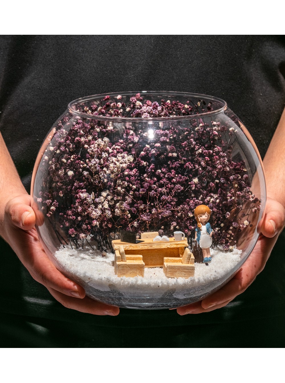 Orta boy açık cam fanus içerisinde hazırlanan bu özgün teraryum; beyaz kum, kurutulmuş bitkiler, bir adet mini ofis görseli ve bir adet çalışan bayanı simgeleyen objeyle birlikte kurgulanmıştır. Ev ve ofis ortamlarının tamamında sergilenebilir teraryumun içinde, kurutulmuş ve şoklanmış bitkiler bulunduğundan hava alması önemlidir. Açık olan kısmının kapatılmaması veya büfe vb. kapalı alanlara konulmaması gereklidir. Özellikle her ortamda zevkle izlenebilecek özel bir teraryumdur. Yaklaşık Ölçüler: 19x23 cm'dir.