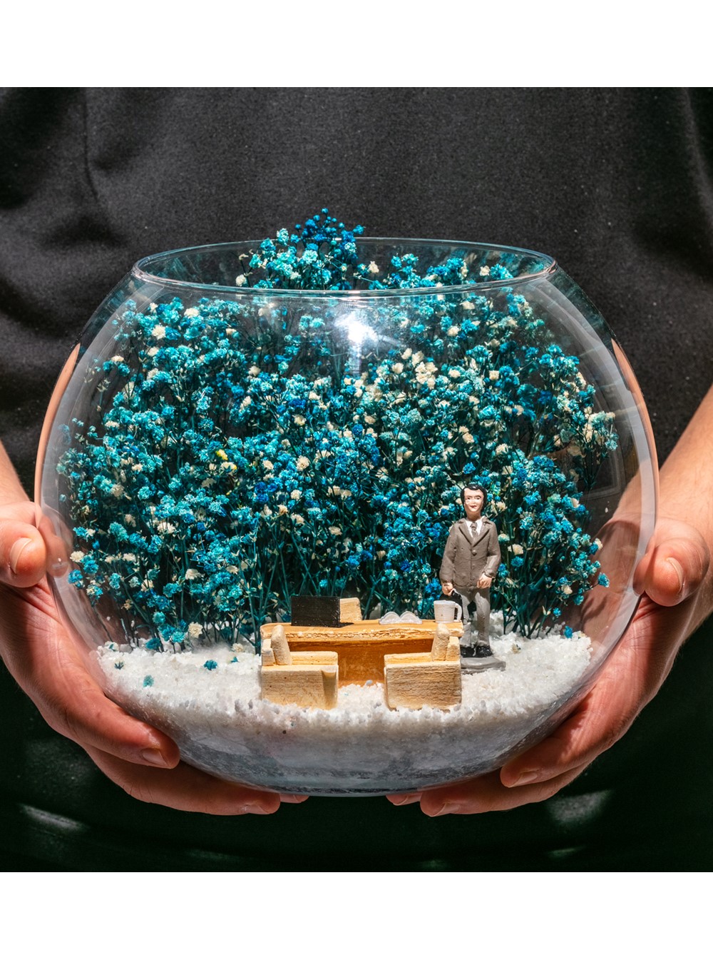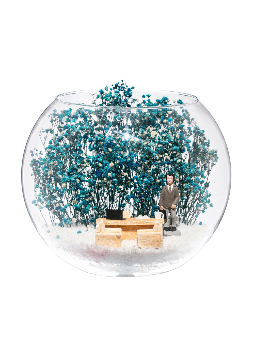 Orta boy açık cam fanus içerisinde hazırlanan bu özgün teraryum; beyaz kum, kurutulmuş bitkiler, bir adet mini ofis görseli ve bir adet çalışan erkeği simgeleyen objeyle birlikte kurgulanmıştır. Ev ve ofis ortamlarının tamamında sergilenebilir teraryumun içinde, kurutulmuş ve şoklanmış bitkiler bulunduğundan hava alması önemlidir. Açık olan kısmının kapatılmaması veya büfe vb. kapalı alanlara konulmaması gereklidir. Özellikle her ortamda zevkle izlenebilecek özel bir teraryumdur. Yaklaşık Ölçüler: 19x23 cm'dir.