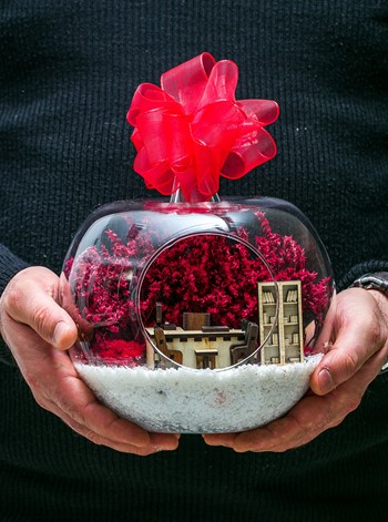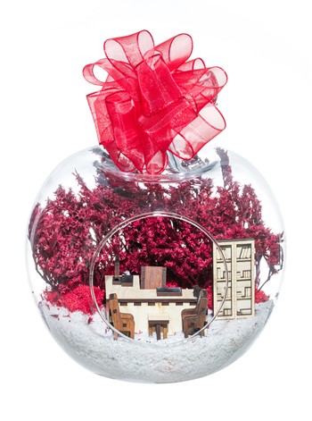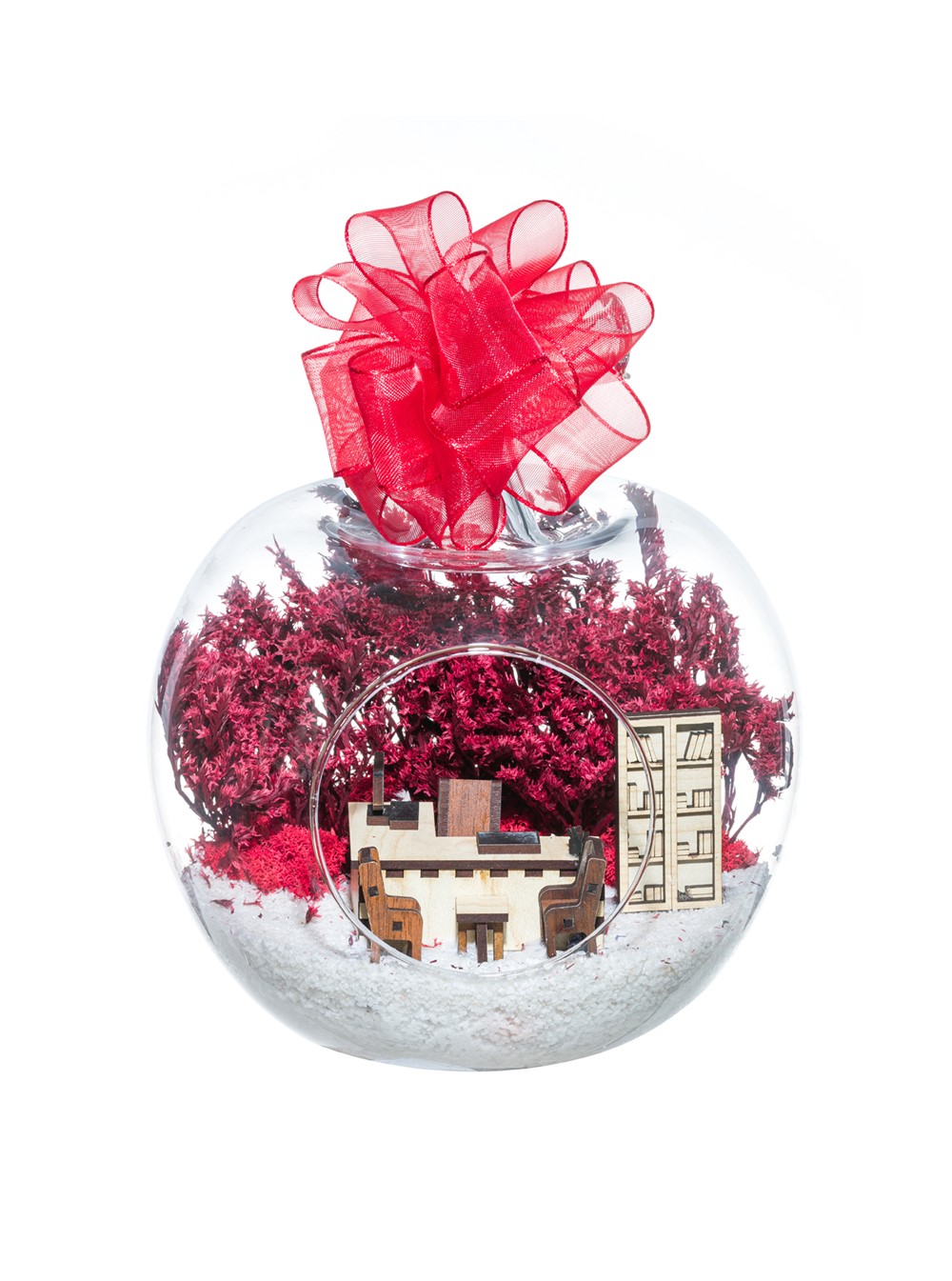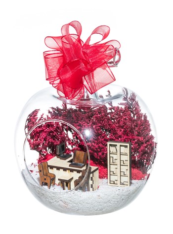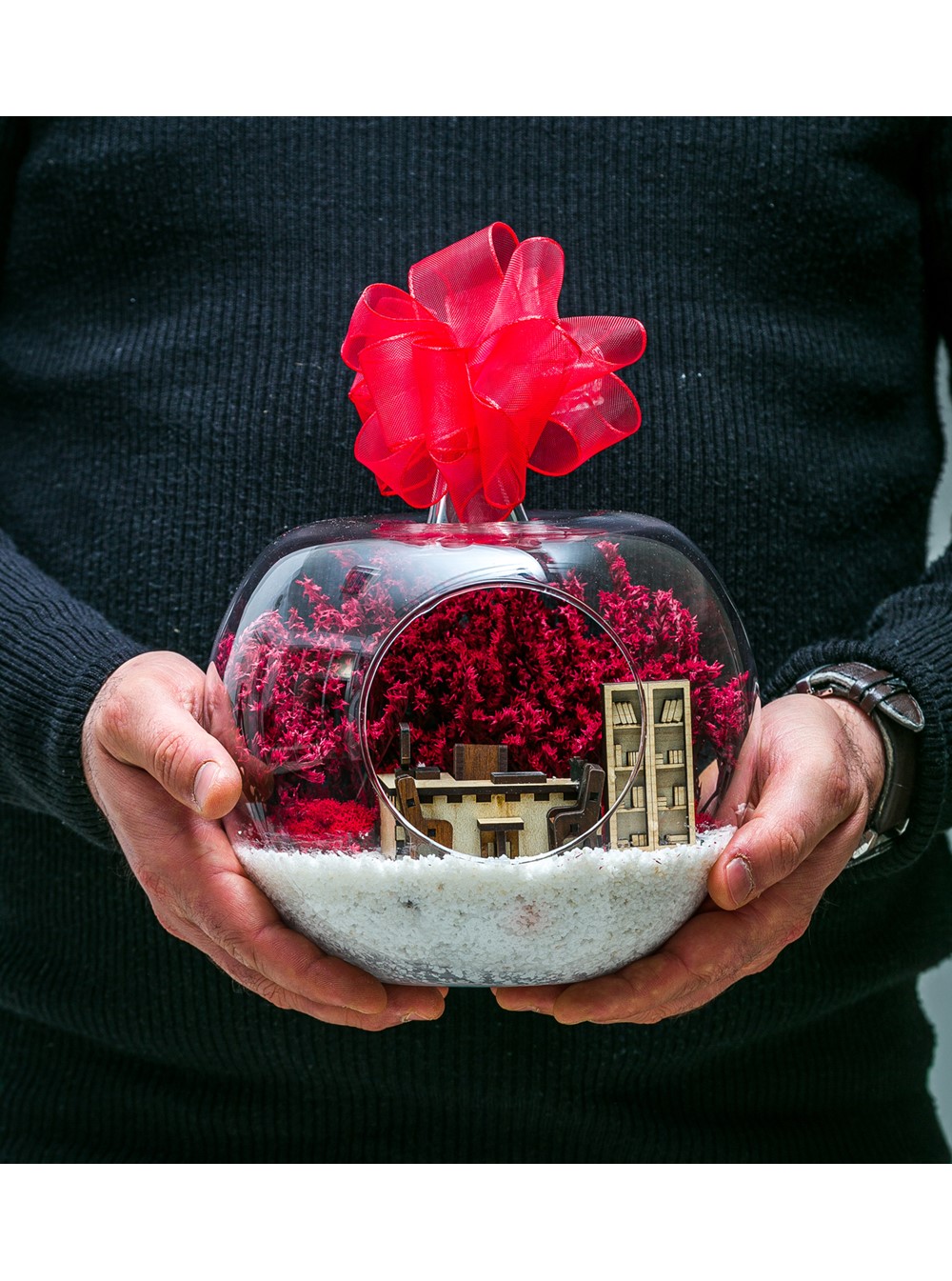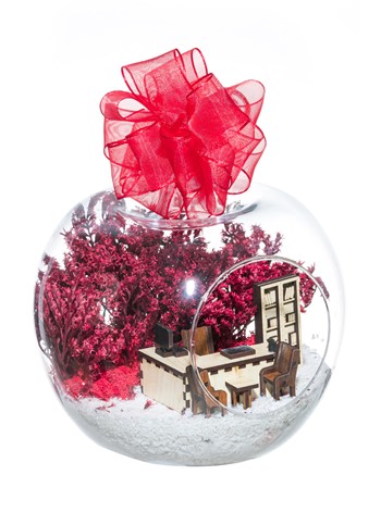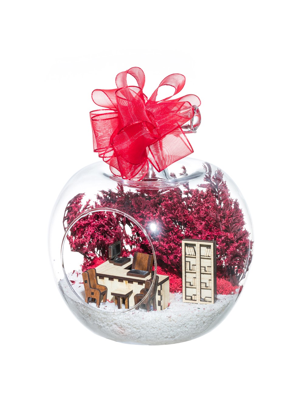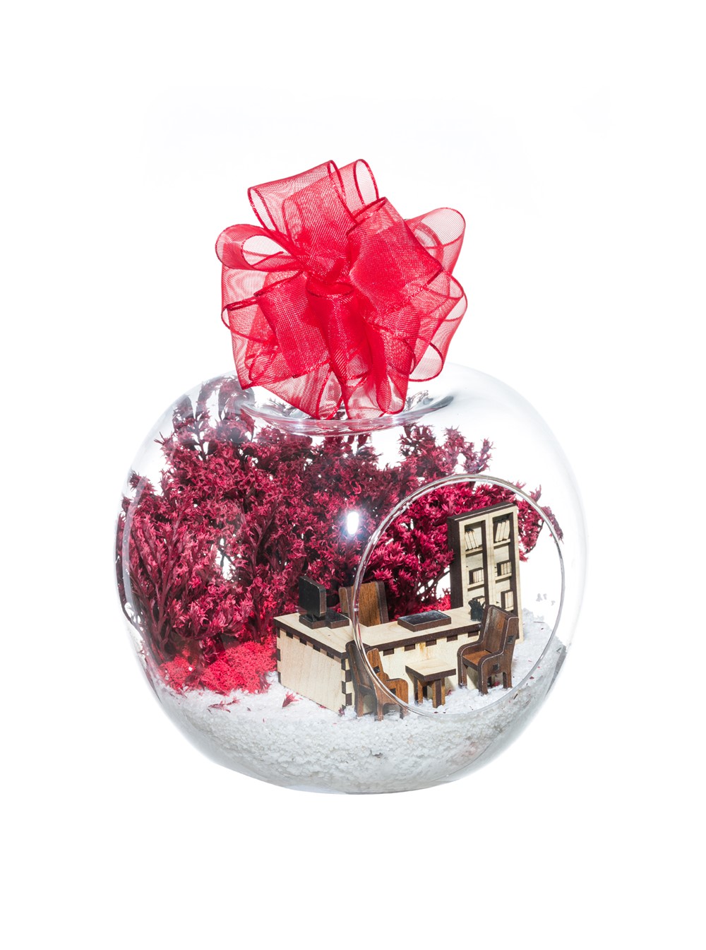 Kurdele takılı küçük boy elma cam fanus içerisinde tasarladığımız bu özel teraryum; beyaz kum, şoklanmış yosunlar, kurutulmuş bitkiler, bir adet üzerinde gerekli aksesuarları bulunan koltuğuyla ahşap ofis masası, önünde iki adet ahşap misafir koltuğu, bir adet sehpa ve içerisinde ahşap çalışma dolabı bulunan mükellef bir ofis görseli simgeleyen objelerle tamamlanmıştır. Ev ve ofis ortamlarının tamamında sergilenebilir teraryumun içinde, kurutulmuş ve şoklanmış bitkiler bulunduğundan hava alması önemlidir. Açık olan kısmının kapatılmaması veya büfe vb. kapalı alanlara konulmaması gereklidir. Özellikle her ortamda yıllarca, zevkle izlenebilecek özel bir teraryumdur. Yaklaşık Ölçüleri: 20x20cm NOT: Teraryumlarda kullanılan camlar, üfleme cam işçiliğiyle üretildiğinden bazı detaylarda farklılıklar gözlenebilir. Örneğin, sap kısmı ve ağız bitiş noktalarının her biri kendine özgüdür.