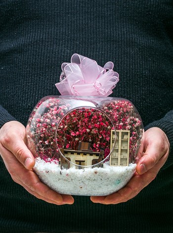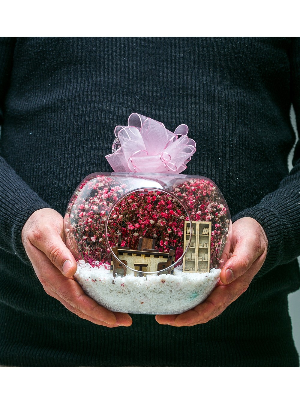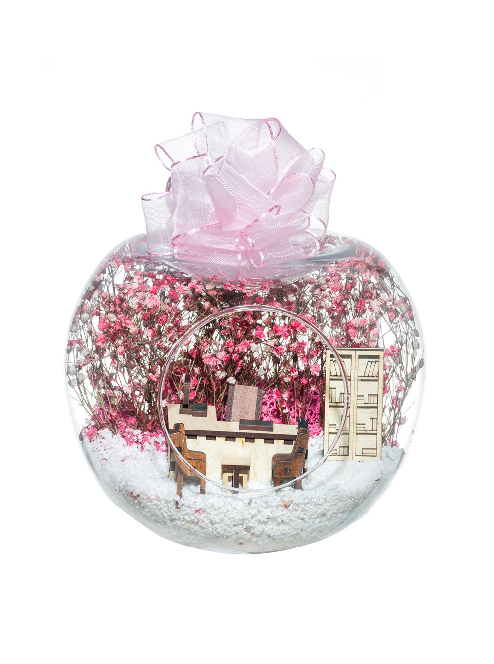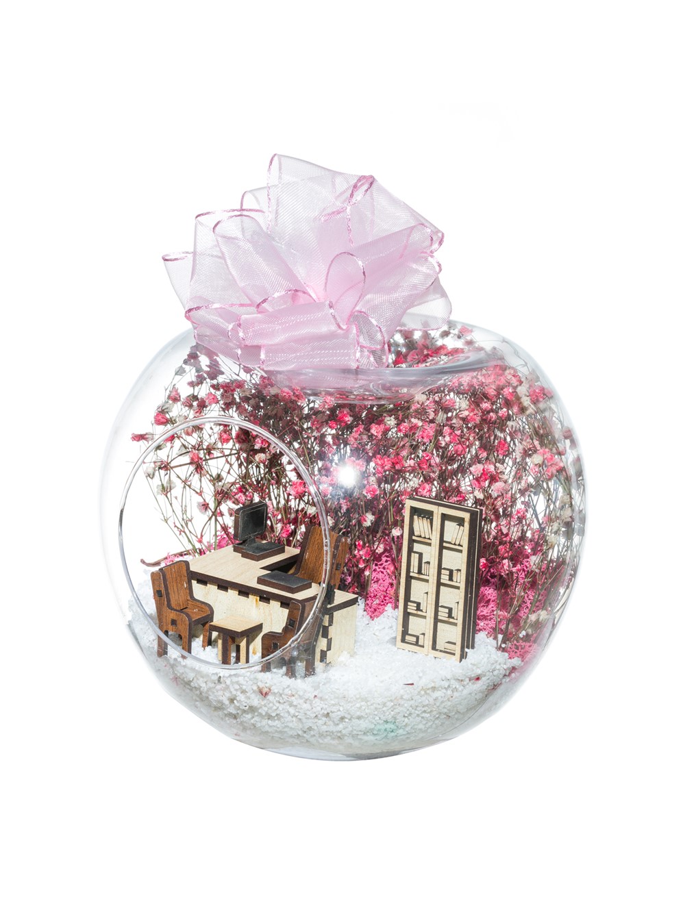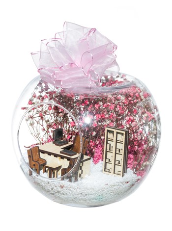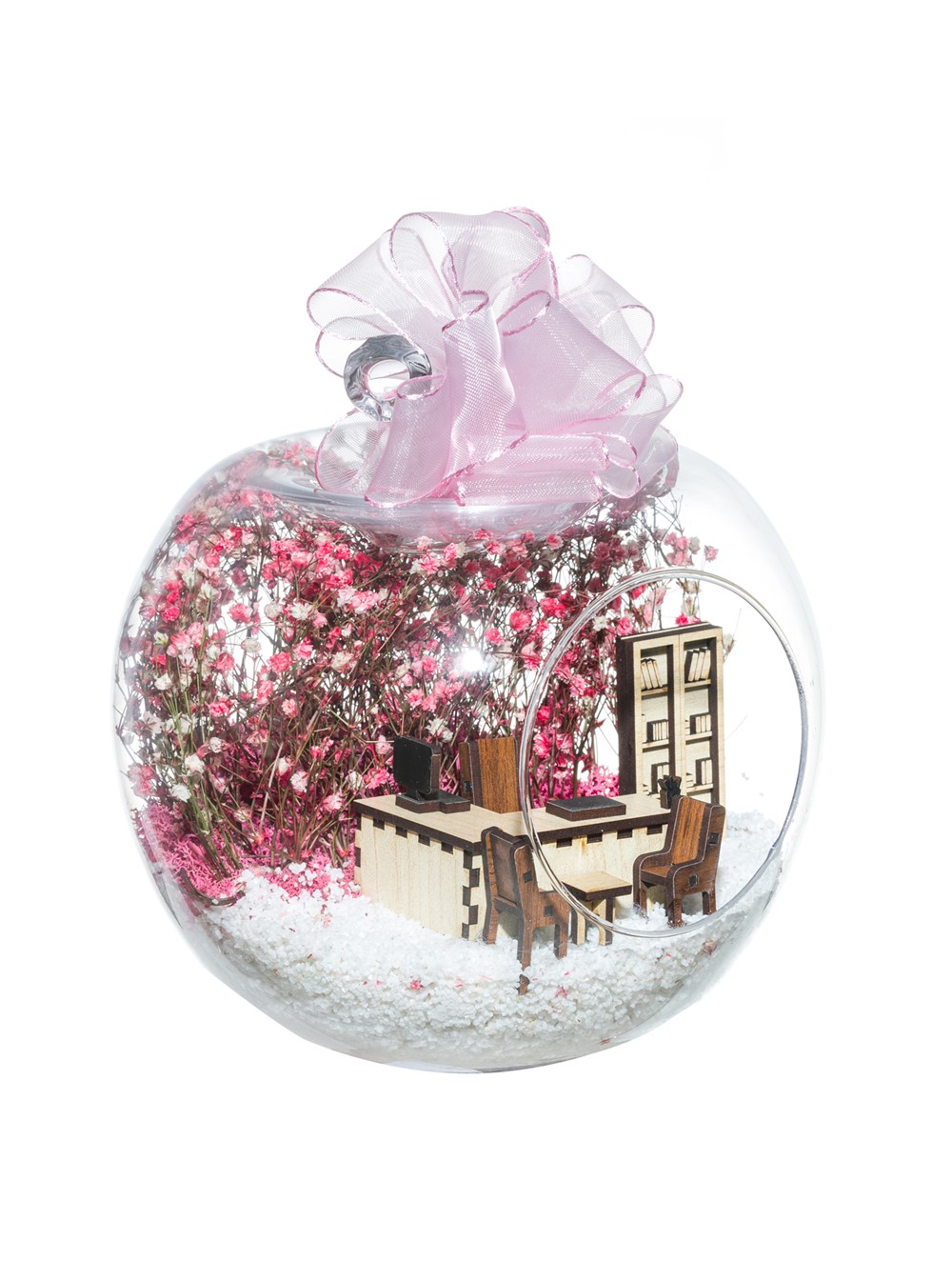Kurdele takılı küçük boy elma cam fanus içerisinde tasarladığımız bu özel teraryum; beyaz kum, şoklanmış yosunlar, kurutulmuş bitkiler, bir adet üzerinde gerekli aksesuarları bulunan koltuğuyla ahşap ofis masası, önünde iki adet ahşap misafir koltuğu, bir adet sehpa ve içerisinde ahşap çalışma dolabı bulunan mükellef bir ofis görseli simgeleyen objelerle tamamlanmıştır. Ev ve ofis ortamlarının tamamında sergilenebilir teraryumun içinde, kurutulmuş ve şoklanmış bitkiler bulunduğundan hava alması önemlidir. Açık olan kısmının kapatılmaması veya büfe vb. kapalı alanlara konulmaması gereklidir. Özellikle her ortamda yıllarca, zevkle izlenebilecek özel bir teraryumdur. Yaklaşık Ölçüleri: 20x20cm NOT: Teraryumlarda kullanılan camlar, üfleme cam işçiliğiyle üretildiğinden bazı detaylarda farklılıklar gözlenebilir. Örneğin, sap kısmı ve ağız bitiş noktalarının her biri kendine özgüdür.