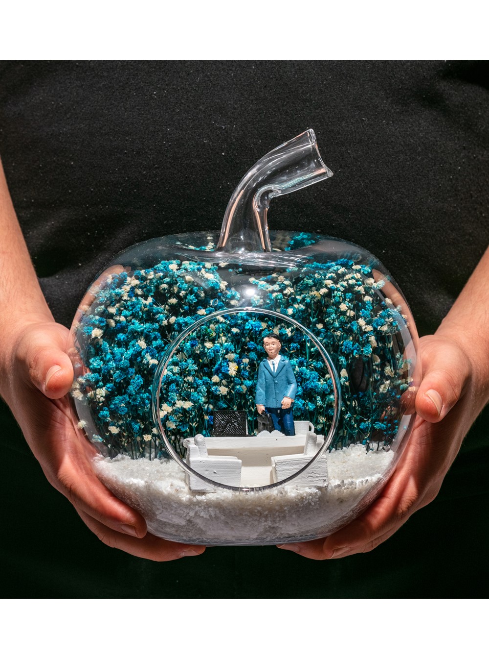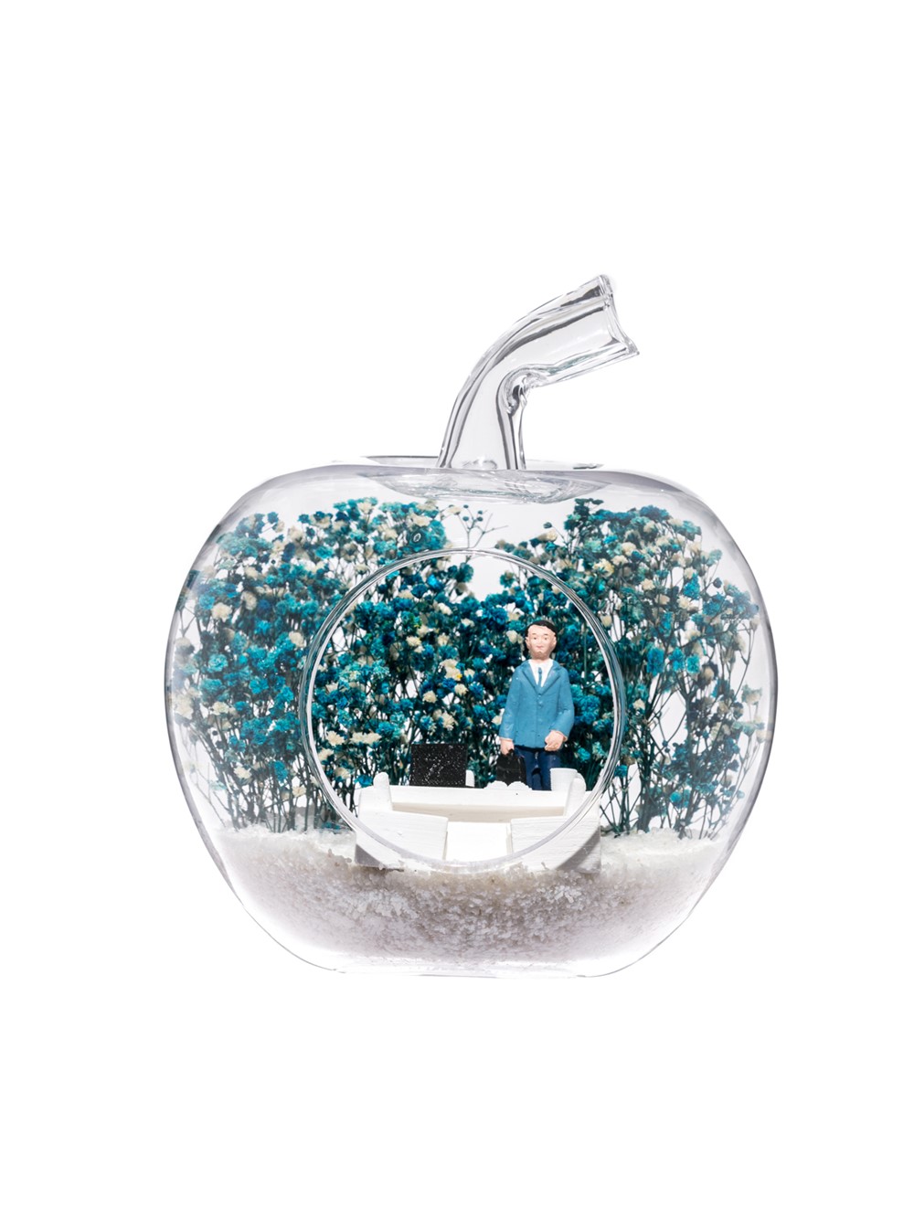 Küçük boy elma cam fanus içerisinde tasarladığımız bu teraryum, yeni işine başlayanları, gördükleri anda mutlu edecek şekilde tasarlandı. Tasarımımız; beyaz kum, kurutulmuş bitkilerle beraber bir adet mini ofis görseli ve bir adet erkek objeyle tamamlanmıştır. Ev ve ofis ortamlarının tamamında sergilenebilir teraryumun içinde, kurutulmuş bitkiler bulunduğundan hava alması önemlidir. Açık olan kısmının kapatılmaması veya büfe vb. kapalı alanlara konulmaması gereklidir. Özellikle her ortamda, zevkle izlenebilecek çok özel bir teraryumdur. Yaklaşık Ölçüleri: 20x20cm NOT: Teraryumlarda kullanılan camlar, üfleme cam işçiliğiyle üretildiğinden bazı detaylarda farklılıklar gözlenebilir. Örneğin, sap kısmı ve ağız bitiş noktalarının her biri kendine özgüdür.