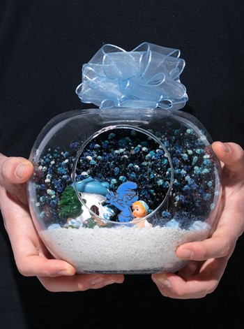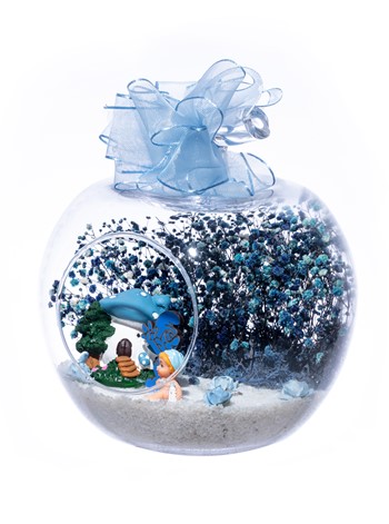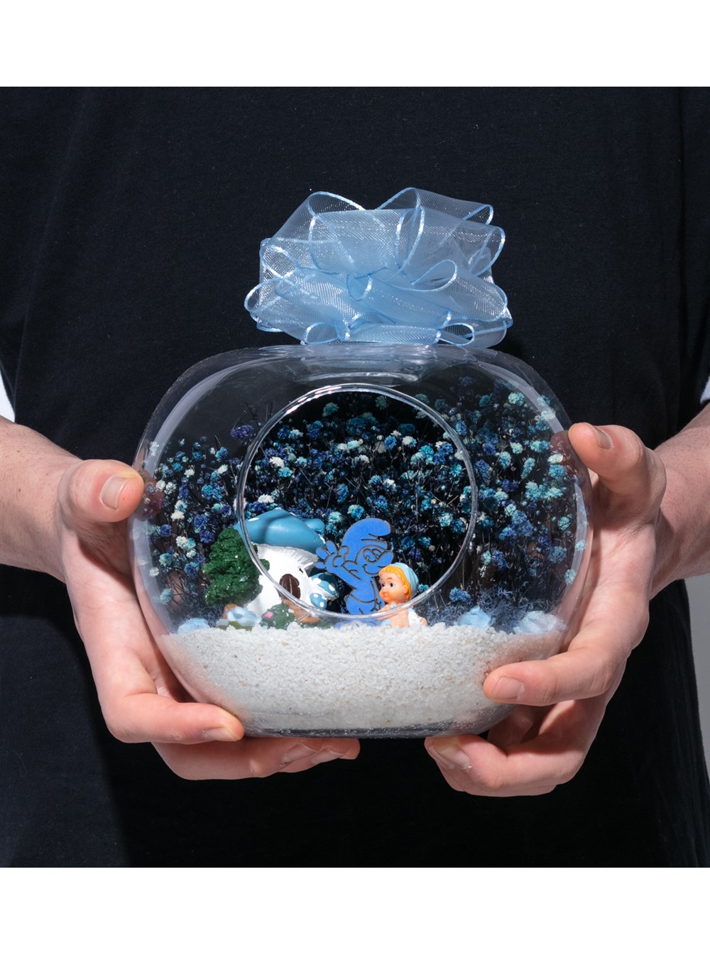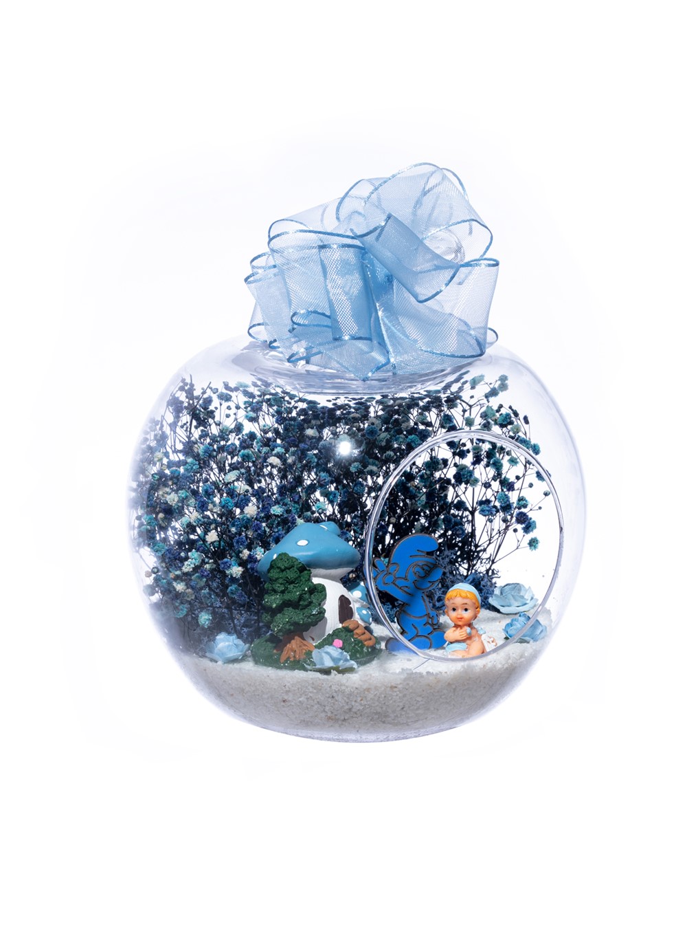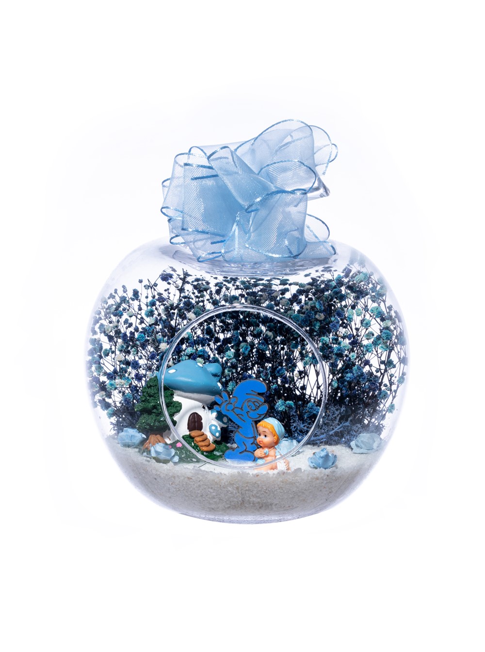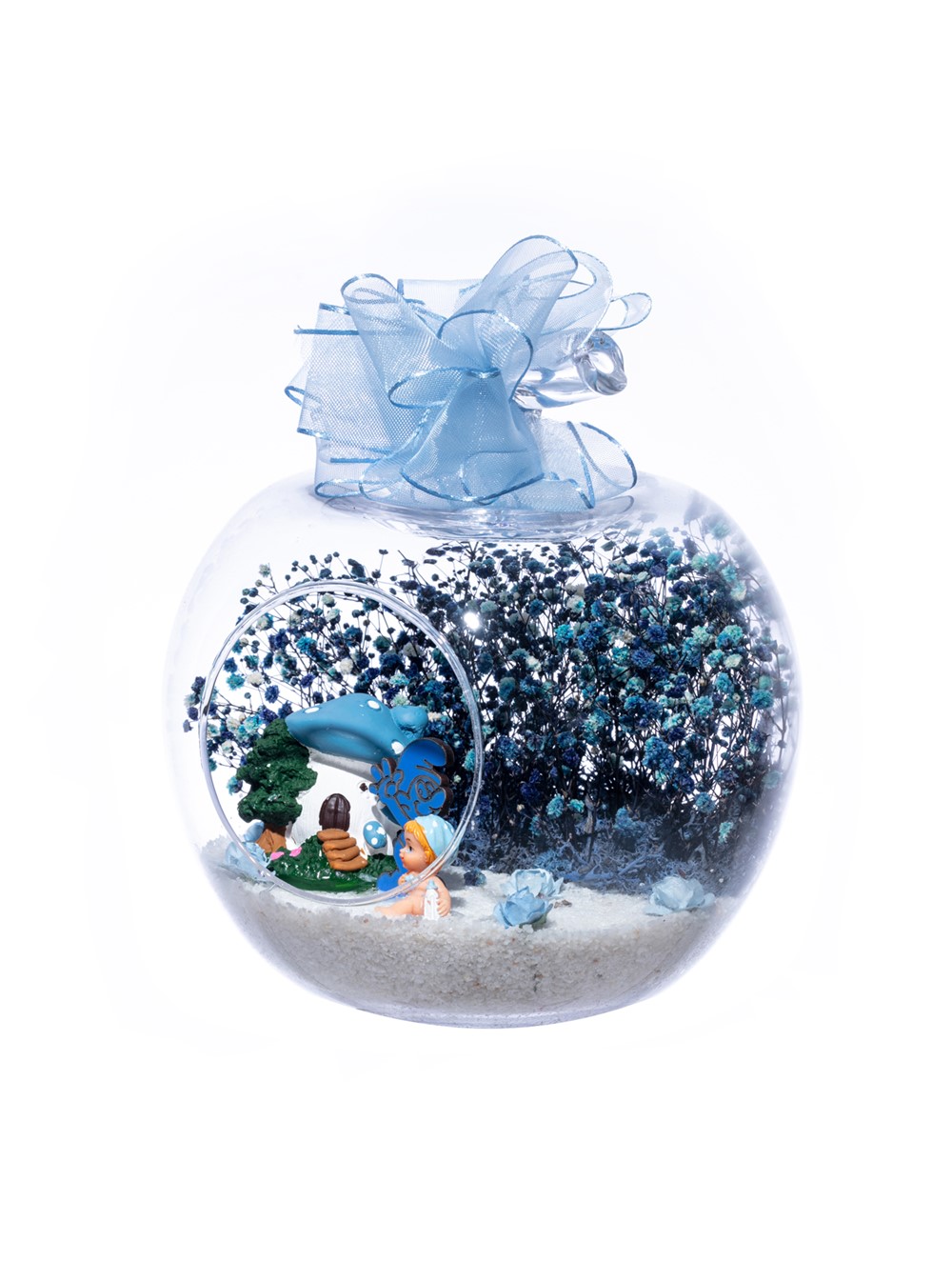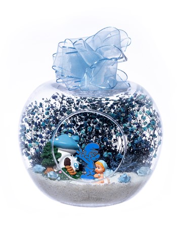 Üzerinde şık kurdelesiyle küçük boy elma cam fanus içerisinde tasarladığımız bu çok güzel teraryum; beyaz kum, şoklanmış yosunlar, kurutulmuş bitkiler, yapay güller, bir adet mantar ev, bir adet Şirin karakteri obje ve bir adet erkek bebek obje kullanılarak tamamlanmıştır. Ev ve ofis ortamlarının tamamında sergilenebilir teraryumun içinde, kurutulmuş ve şoklanmış bitkiler bulunduğundan hava alması önemlidir. Açık olan kısmının kapatılmaması veya büfe vb. kapalı alanlara konulmaması gereklidir. Özellikle her ortamda yıllarca, zevkle izlenebilecek özel bir teraryumdur. Yaklaşık Ölçüleri: 20x20cm NOT: Teraryumlarda kullanılan camlar, üfleme cam işçiliğiyle üretildiğinden bazı detaylarda farklılıklar gözlenebilir. Örneğin, sap kısmı ve ağız bitiş noktalarının her biri kendine özgüdür.